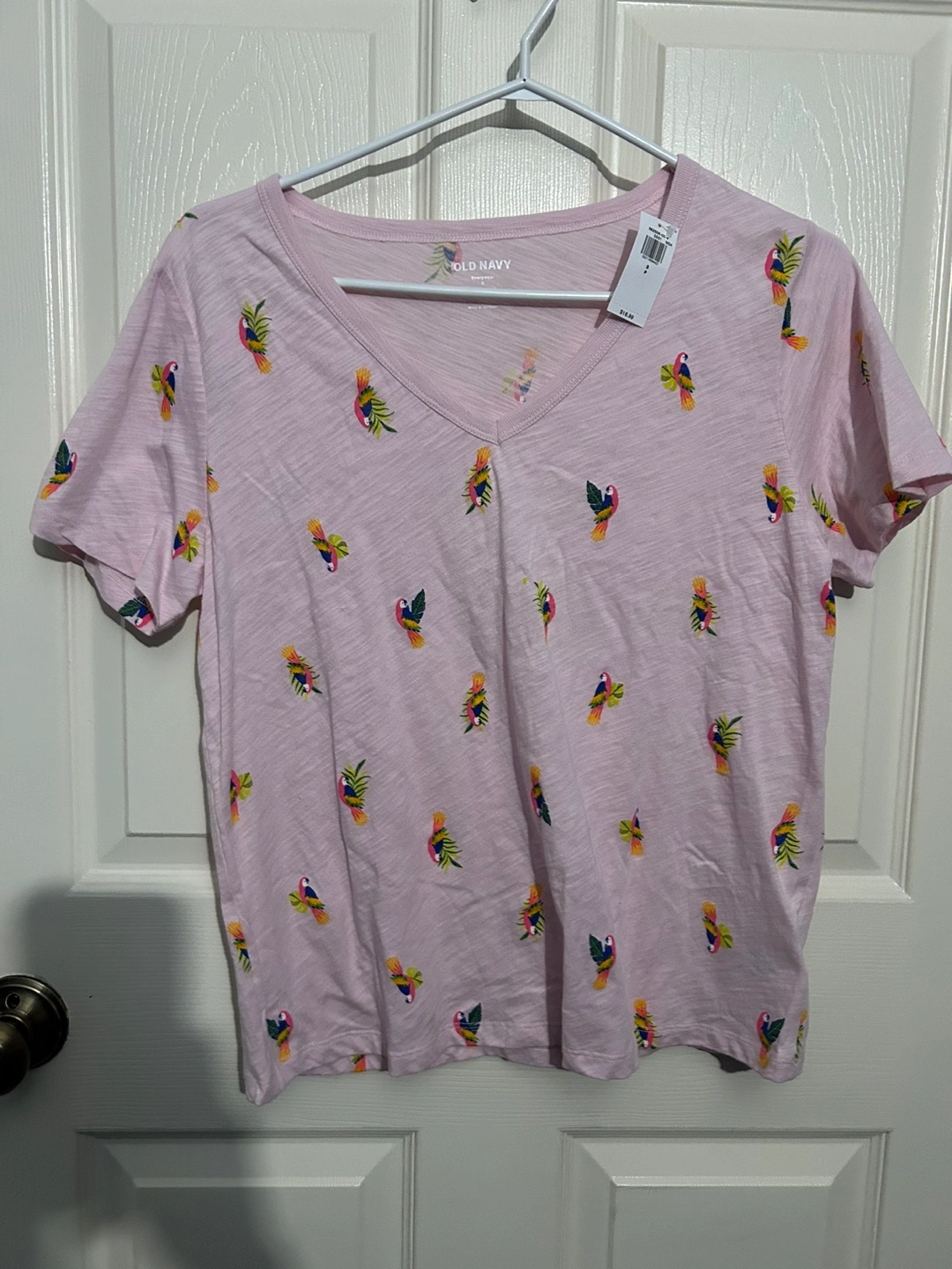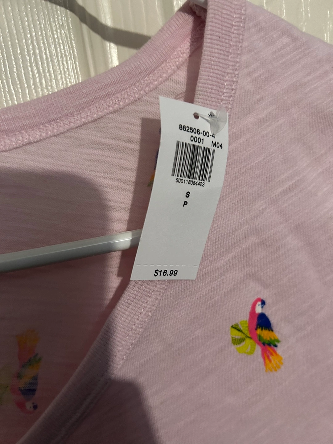 Pink short sleeve T-shirt with a parrot print. V-neck and size small. New with tags Paid 20$ with tax Asking 10$