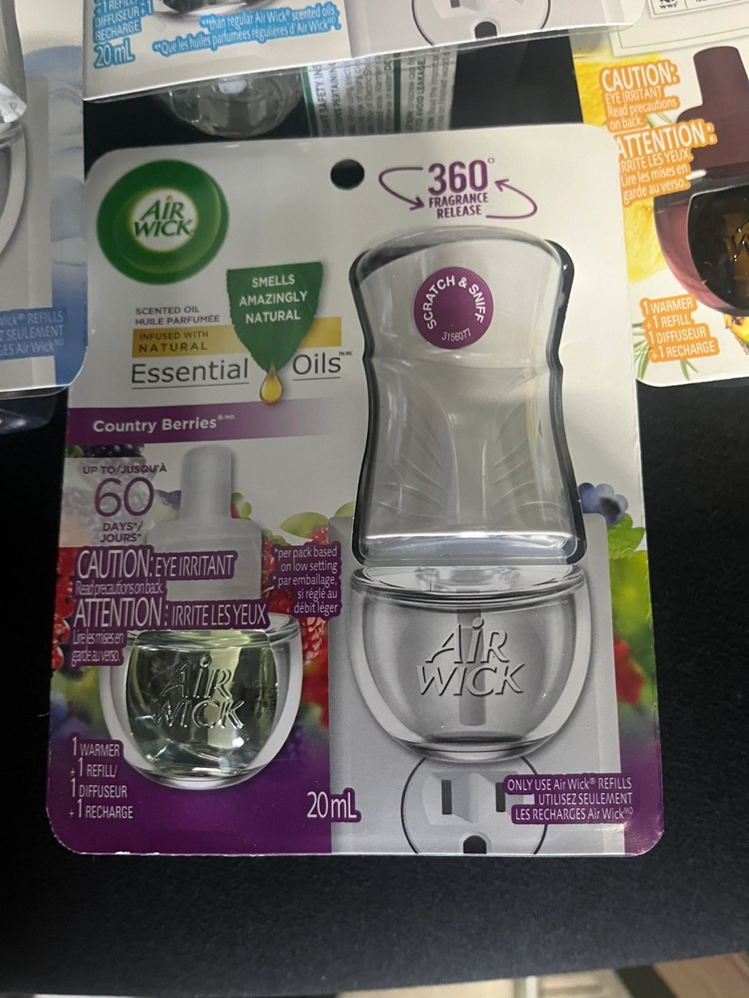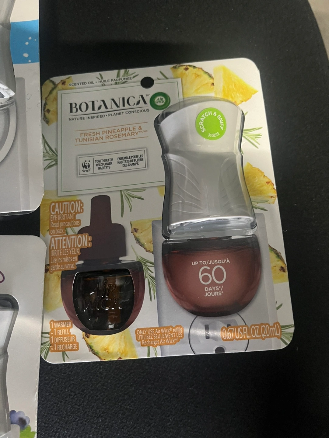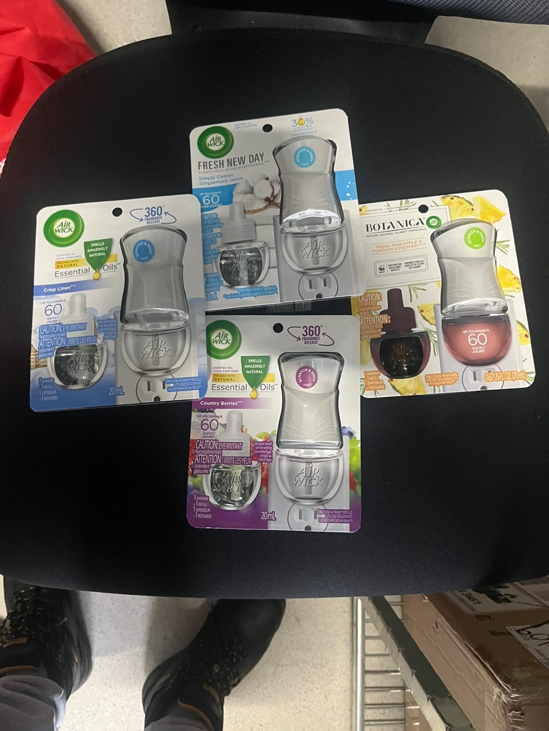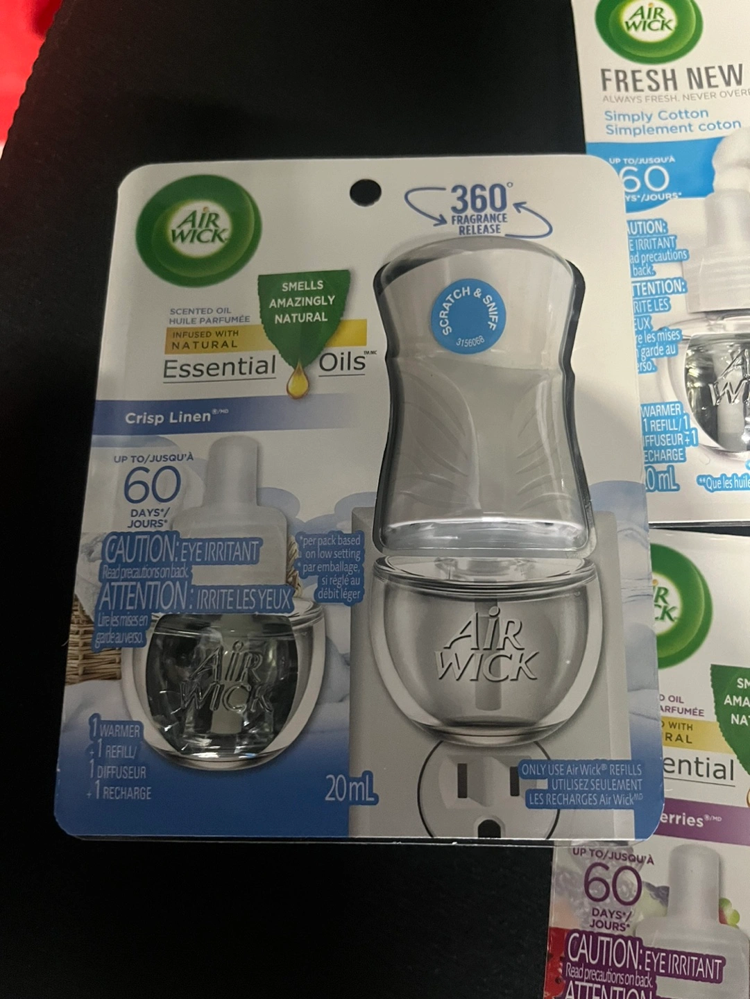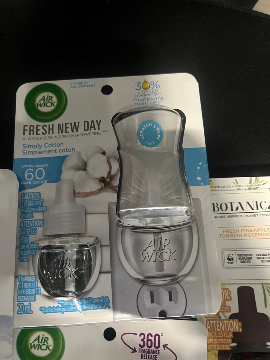 Four different Air Wick Scented Oil Plug-Ins, all in the 20 ml size. Includes Fresh New Day Simply Cotton, Crisp Linen, Botanica Fresh Pineapple and Tunisian Rosemary, and Country Berries. Make an offer need gone