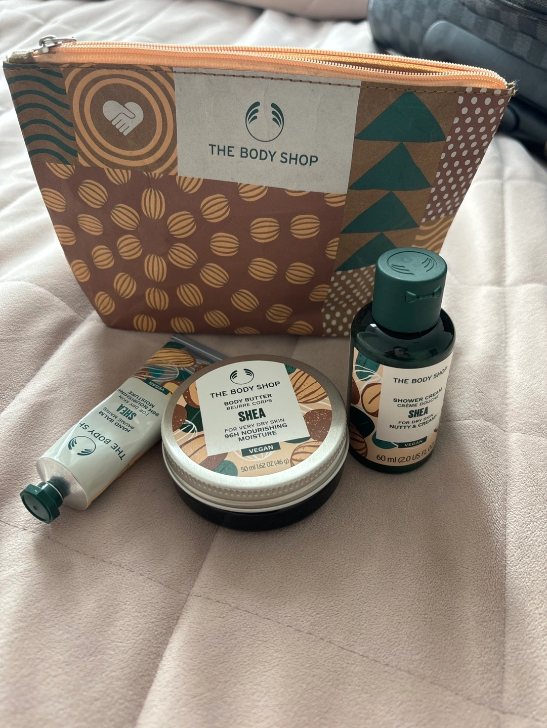The Body Shop Shea Travel Set includes body butter, hand balm, and shower cream. All items are vegan and designed for dry skin.