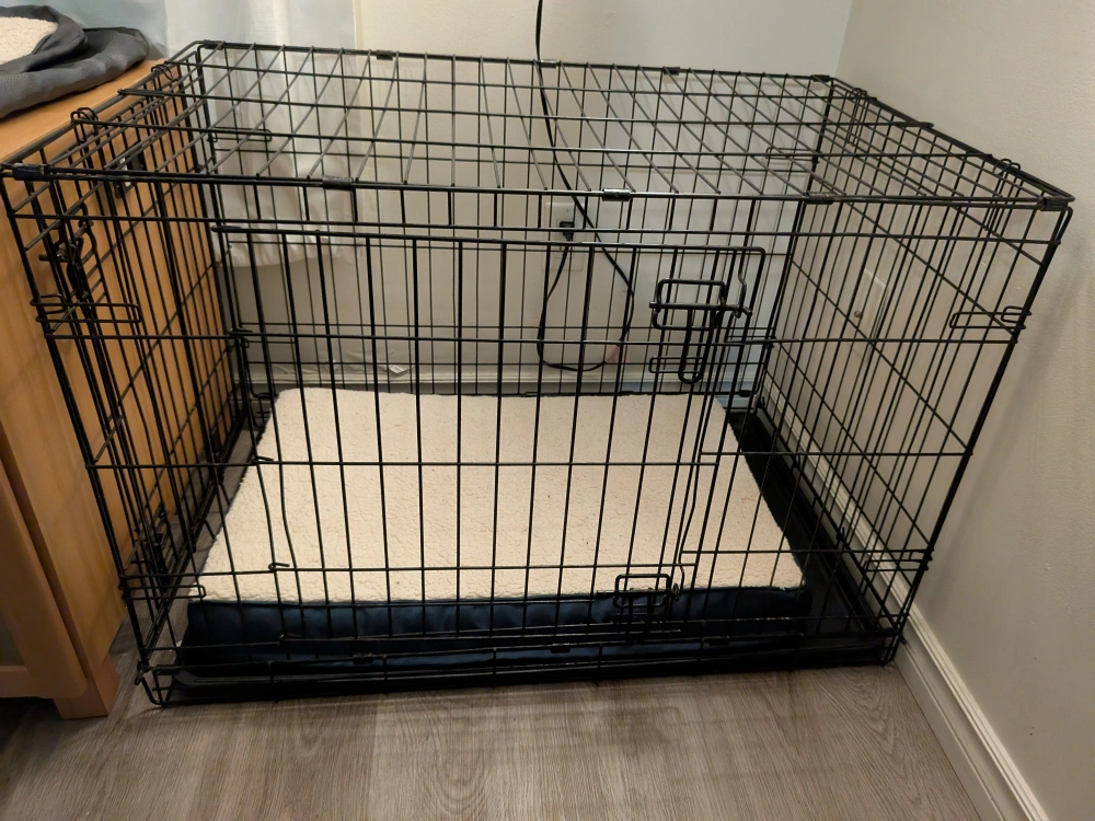 Black metal medium/large dog crate with a removable tray and dog bed. Has 2 doors and comes with an extra cover for the bed 22.5" W x 35.5" L x 24" H