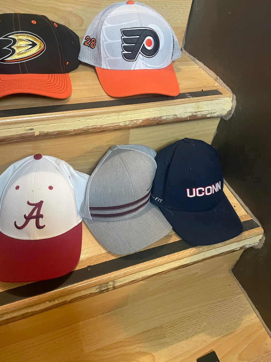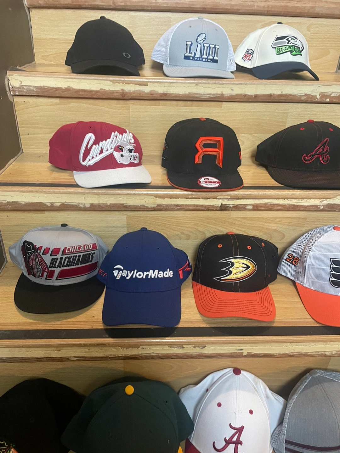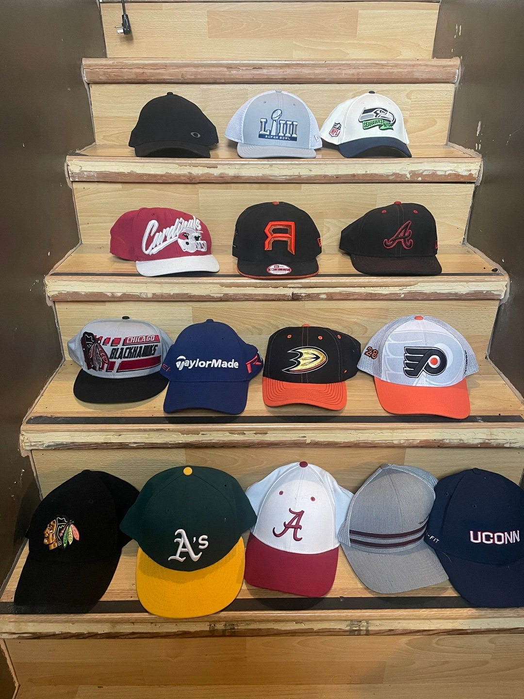 Collection of 14 hats. Mostly baseball and hockey teams, one golf hat, one UCONN hat. Some are newer, some are vintage. Black Chicago BlackHawks -: Strapback A’s Fitted Size 7 5/8 Bew Era White and Red Atlanta Nike Fitted M/l Uconn By Nike Fitted flyera by Reebok Strapback Anaheim Ducks Zephyr Snapback Taylor Made Fitted Large to XL Gray and Black blackhawks Snapback New Era Black Ata ta Braves Fitted Size 71/4 Roar BC Likns Strapback Cardinals mitchell and neas Snapback Seahawks Fitted M/l Superbowl Snapaback Oakley Fitted Medium to Large 20$ each or 3 for 30$ All 100$