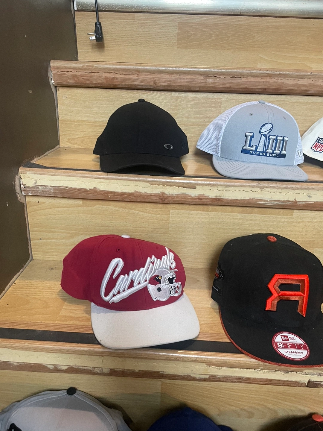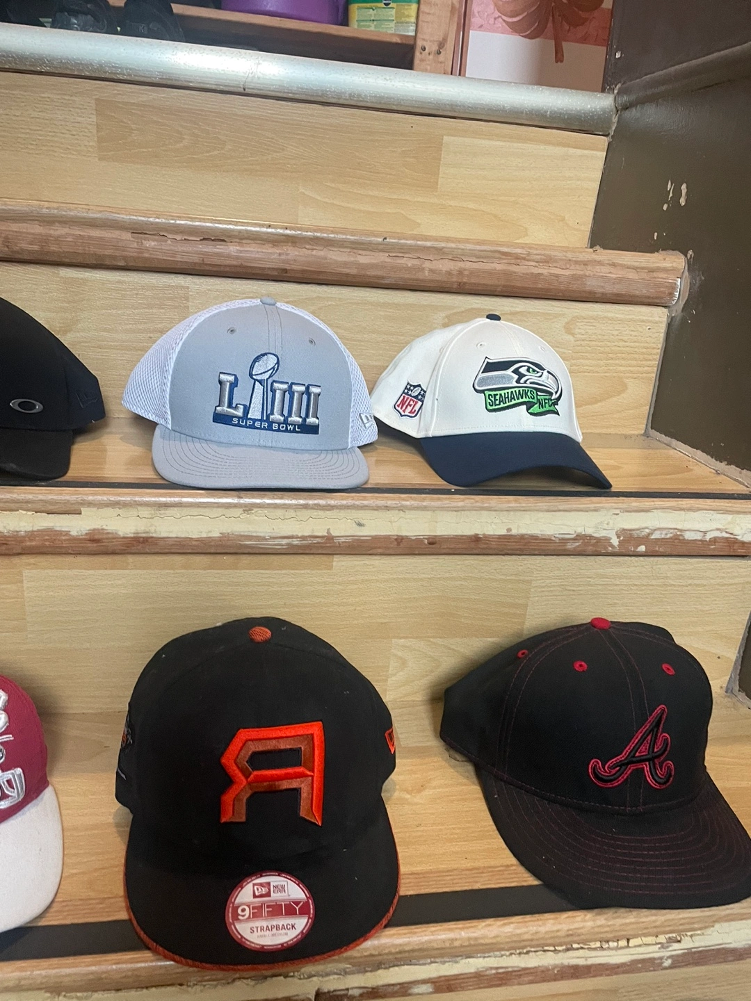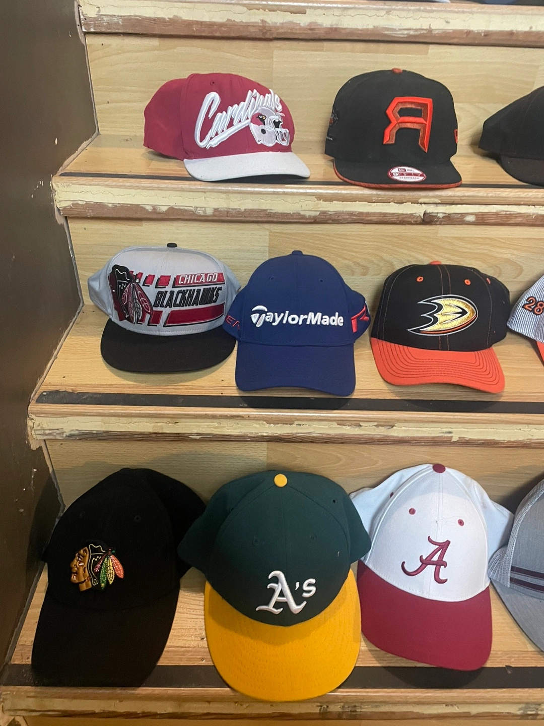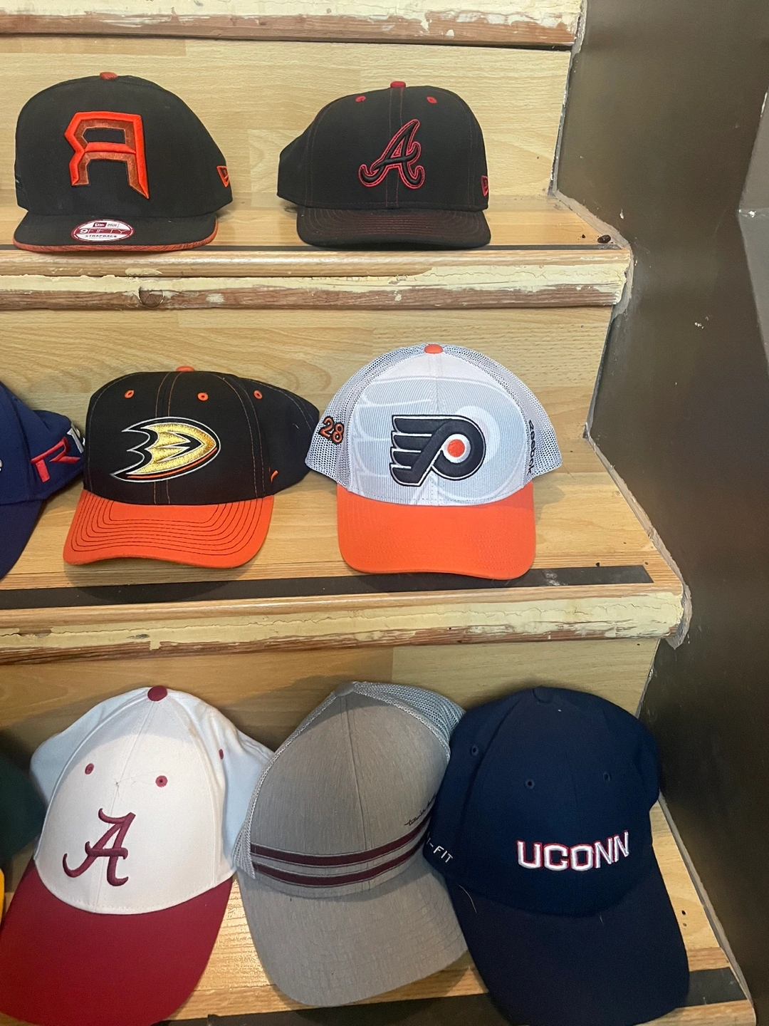 Collection of 14 hats. Mostly baseball and hockey teams, one golf hat, one UCONN hat. Some are newer, some are vintage. Black Chicago BlackHawks -: Strapback A’s Fitted Size 7 5/8 Bew Era White and Red Atlanta Nike Fitted M/l Uconn By Nike Fitted flyera by Reebok Strapback Anaheim Ducks Zephyr Snapback Taylor Made Fitted Large to XL Gray and Black blackhawks Snapback New Era Black Ata ta Braves Fitted Size 71/4 Roar BC Likns Strapback Cardinals mitchell and neas Snapback Seahawks Fitted M/l Superbowl Snapaback Oakley Fitted Medium to Large 20$ each or 3 for 30$ All 100$