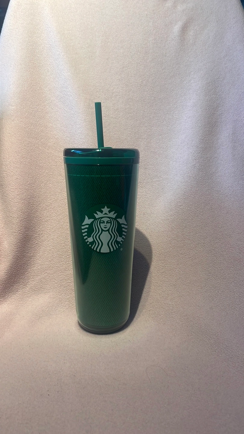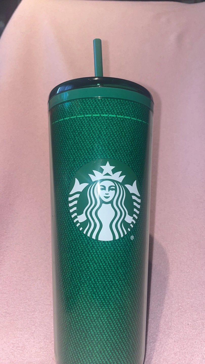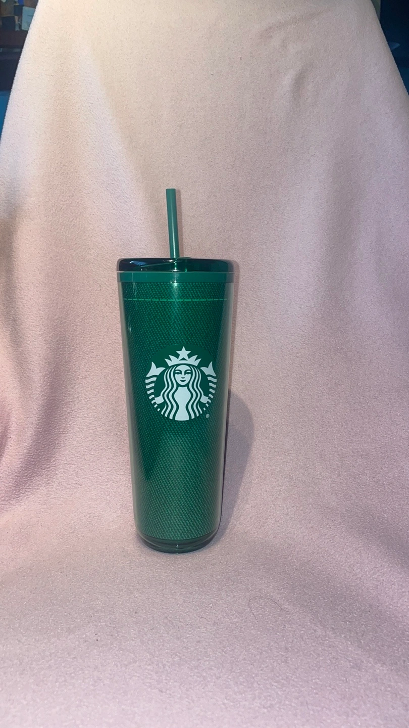 Green Starbucks tumbler with a straw. It features a textured green design.
