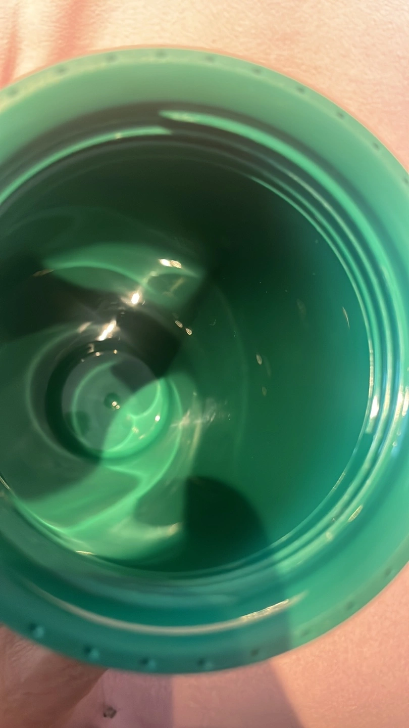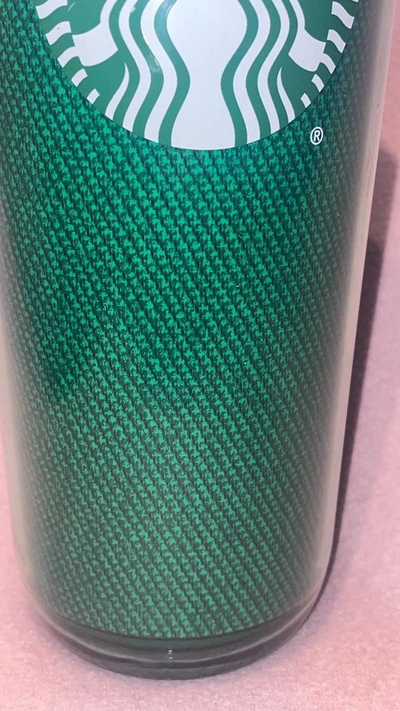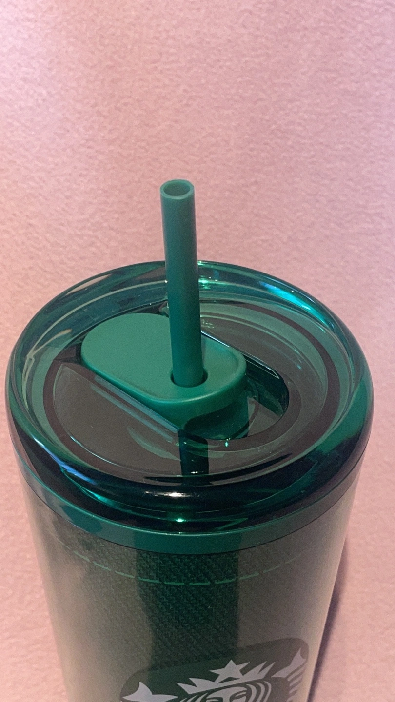 Green Starbucks tumbler with a straw. It features a textured green design.