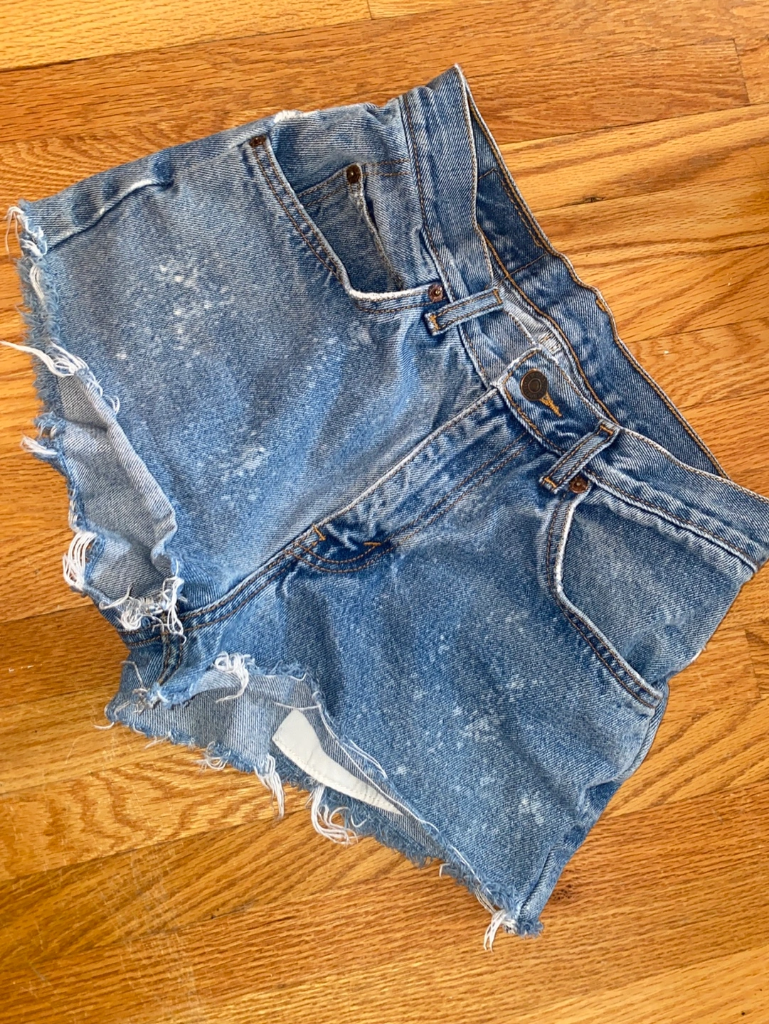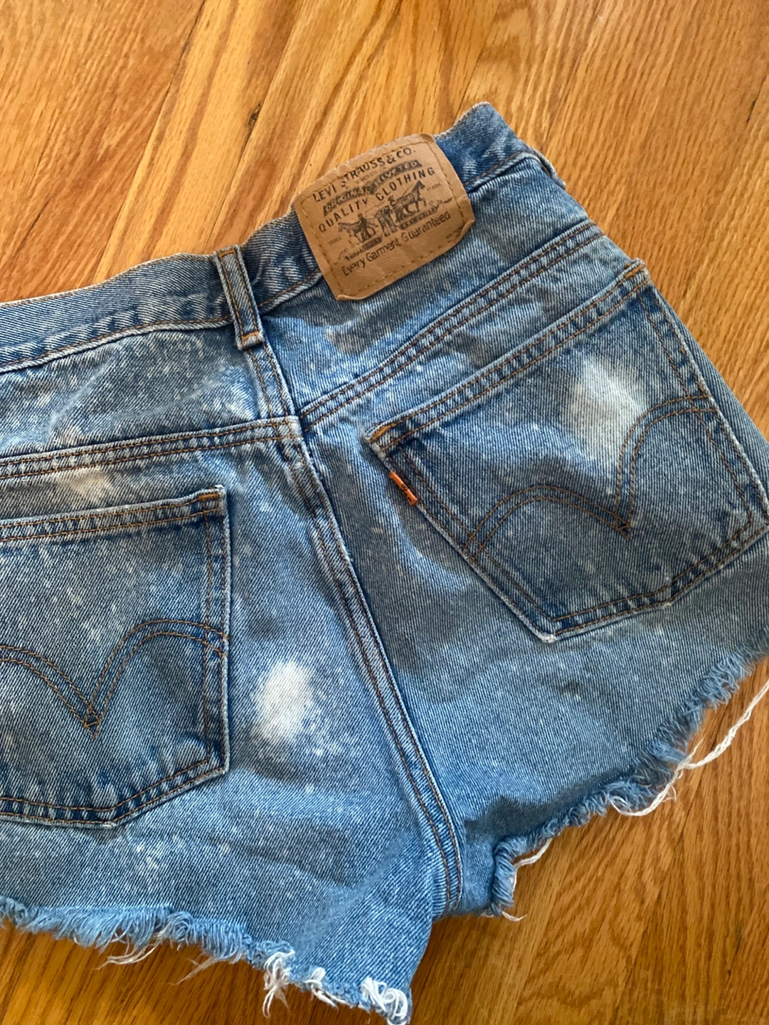 Light wash denim Levi shorts with distressing and a frayed hem. Size 24