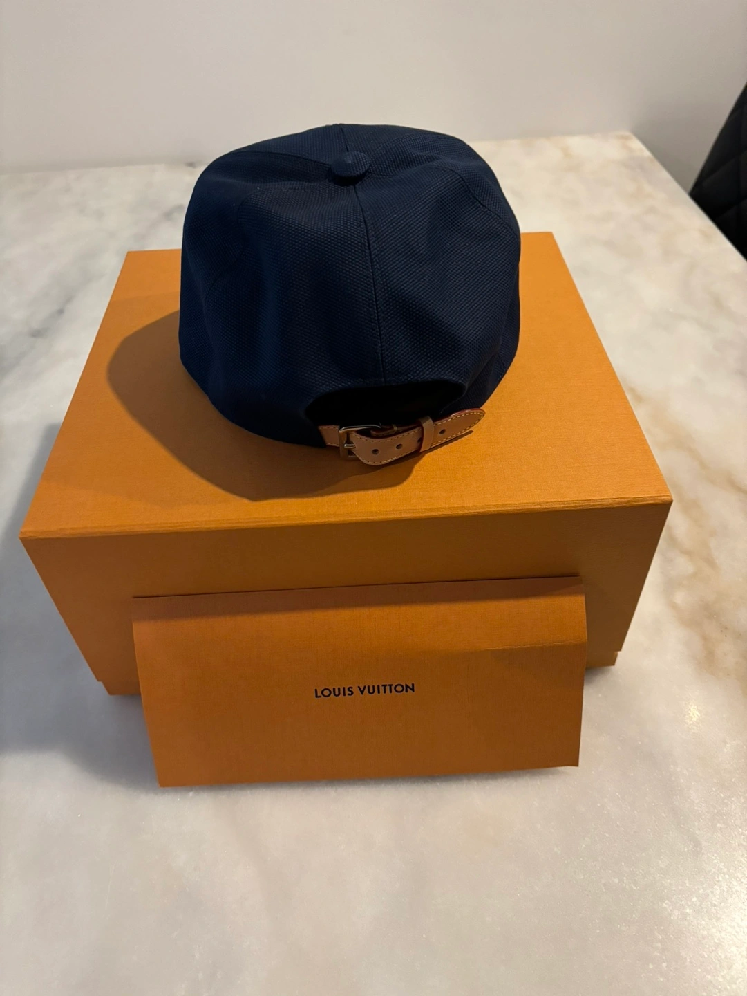 Blue baseball cap with a leather strap and Louis Vuitton logo. Comes with original box and gift receipt.