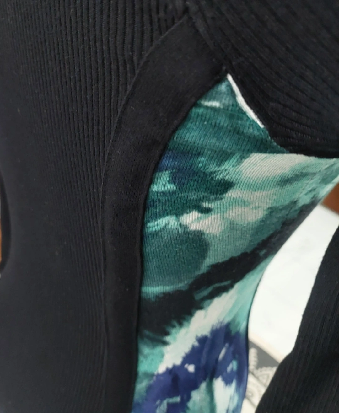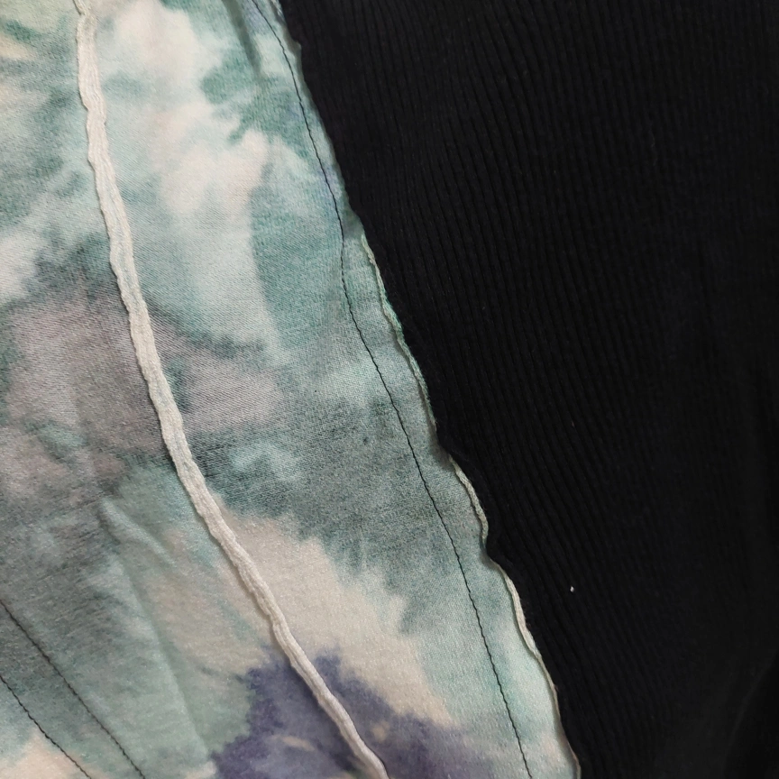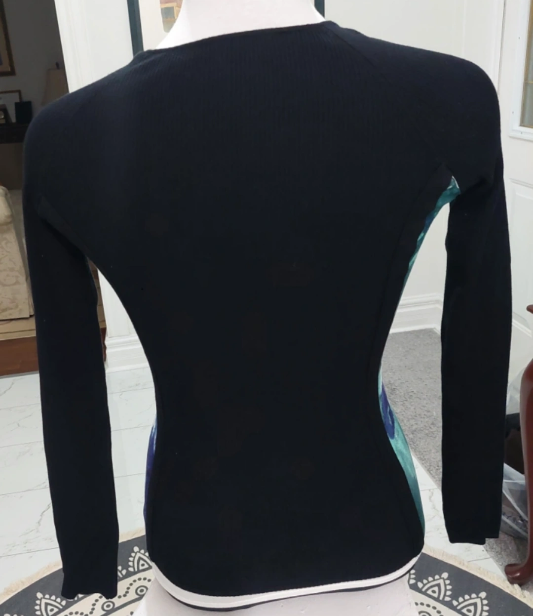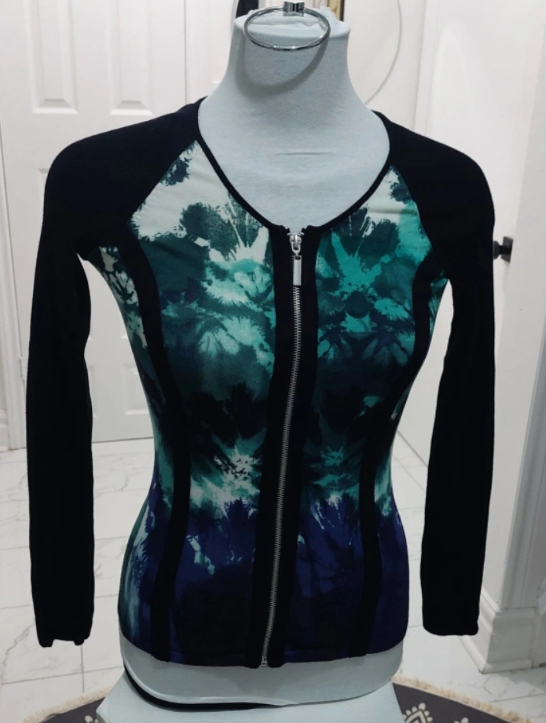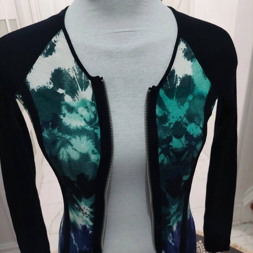 Long sleeve sweater with zipper closure. Black with floral design on the front and sides. Stretched ribbed on the back. In great condition. No damage. Recently washed.