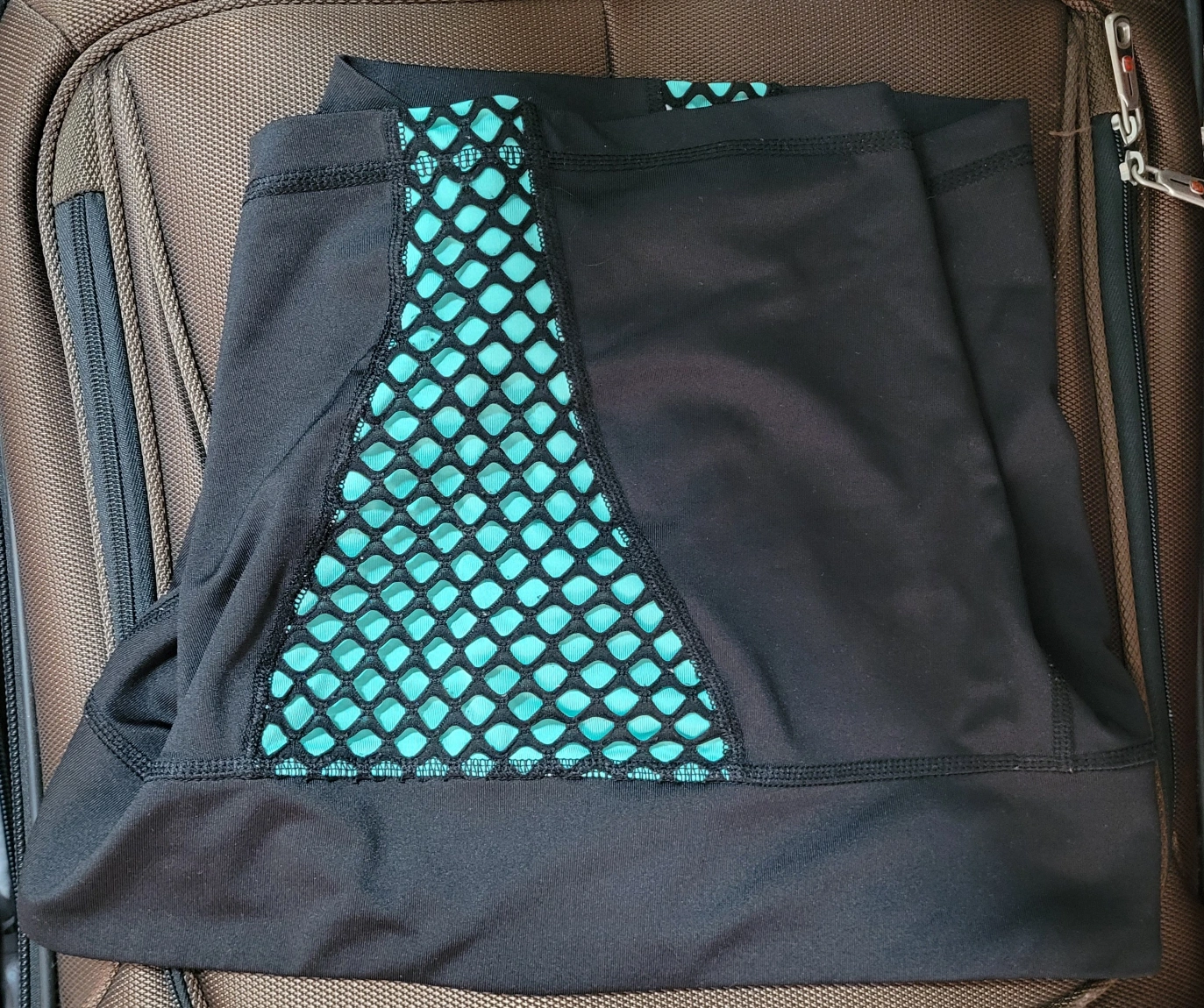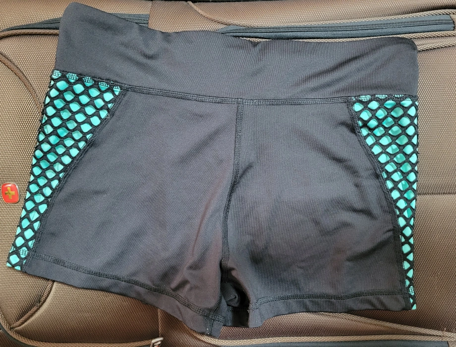 Black workout shorts with turquoise mesh panels. Size L/8. Cash only Pick up only