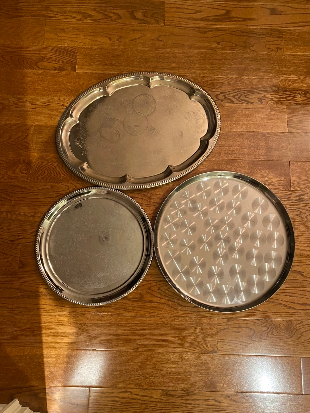 Set of 3 serving trays. 1 oval tray and 2 round trays. One round tray has a textured bottom. $5.00 for all 3