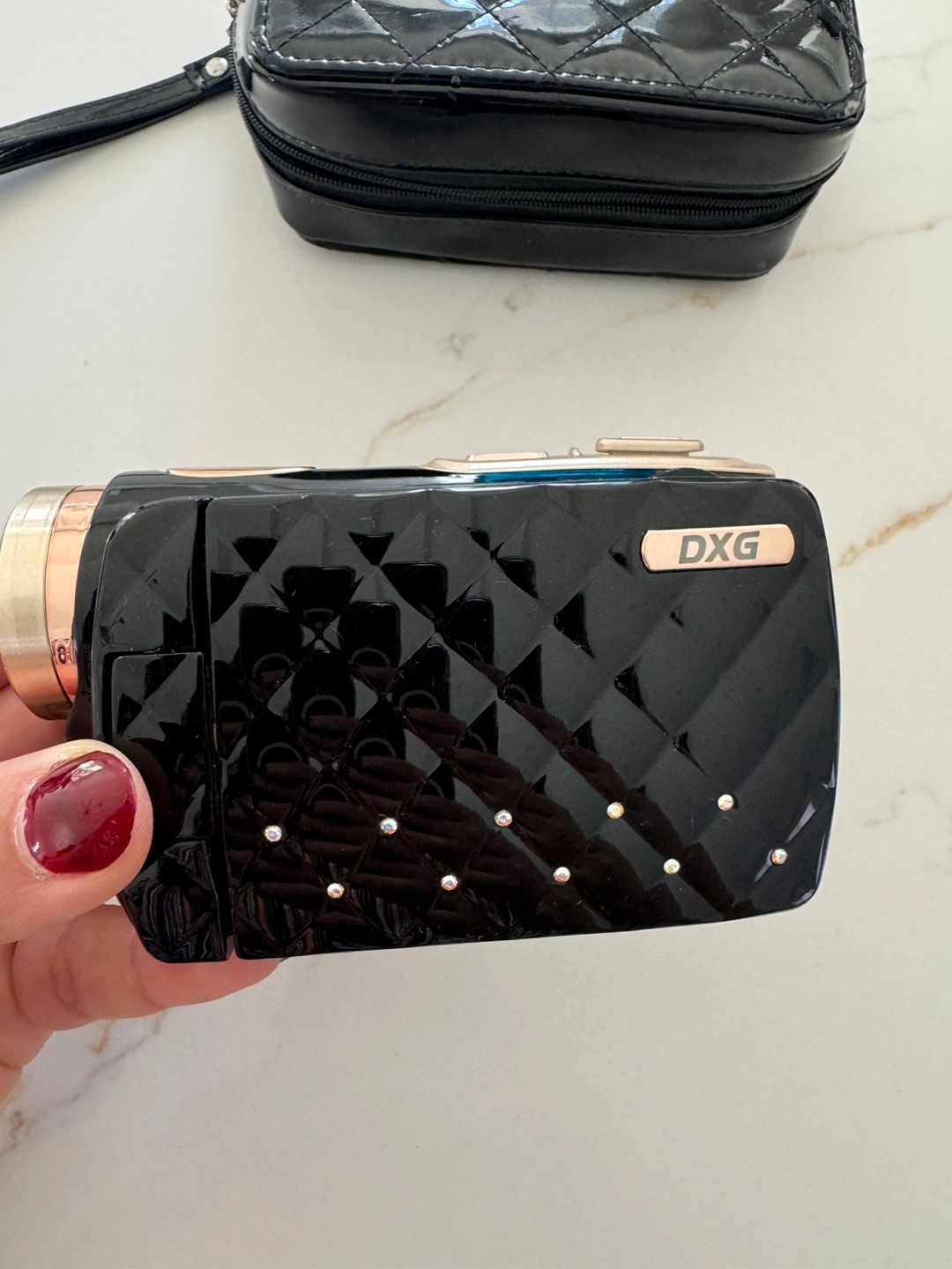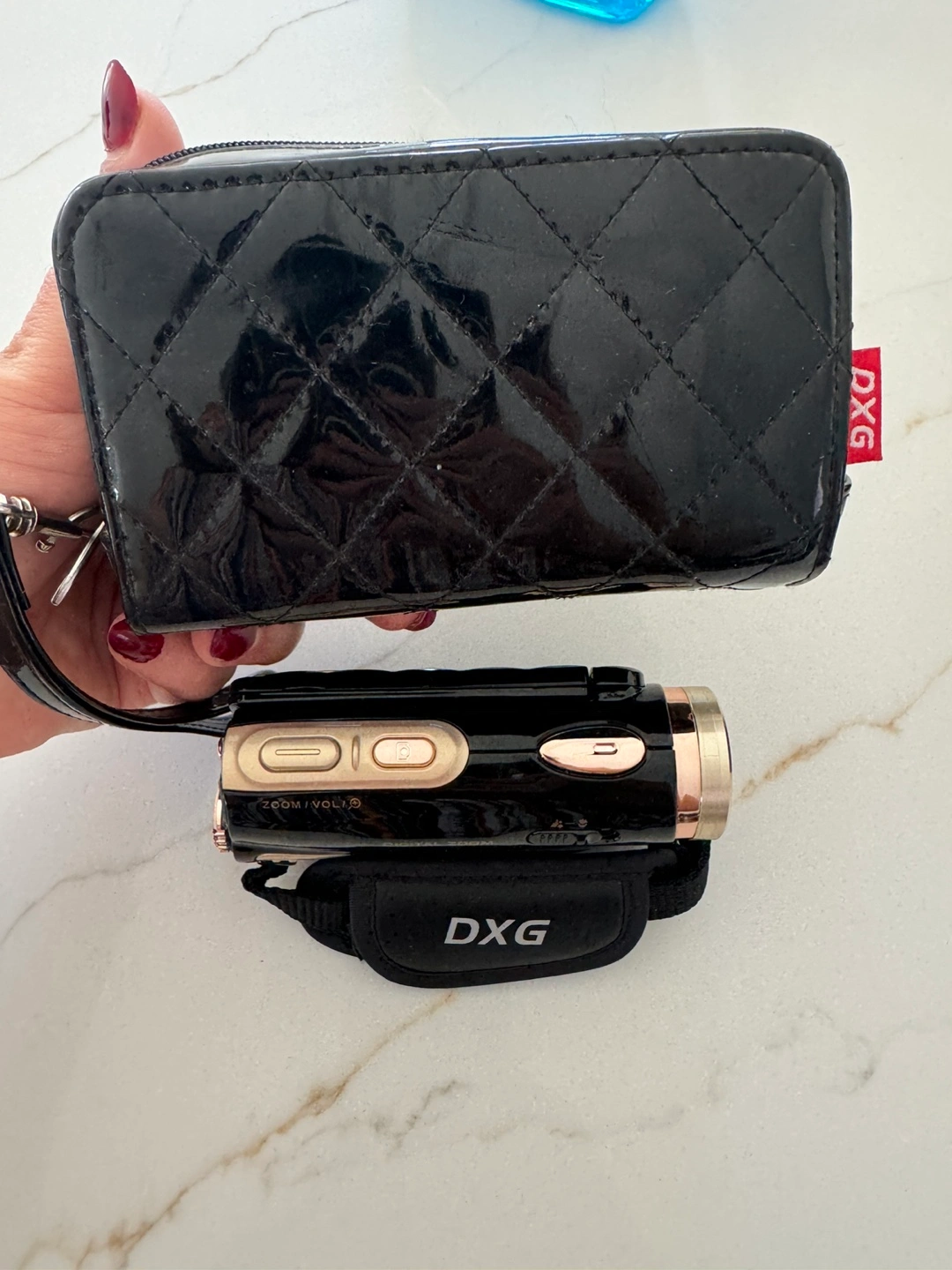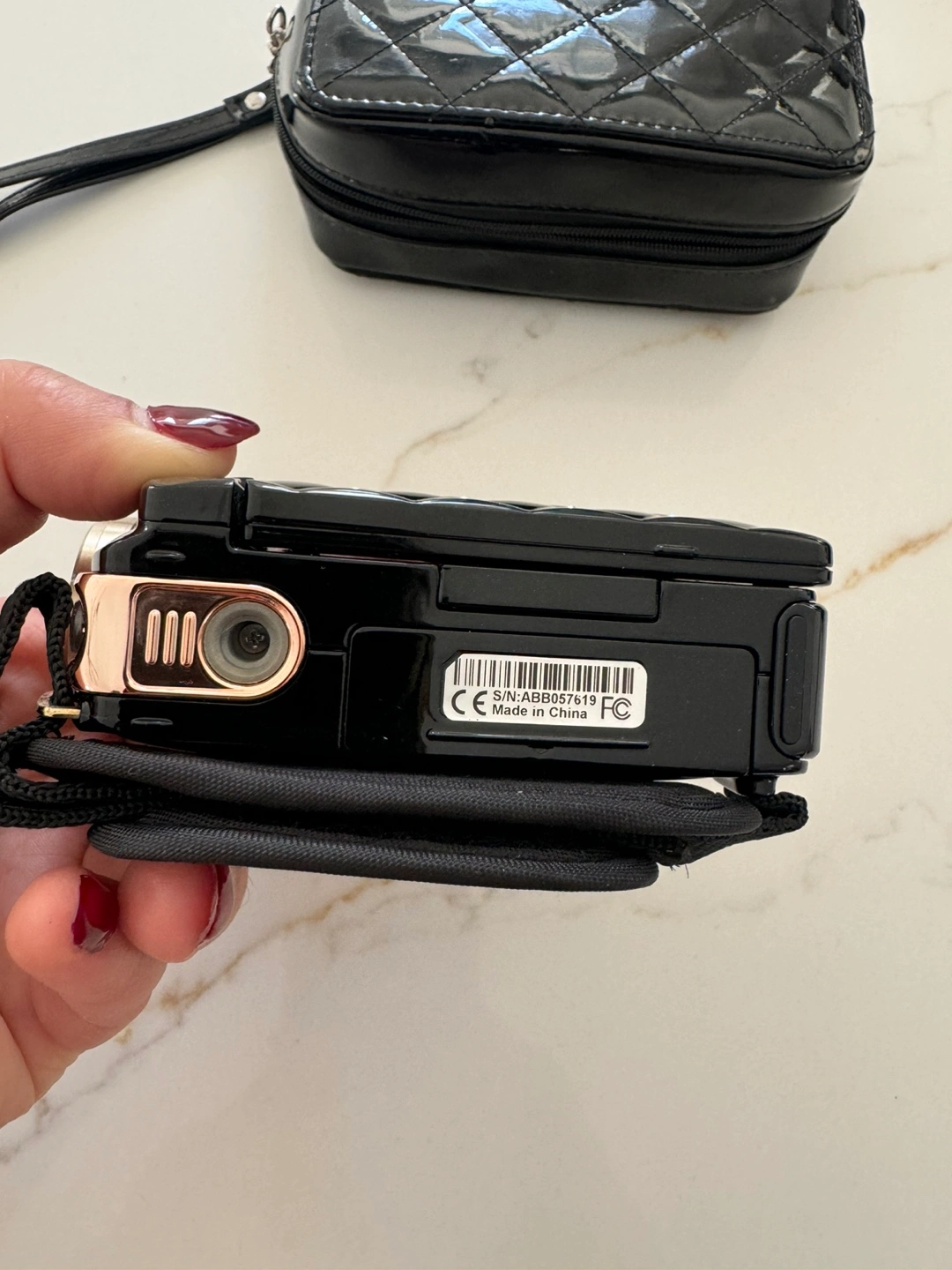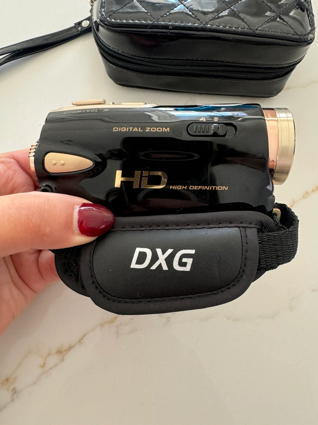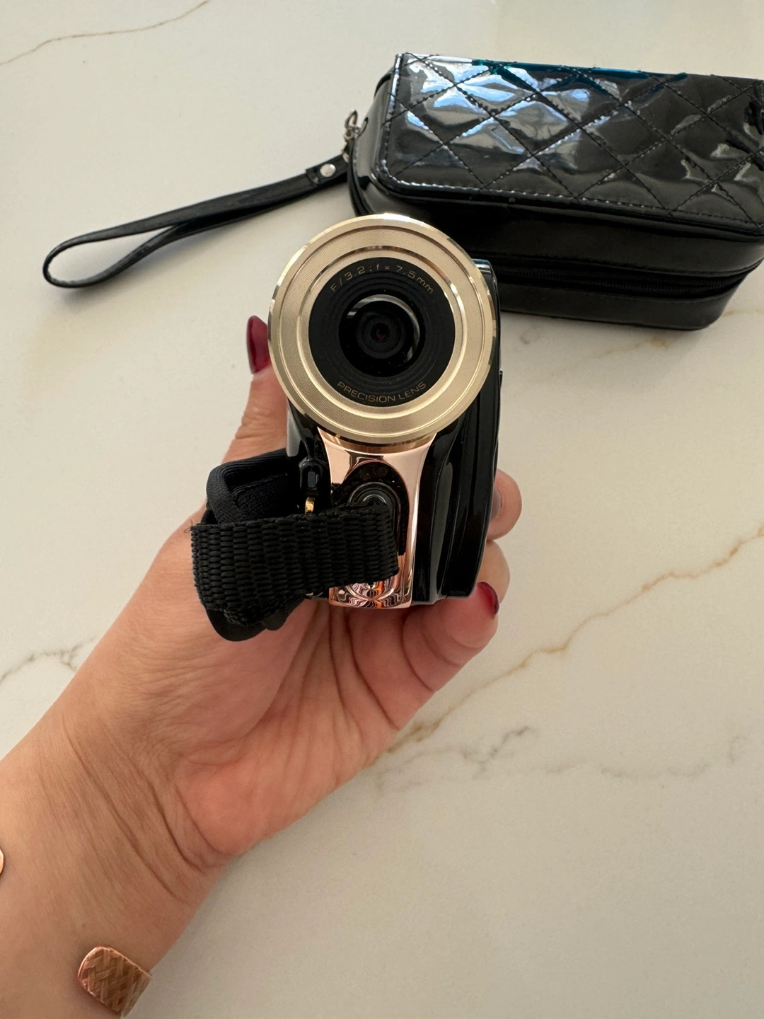 Black and gold HD camcorder with a carrying case. Digital zoom.