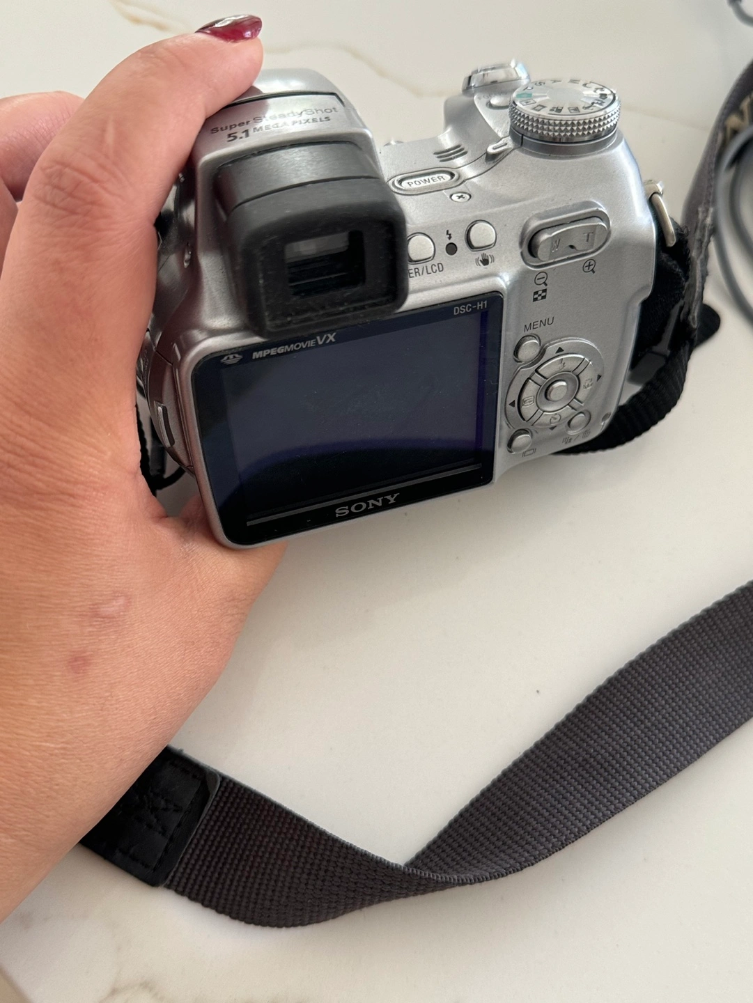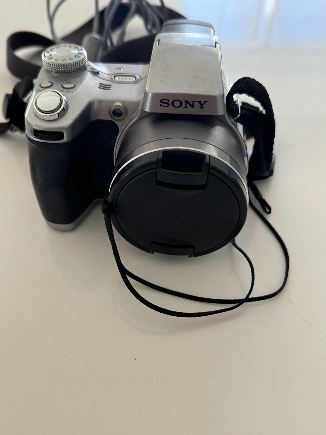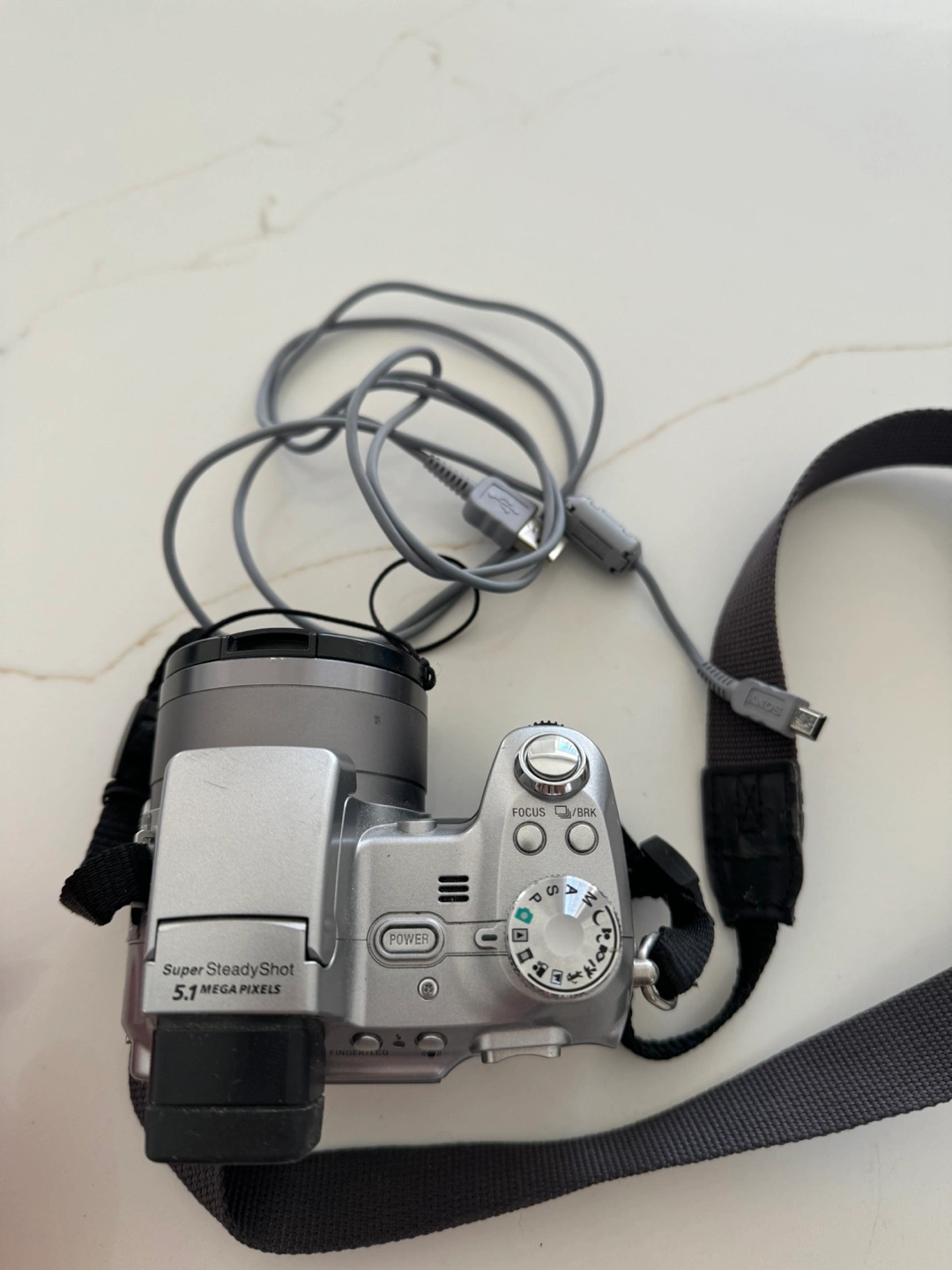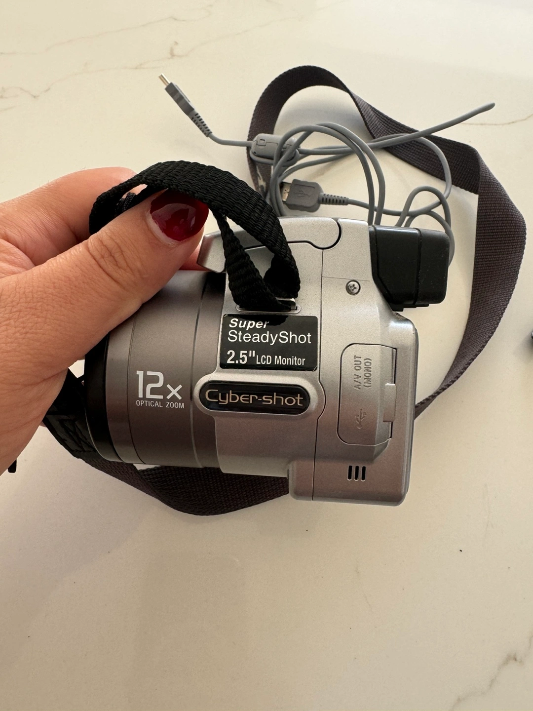 Digital camera with 12x optical zoom, Super SteadyShot, 5.1 megapixels, and 2.5" LCD monitor. Includes strap, USB cable, and A/V cable.