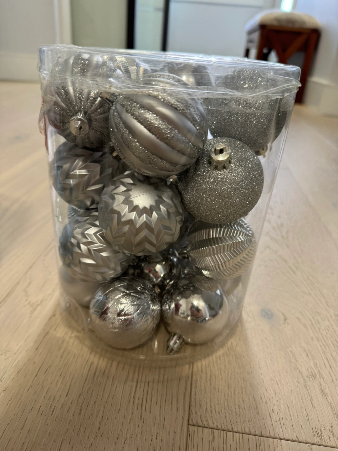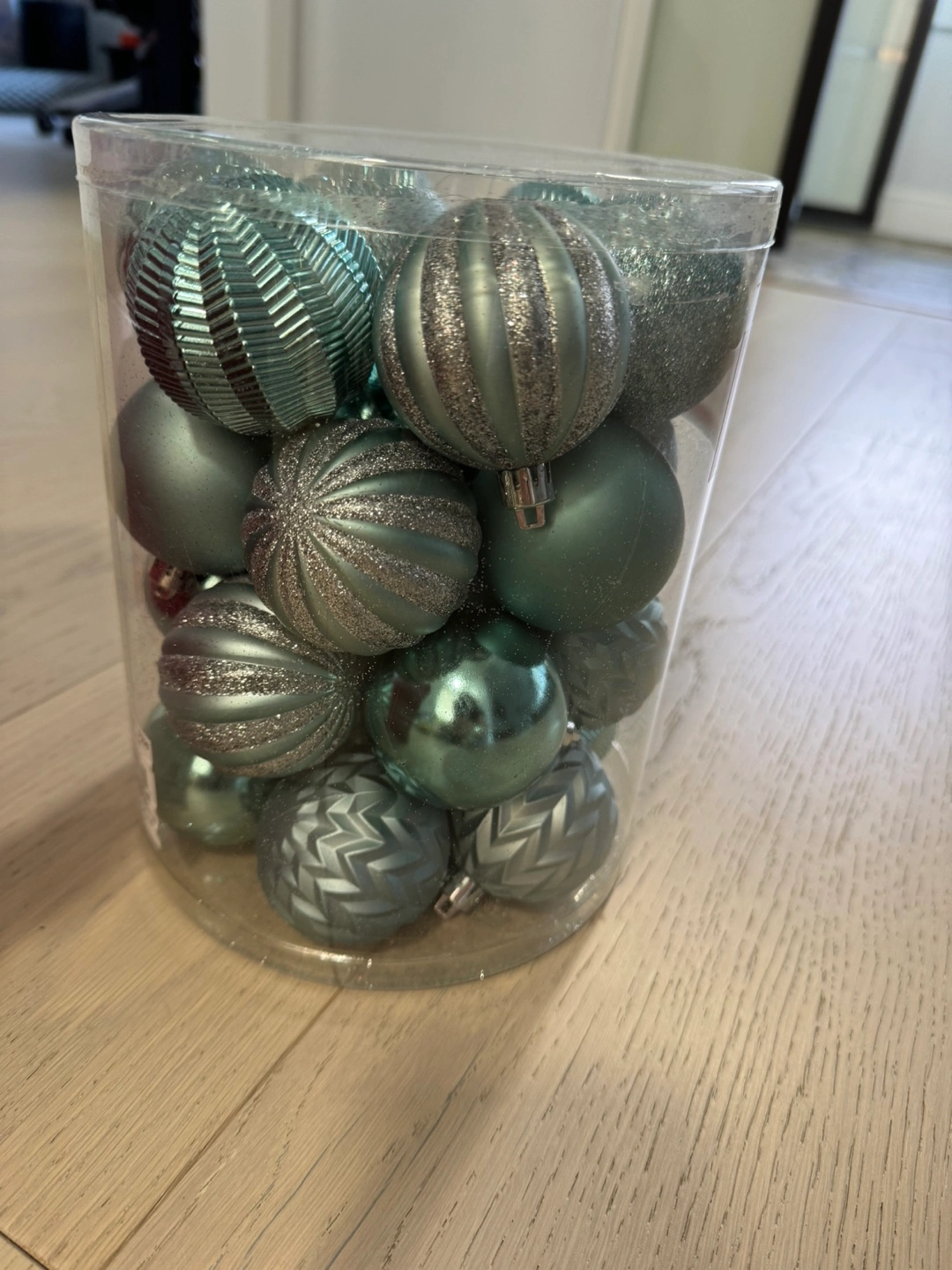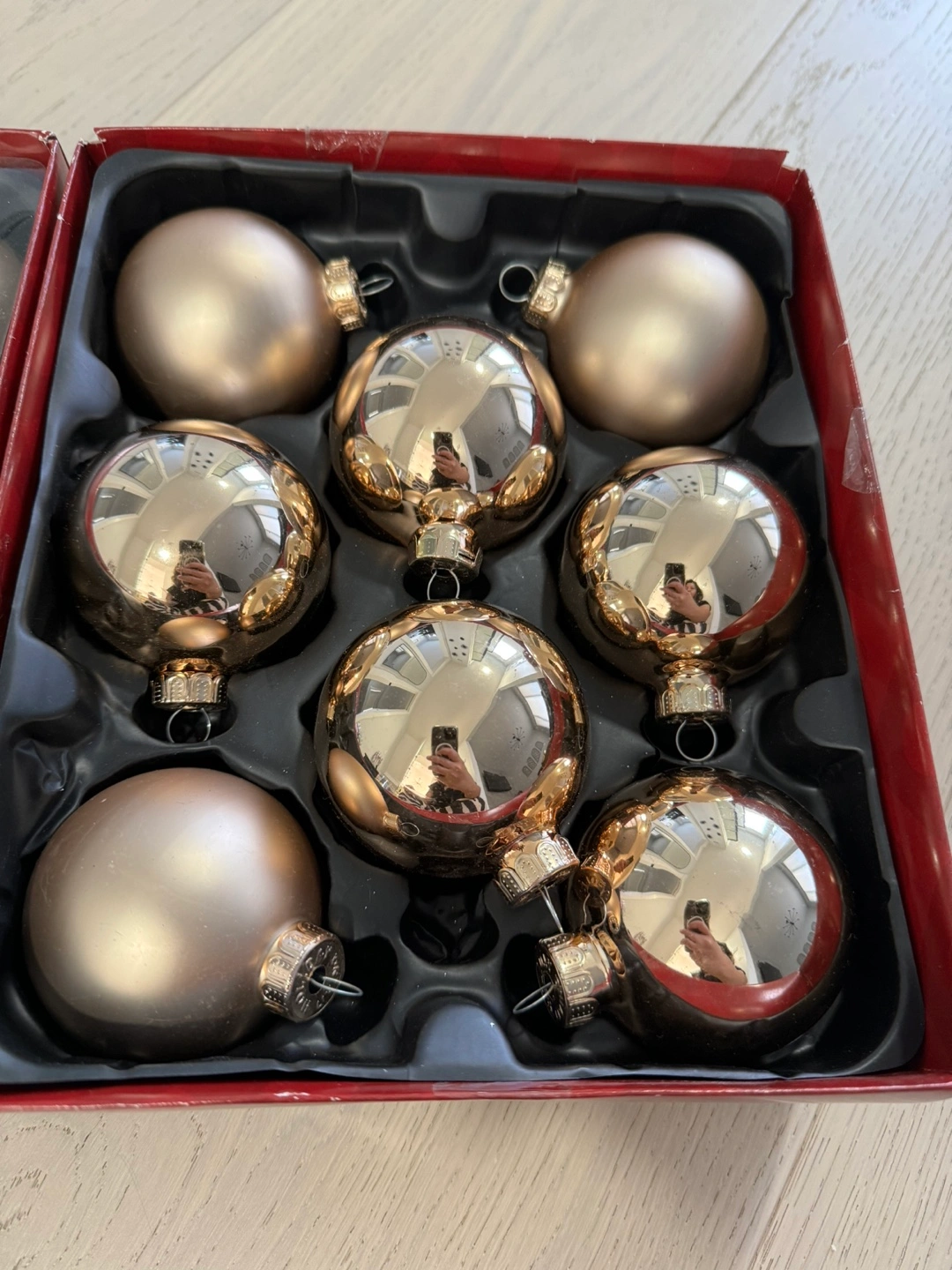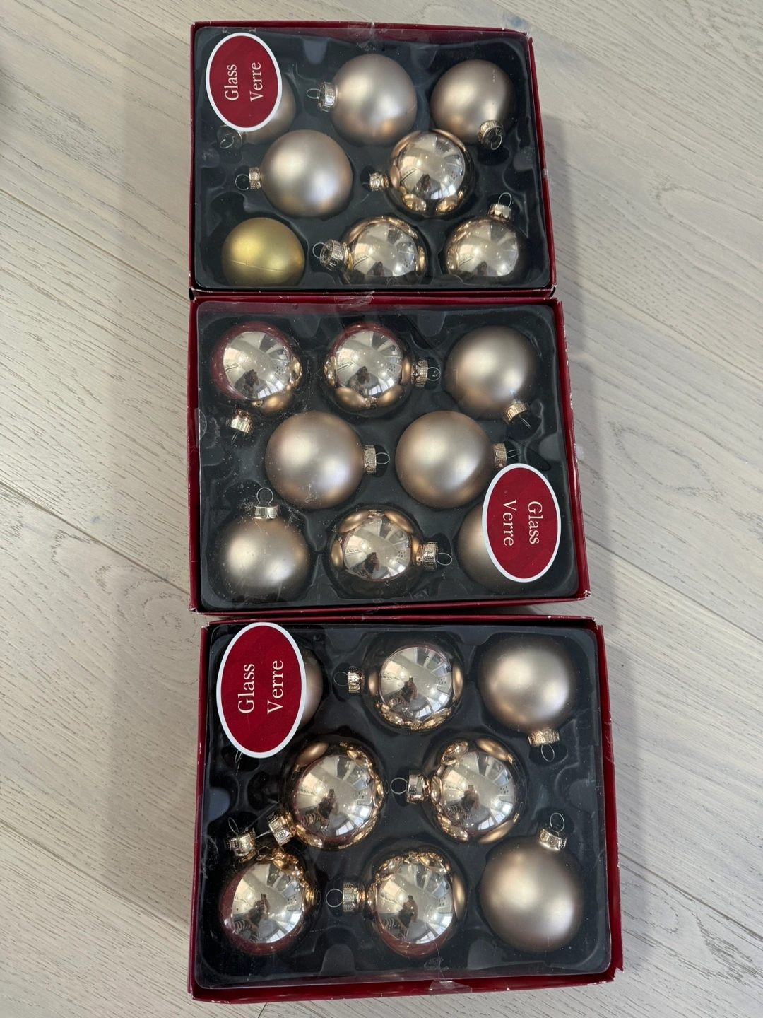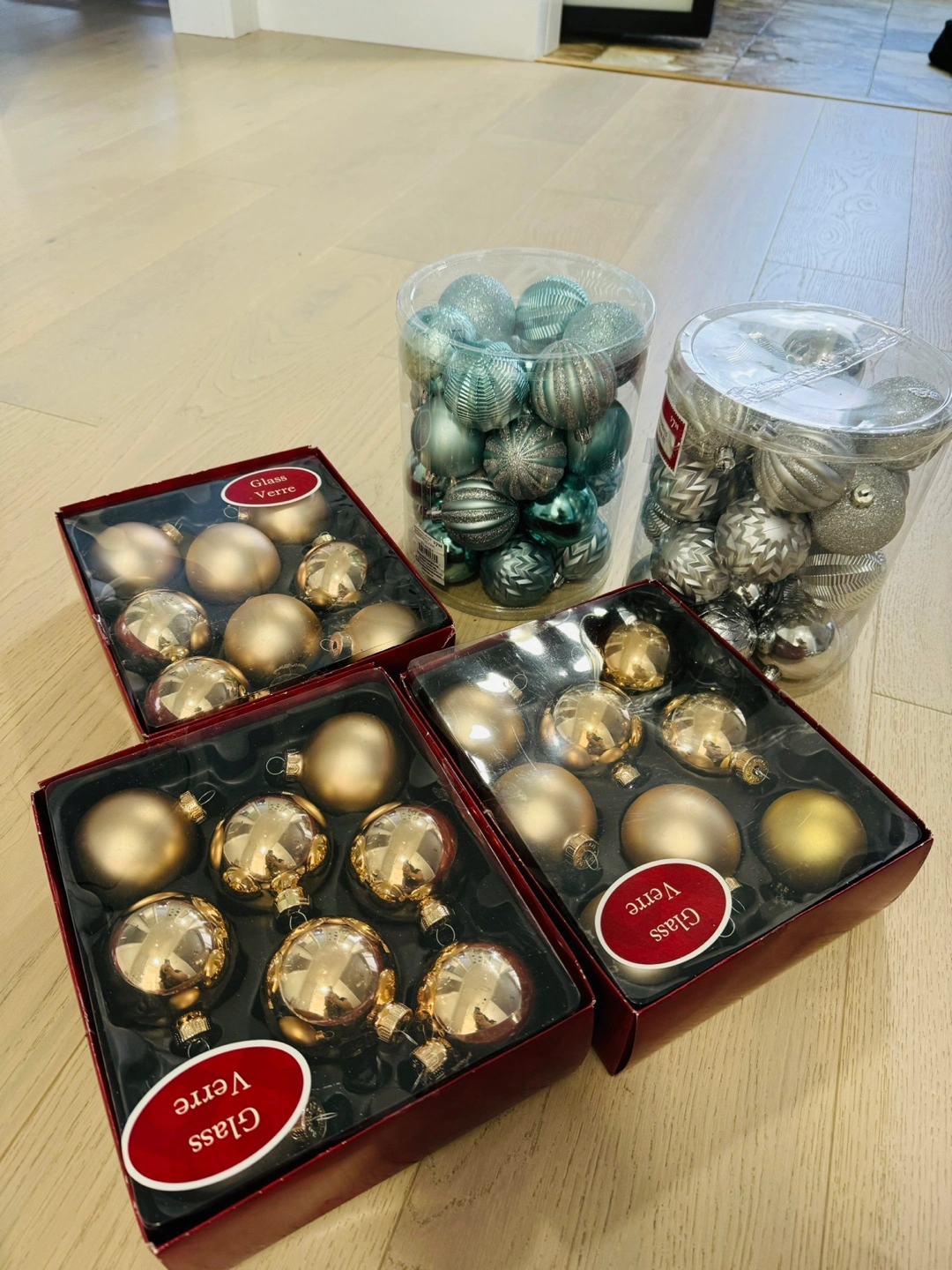 Three boxes of gold glass ornaments, one container of teal ornaments, and one container of silver ornaments.
