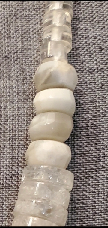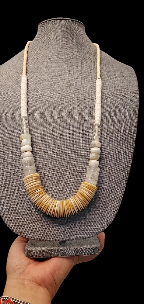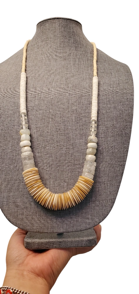 Long beaded necklace with natural white, tan, and shell beads. The necklace features a large section of tan disk-shaped of natural stones. Clear and vegetables ivory or milky quarts. Gold tone lobster clasp with tag signed by Serefina.