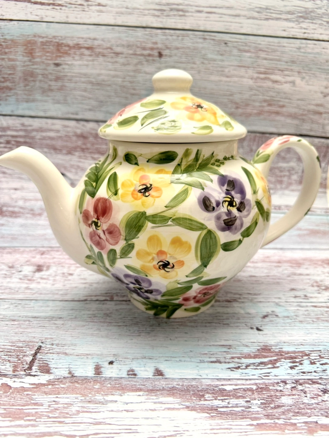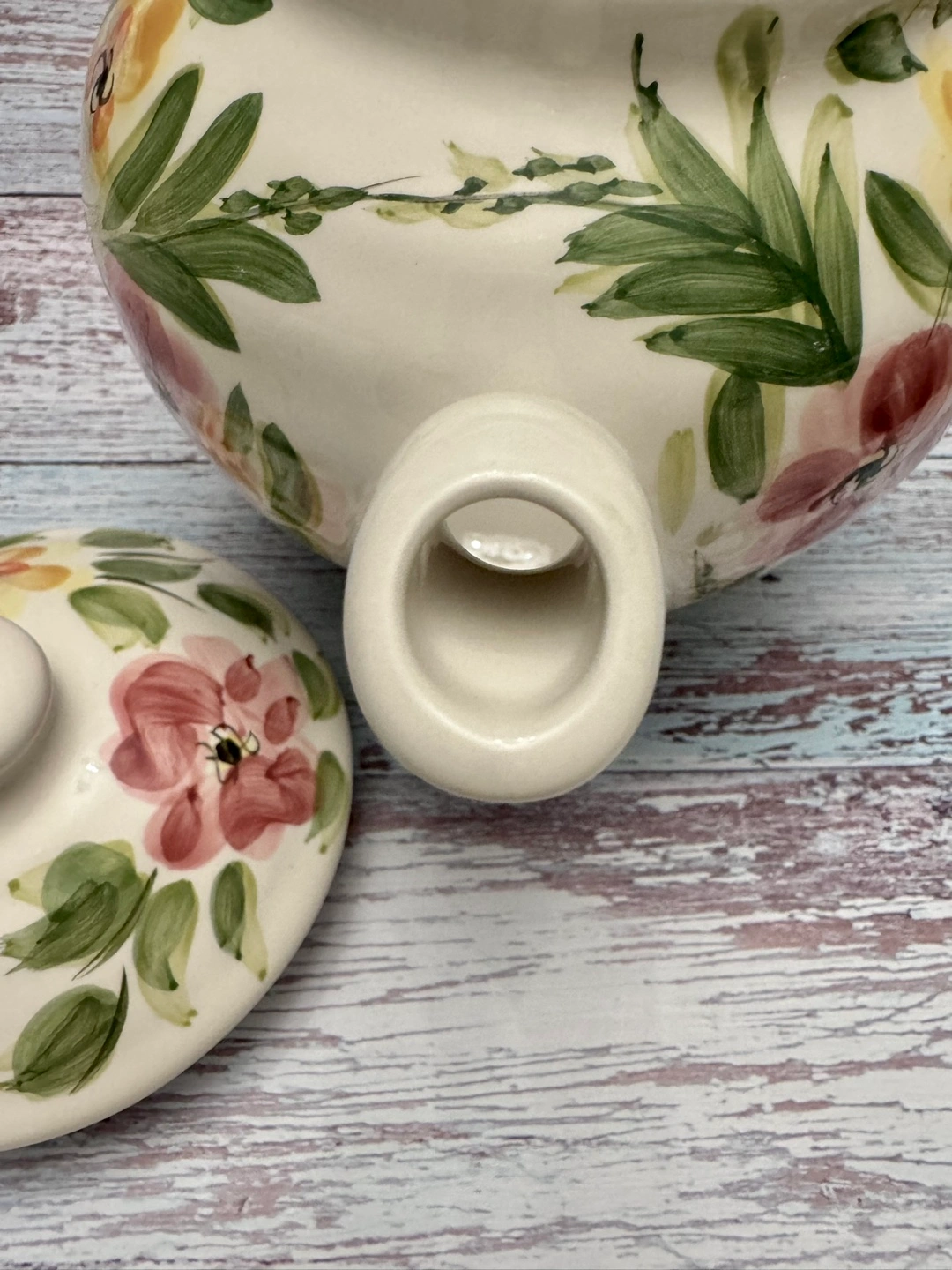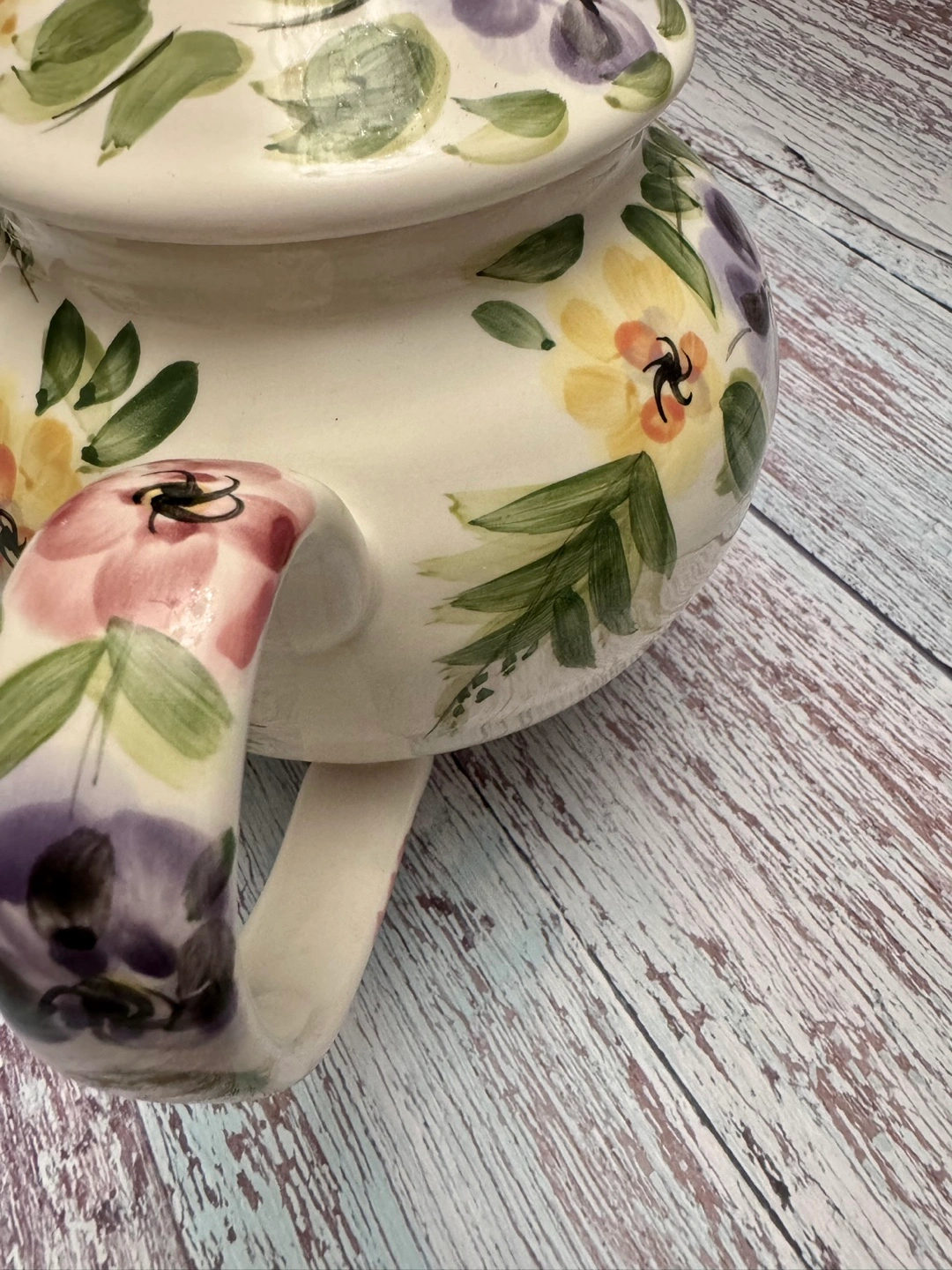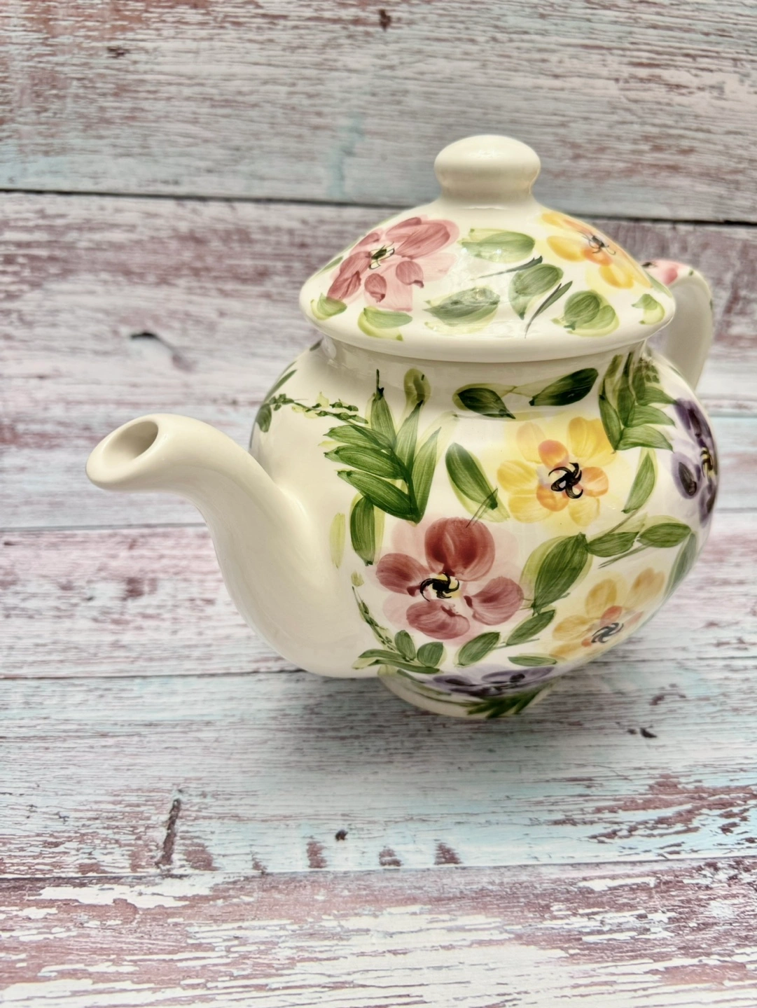 Beautiful vintage teapot with a floral design. White ceramic with hand painted flowers.
