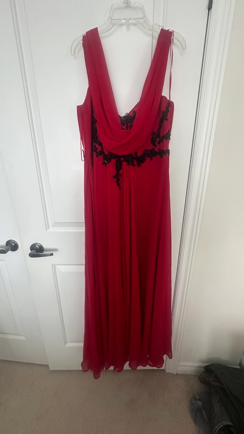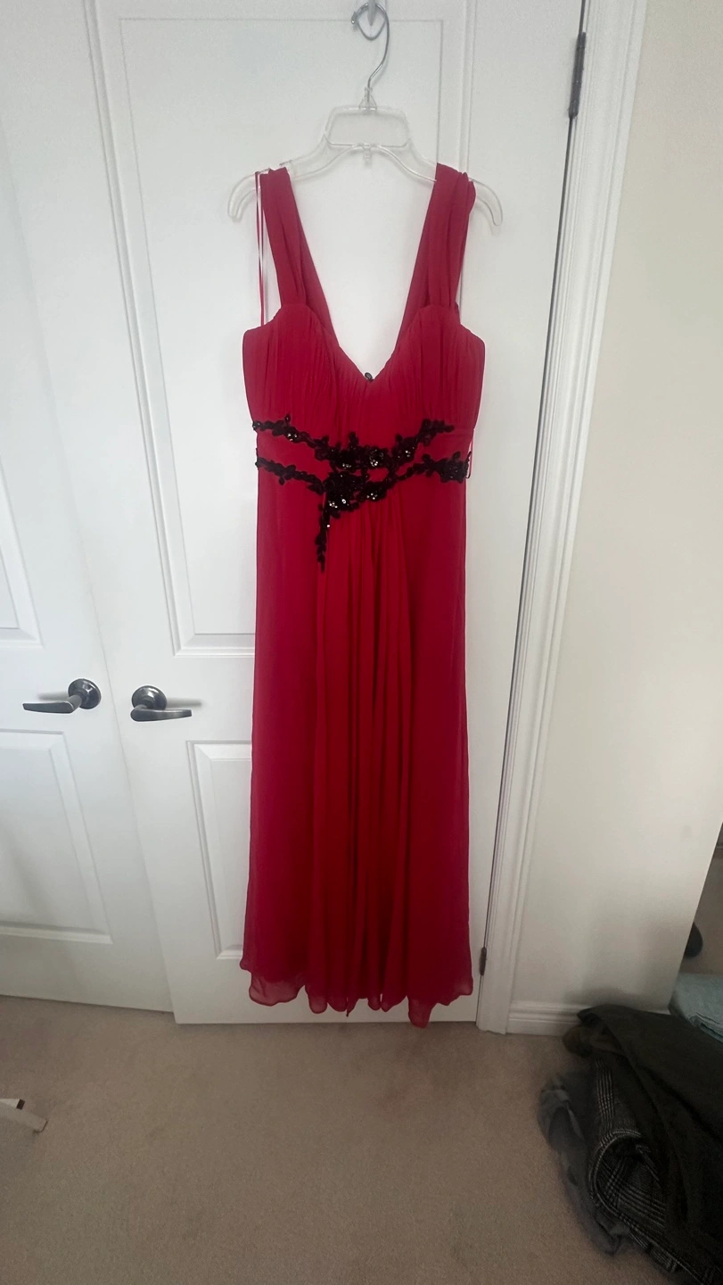Red floor length chiffon dress with black lace detail. Strapless, with a V-neckline and a gathered waist. Features a built-in bra.