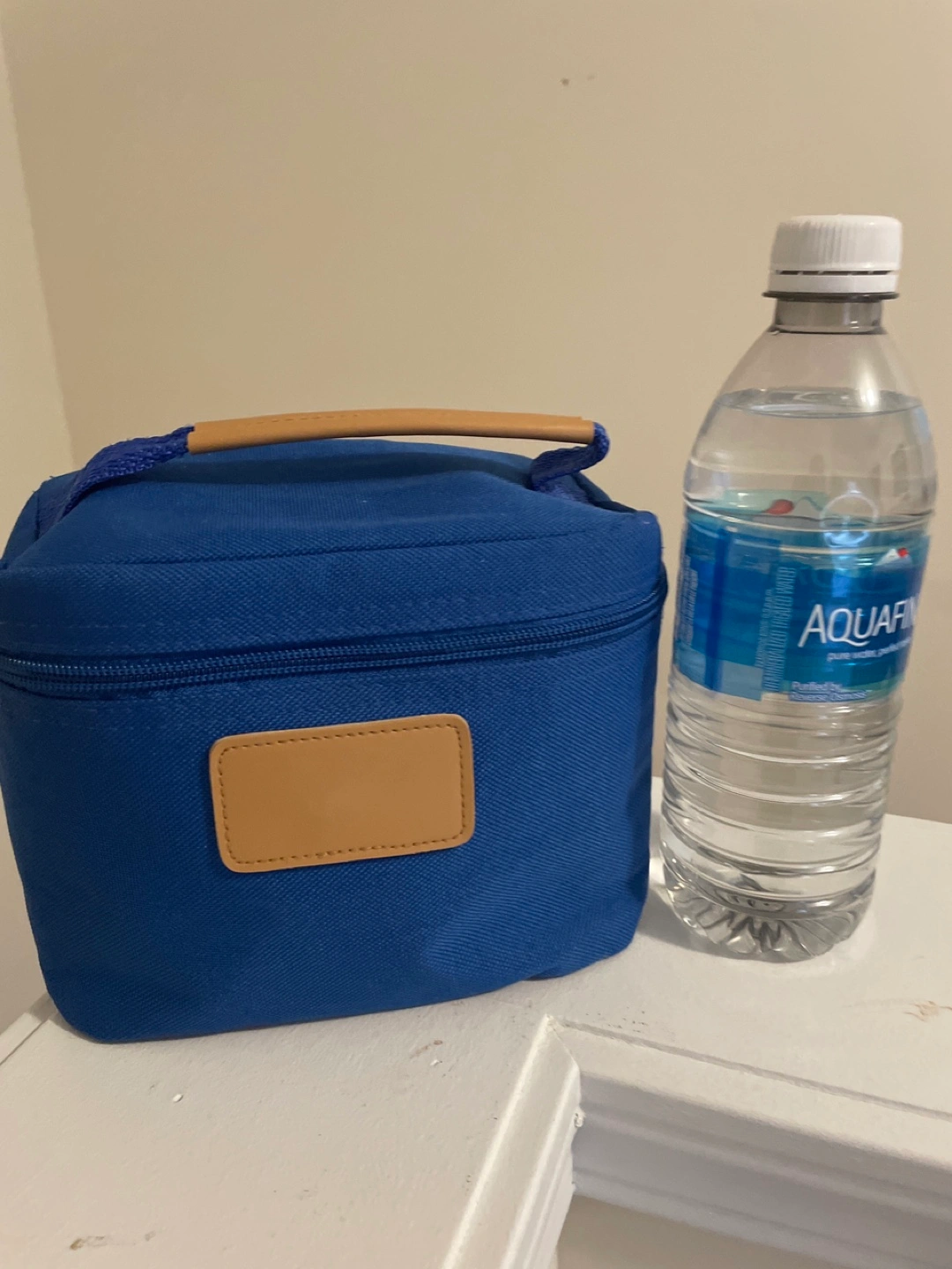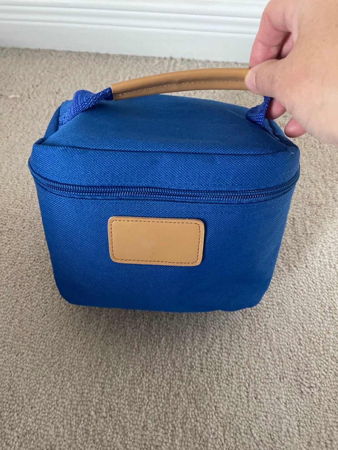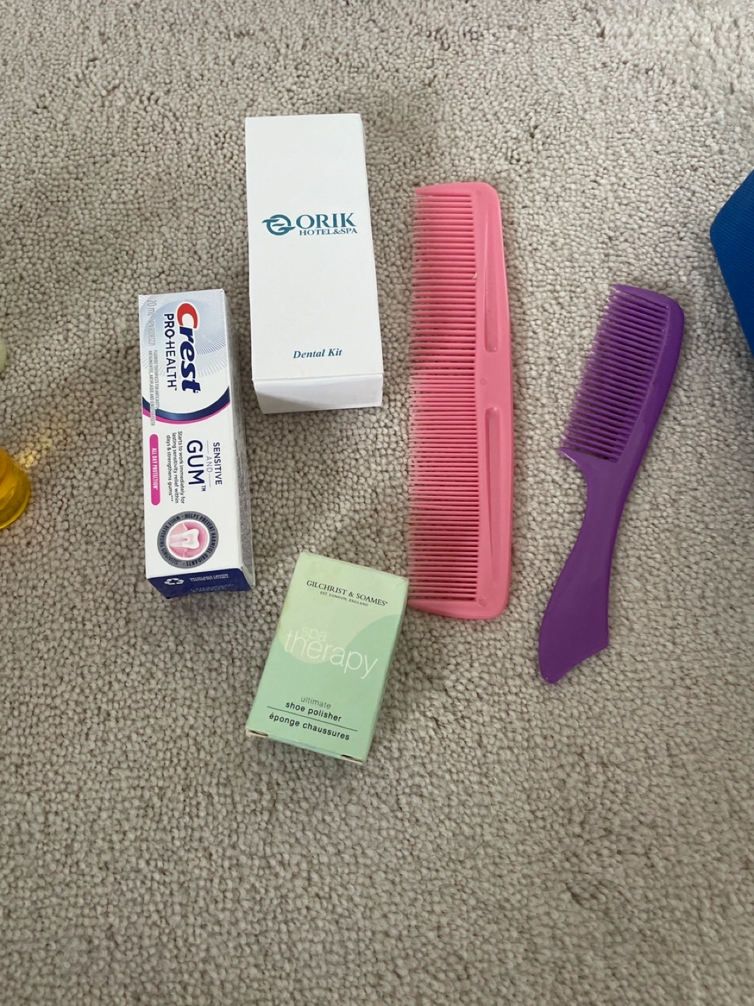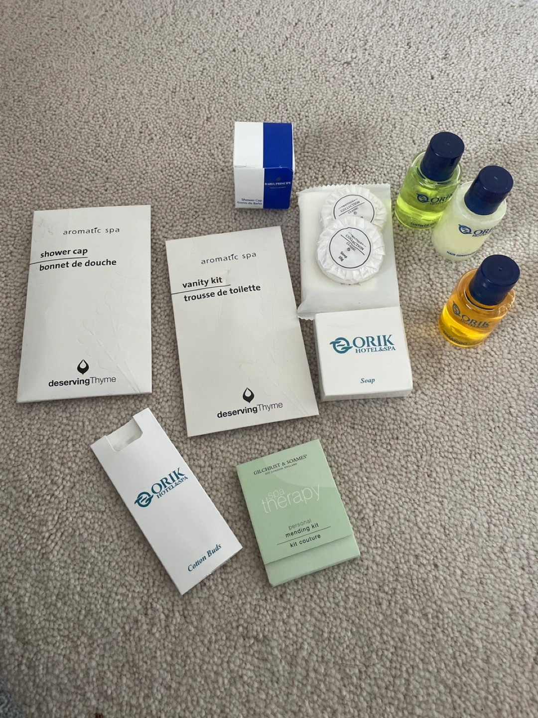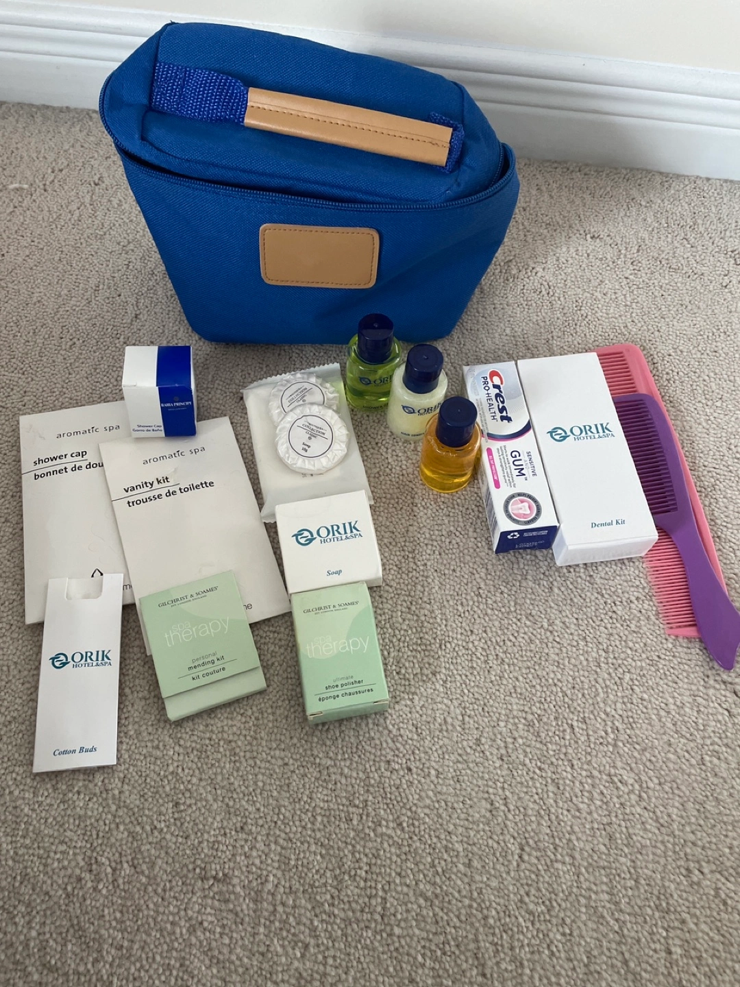 Blue toiletry bag with various amenities, Includes soap, shampoo, conditioner, shower cap, cotton buds, dental kit, and more. Like new bag is included. Smoke free and pet free home