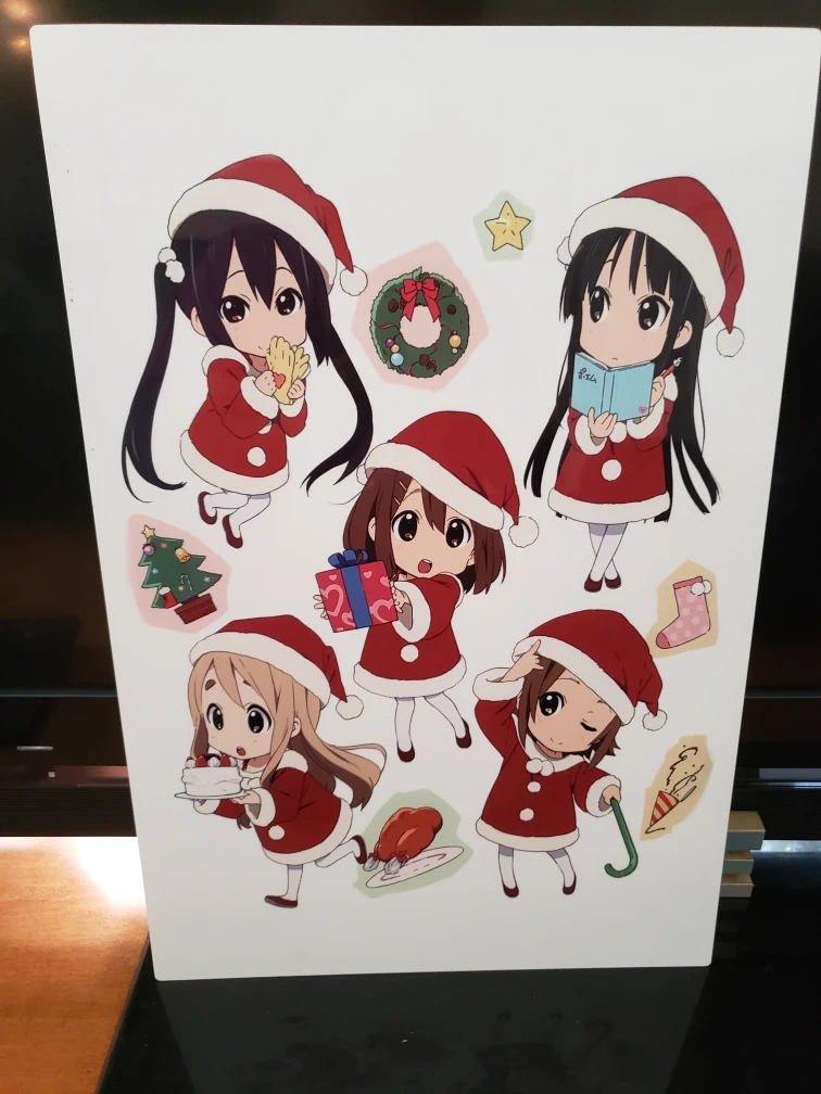 Metal print featuring the K-On! characters in Christmas outfits. Includes a hanging hook on the back.