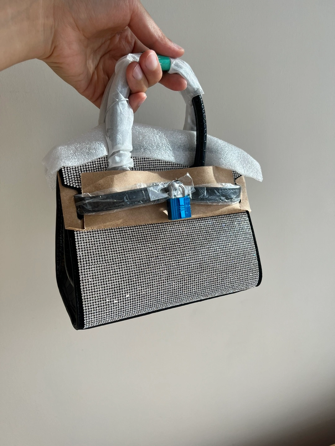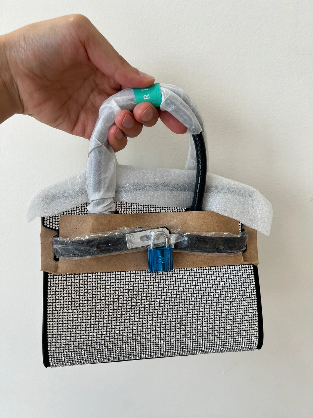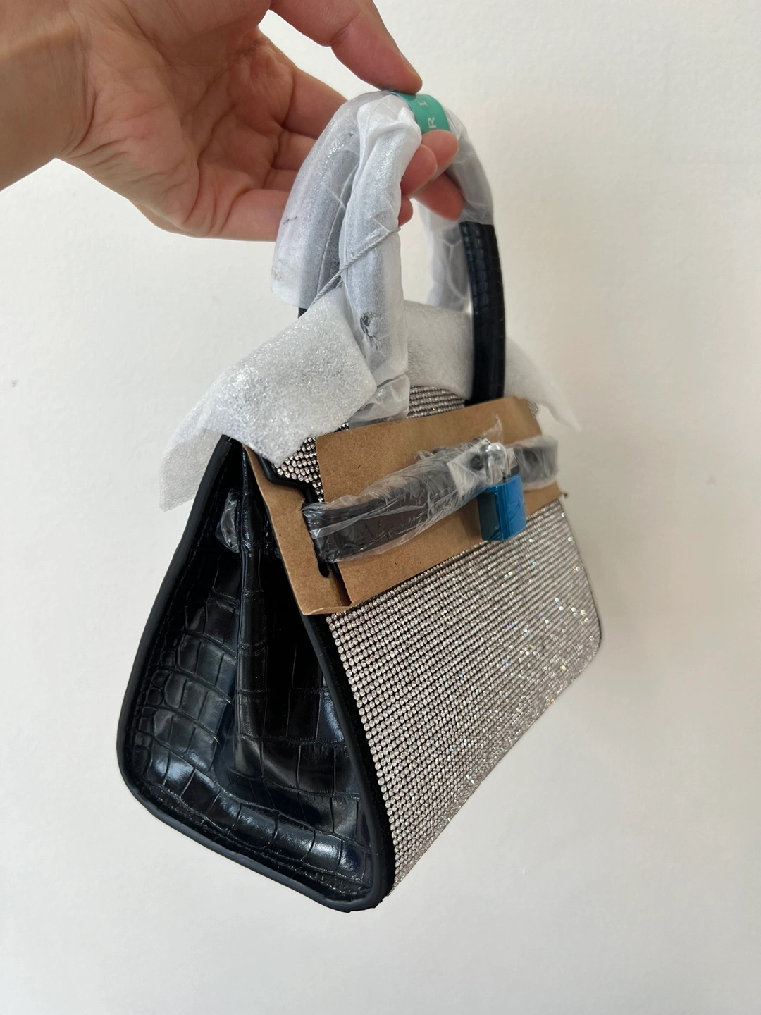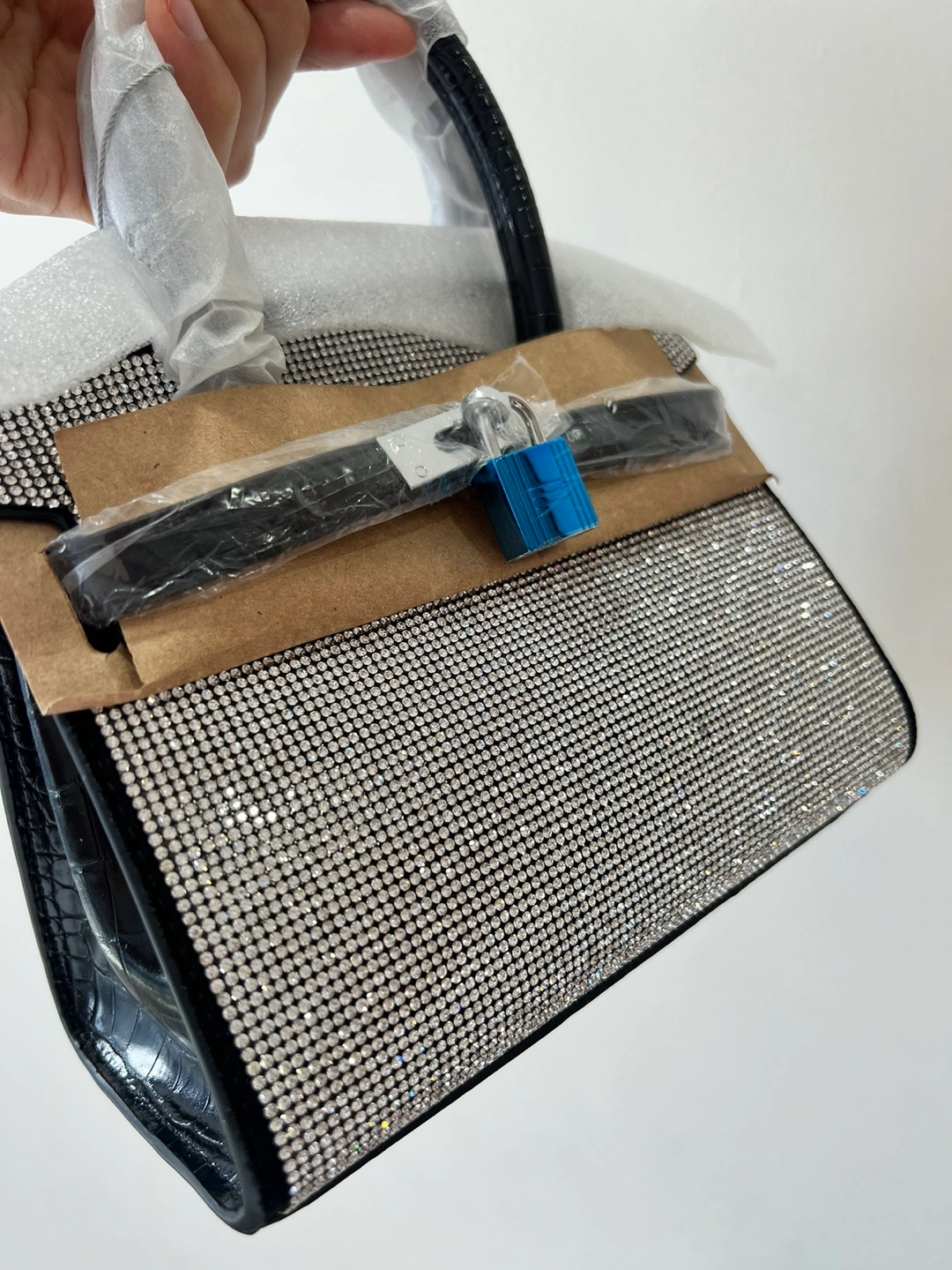 Brand new and unused. Small, black handbag with silver rhinestone embellishments. Has a top handle and lock and key closure. This high-quality, double-sided black leather bag with rhinestone accents is perfect for dates or attending banquets, adding a touch of elegance and sophistication!