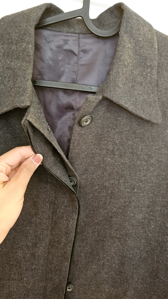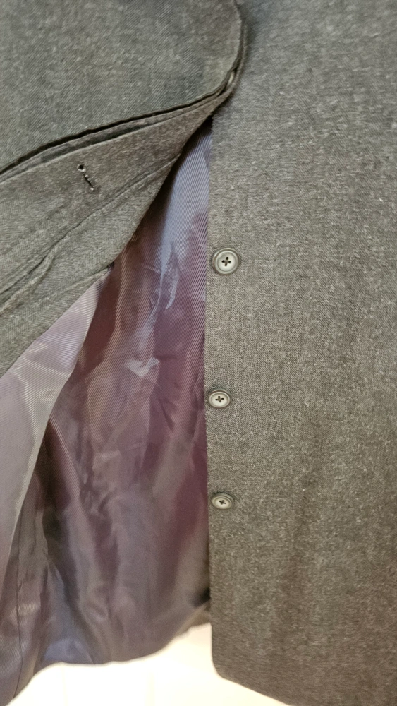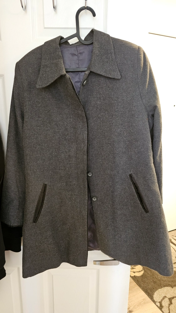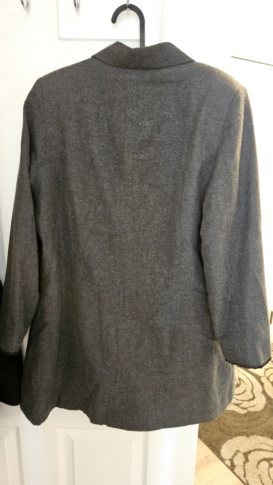 Grey blazer with button closure. Long sleeves with black trim. Lined interior.
