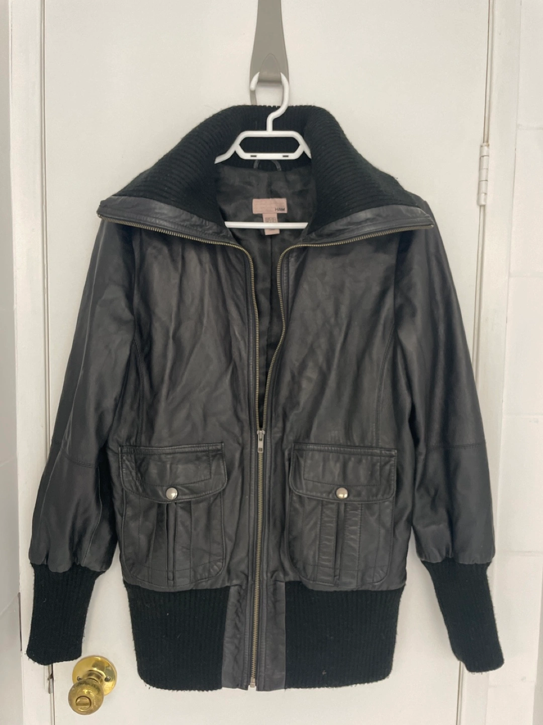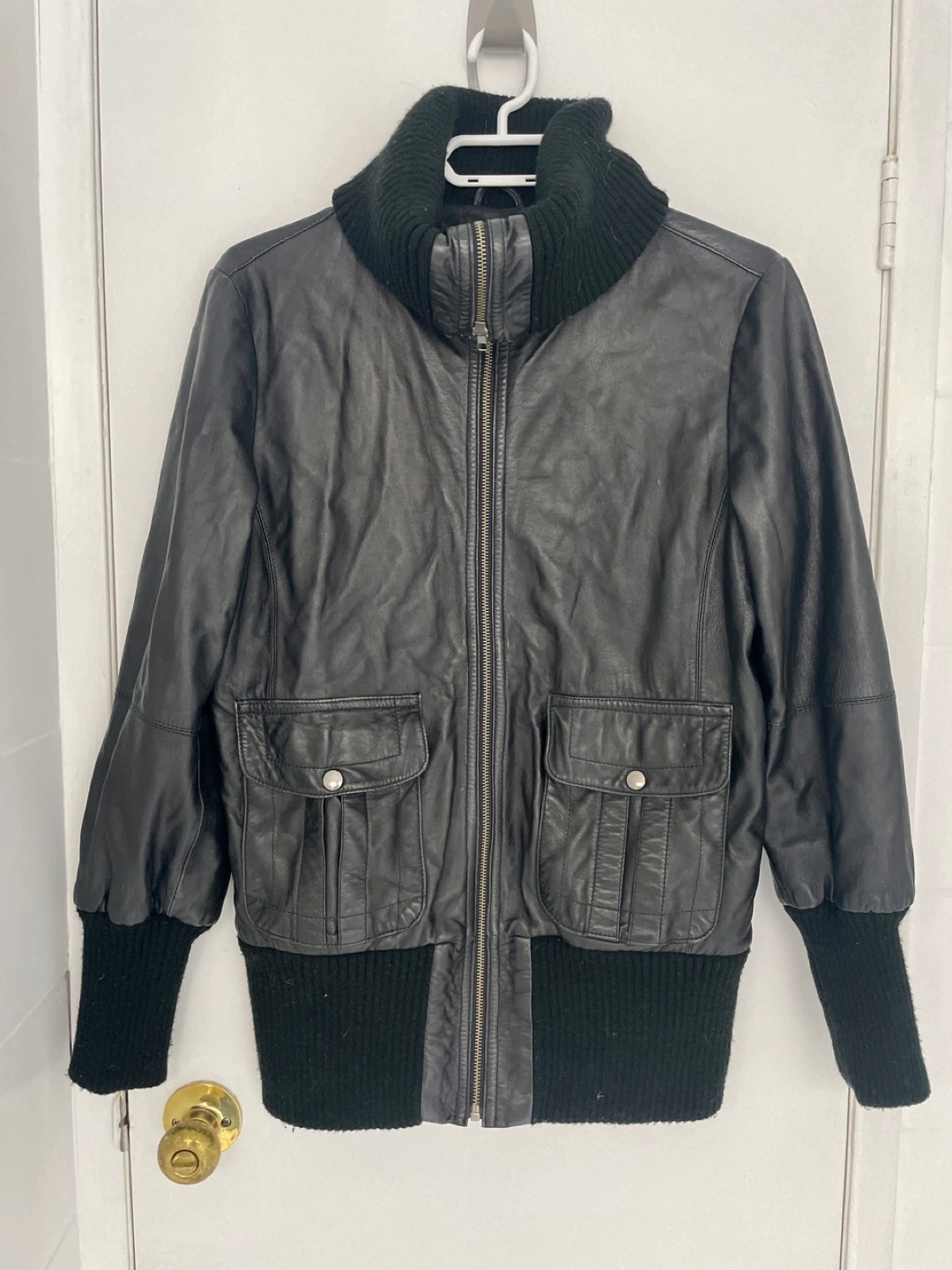 Black leather jacket with knit collar and cuffs. Features a zip-up front and two pockets. Pick up Steveston North