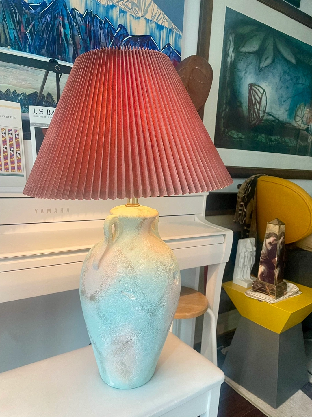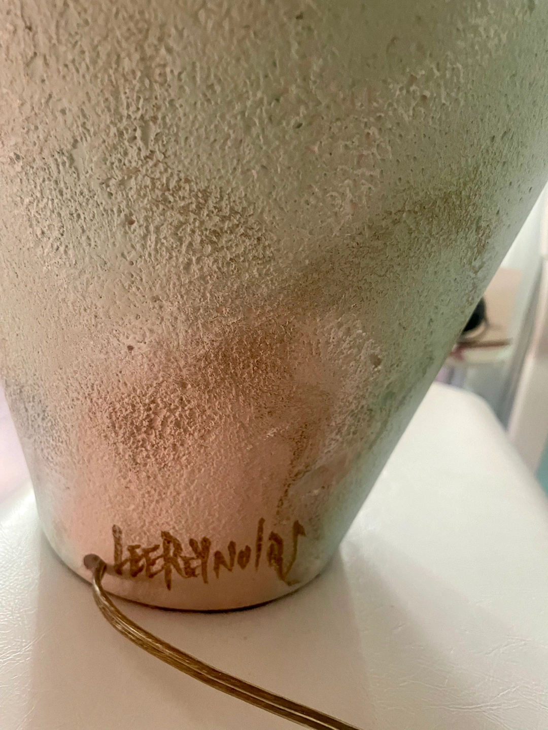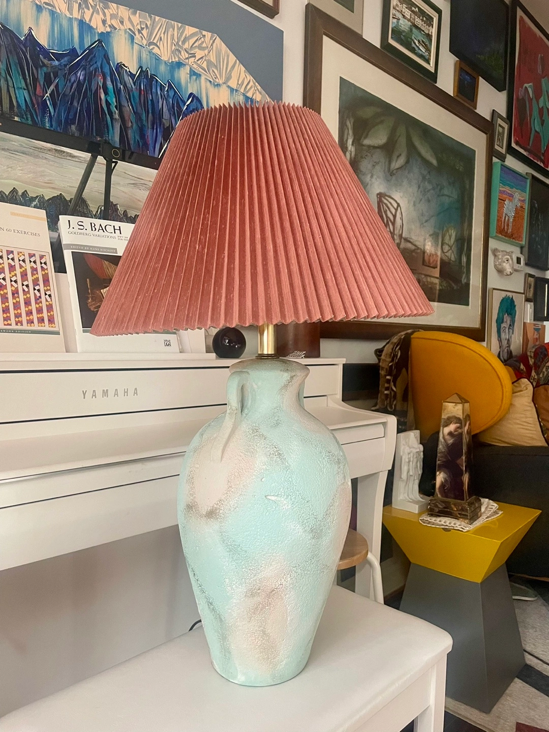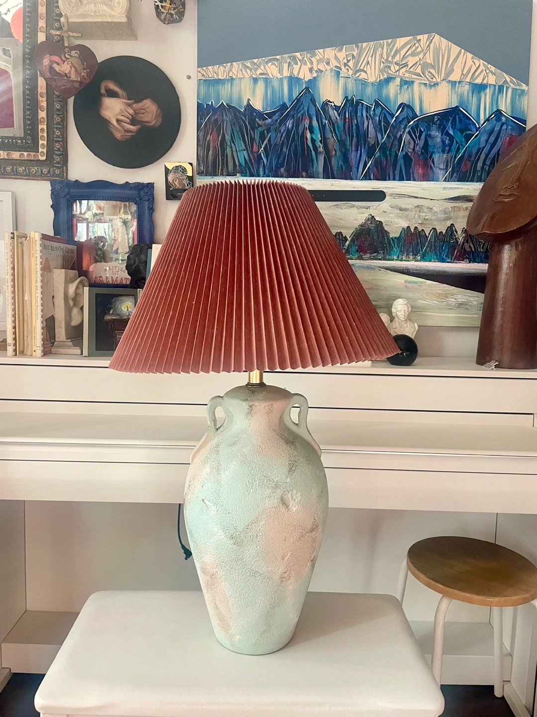This vintage ceramic lamp features a textured, soft green and beige glaze on its urn-shaped body. The surface shows organic patterns and slight abrasions that add a sense of character. The lamp has small handles near the top of the body. Signed by Lee Reynolds to the base, an artist known for his large production studio works in the mid-20th century, often bringing art into home decor. The pleated, warm terracotta-colored shade complements the subdued tones of the base. 31” H Pick up around Sherbourne/ Wellesley Could deliver for a fee.