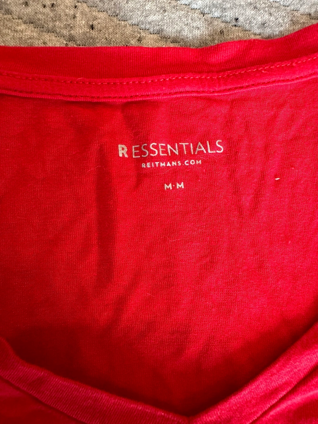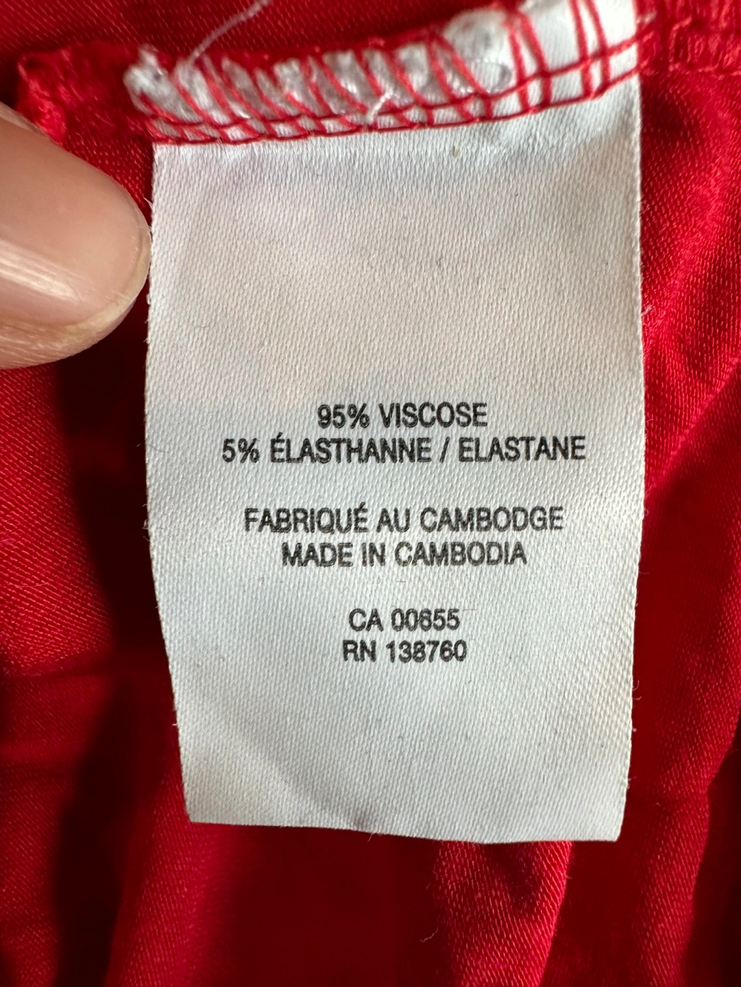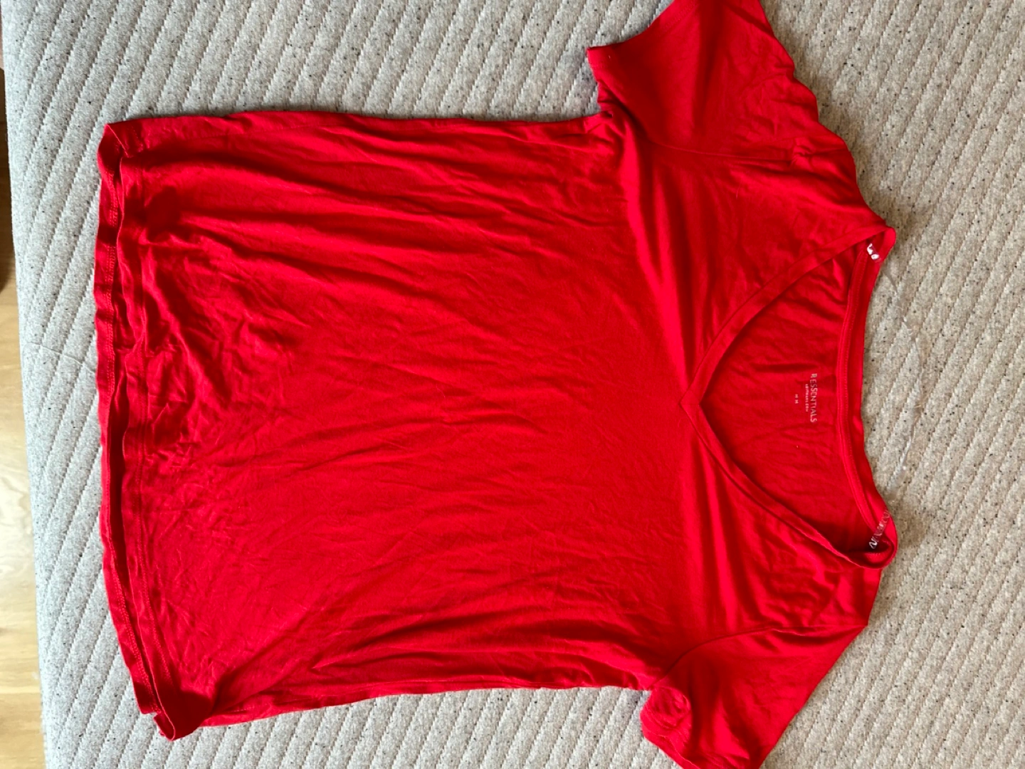Red V-neck T-shirt with short sleeves. Made of 95% viscose and 5% elastane. CASH ONLY please and thank you.