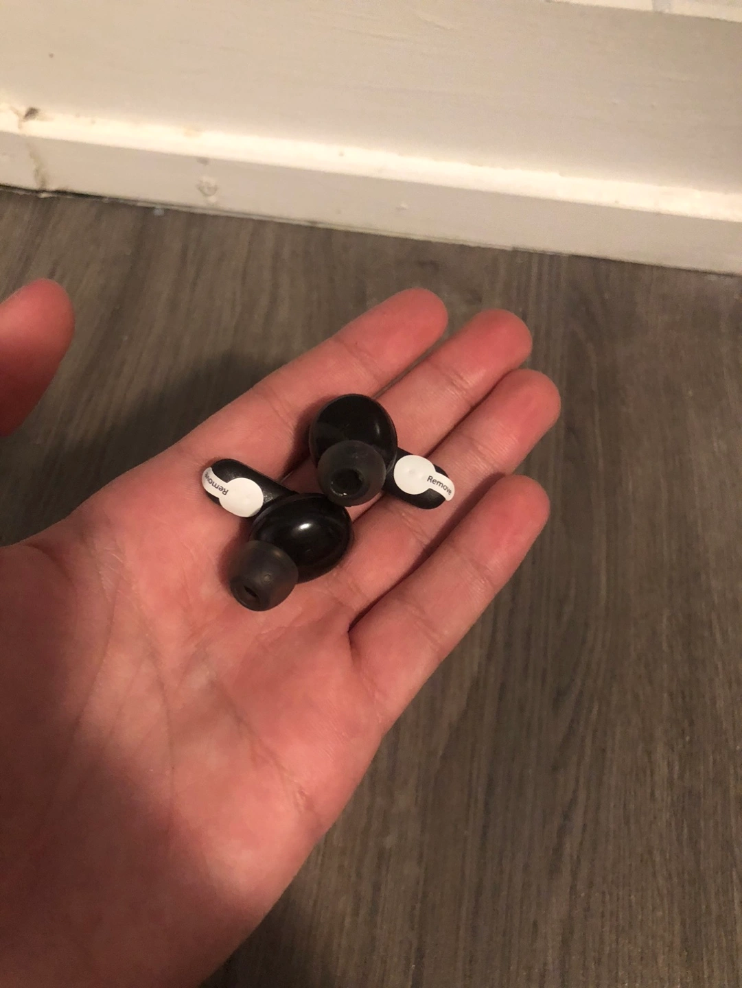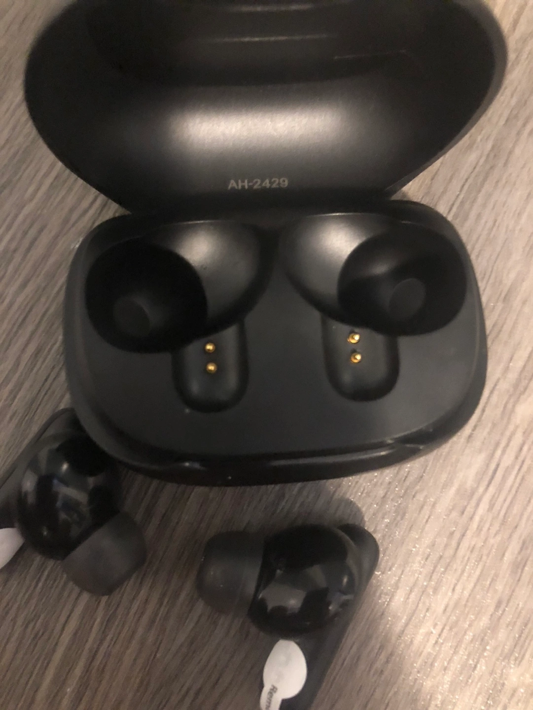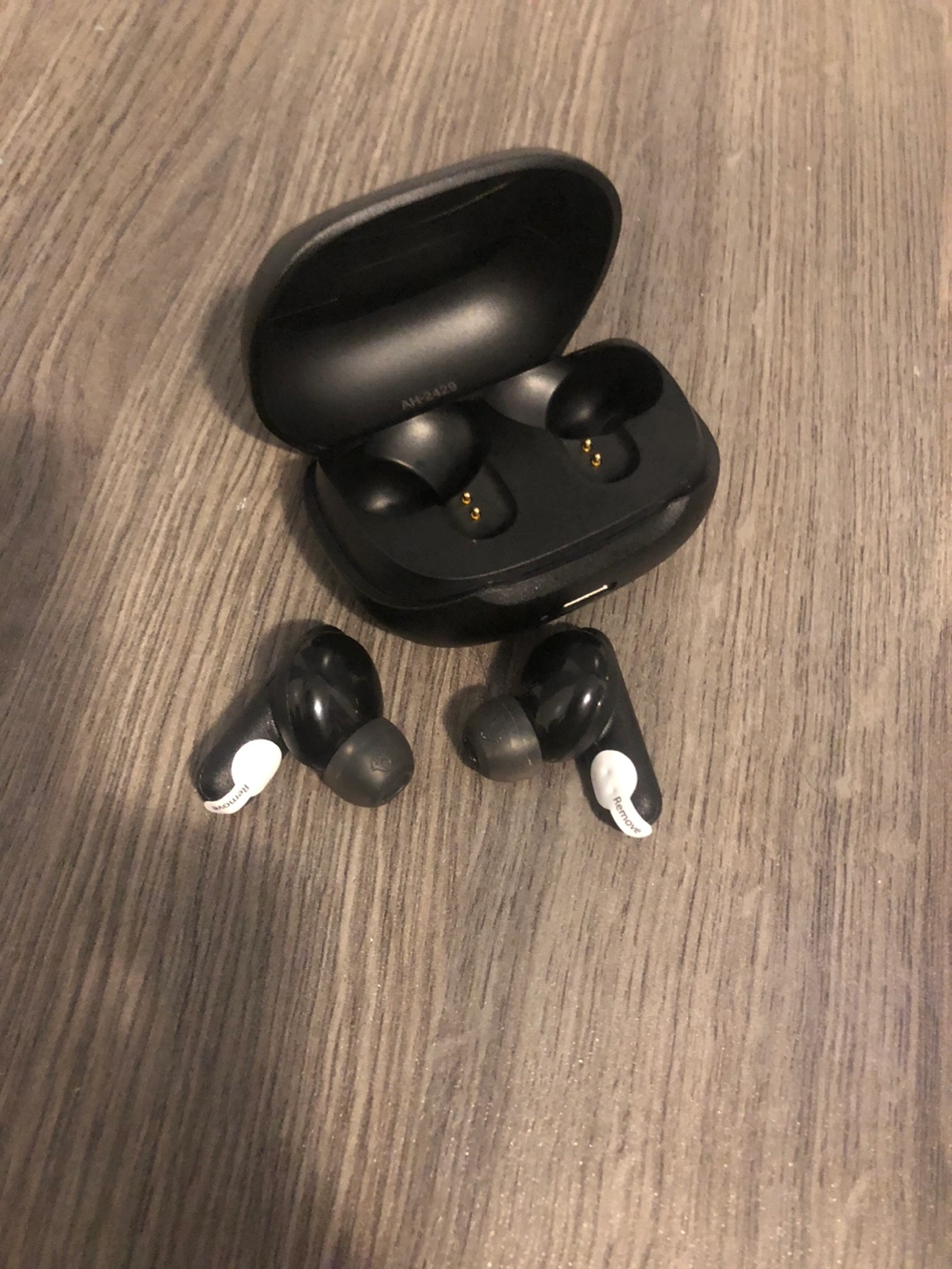 Black wireless earbuds with charging case. Includes multiple ear tip sizes.
