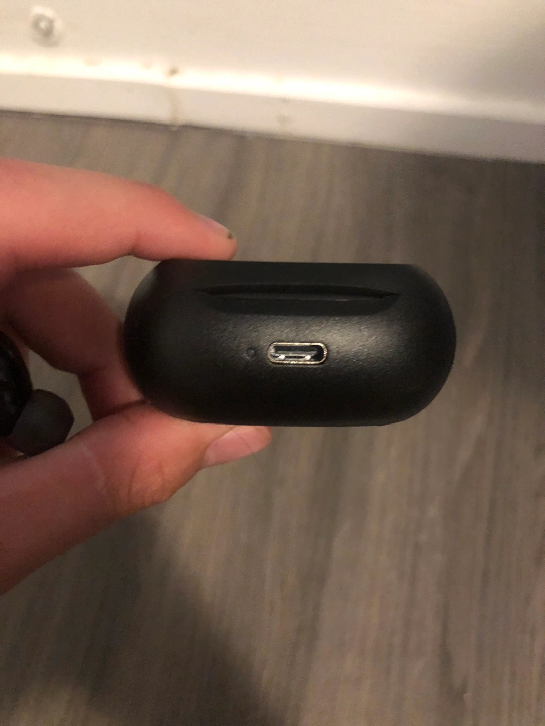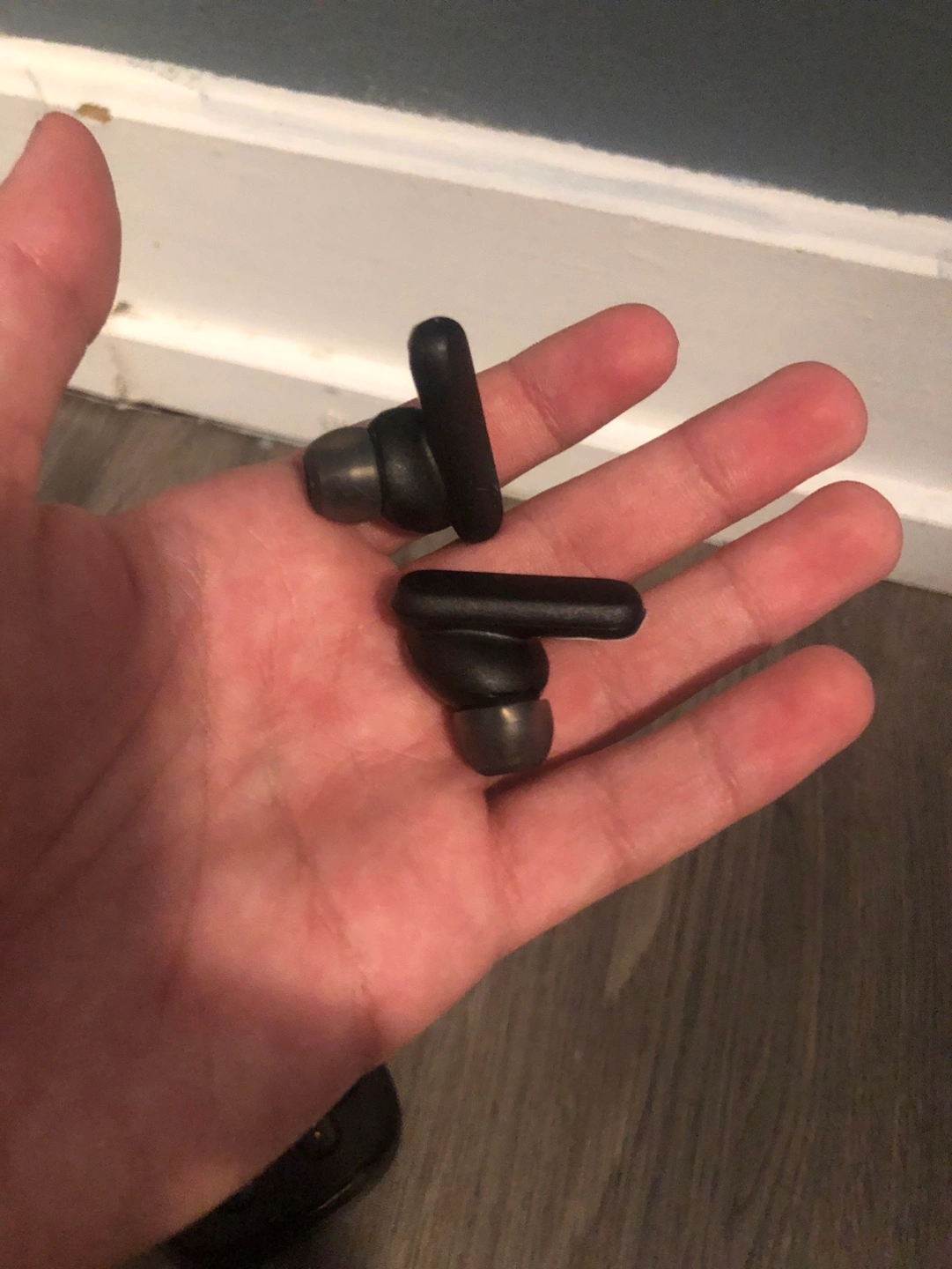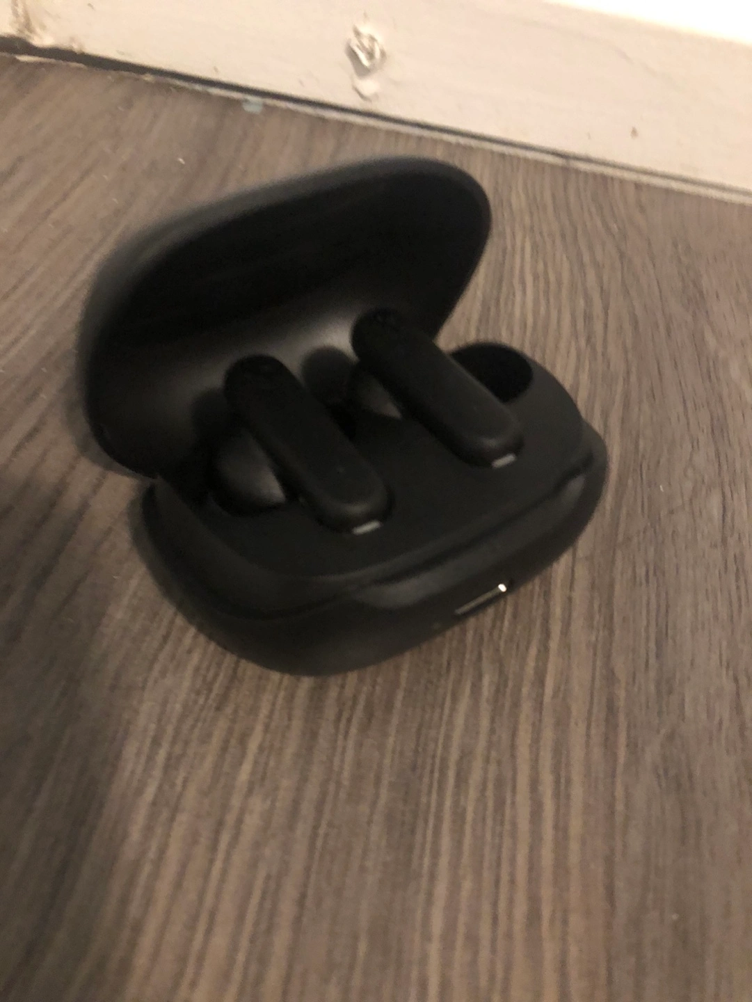 Black wireless earbuds with charging case. Includes multiple ear tip sizes.