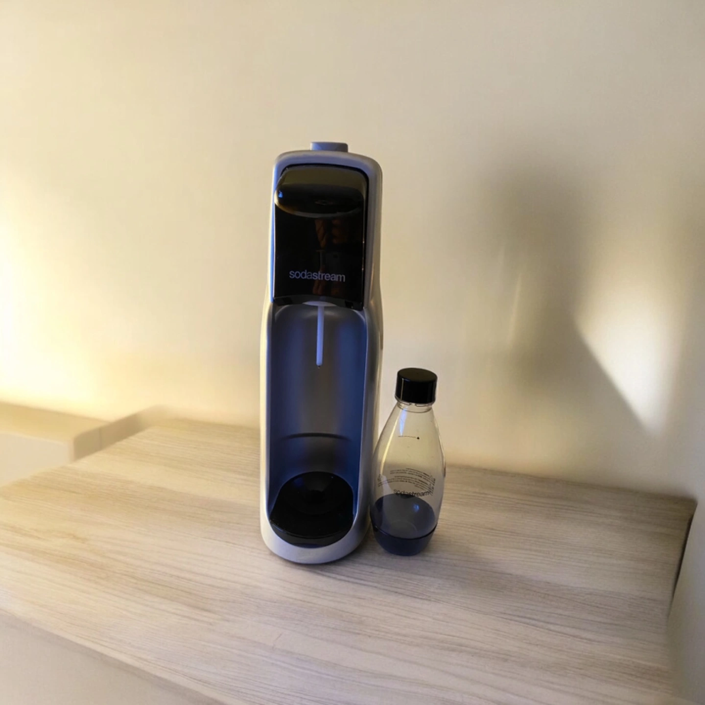 SodaStream sparkling water maker with one small bottle and one large bottle. Good condition.