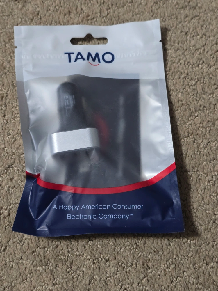 Car charger, silver. Comes in a sealed package.