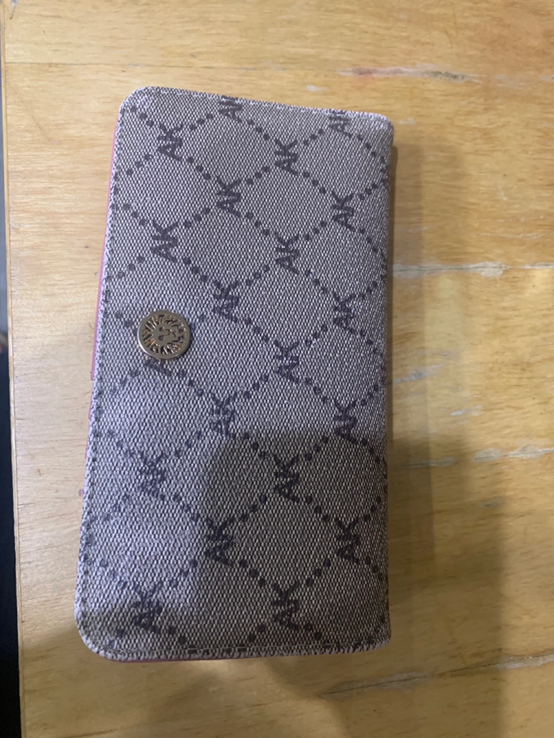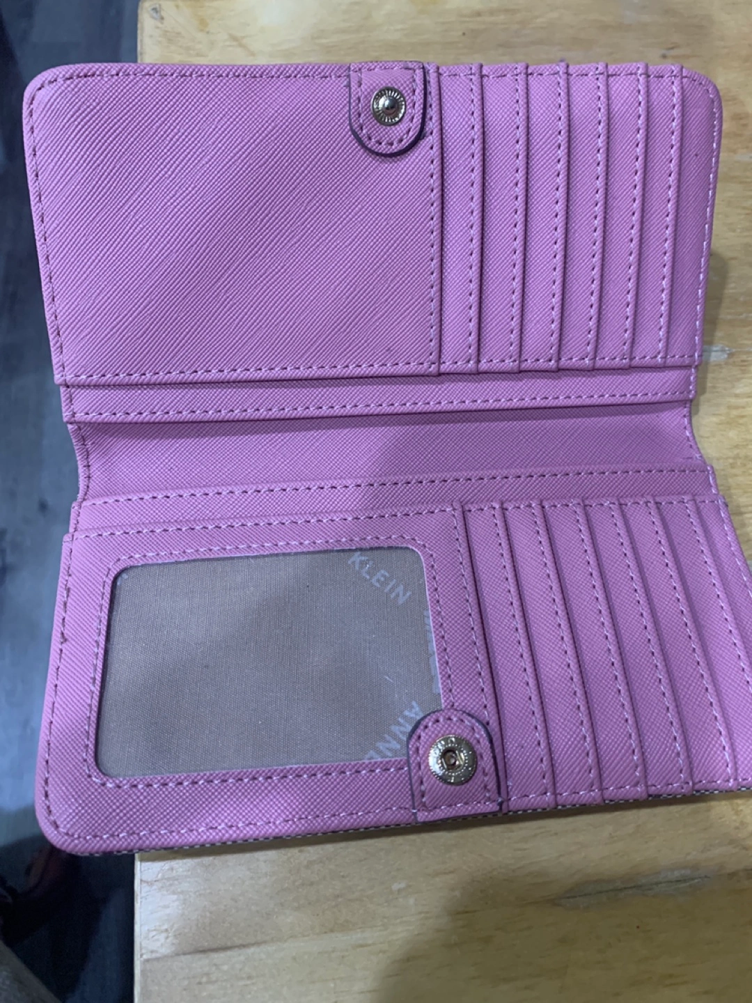 Small wallet with multiple card slots and a window for ID. Pink with a brown and grey pattern on the exterior.