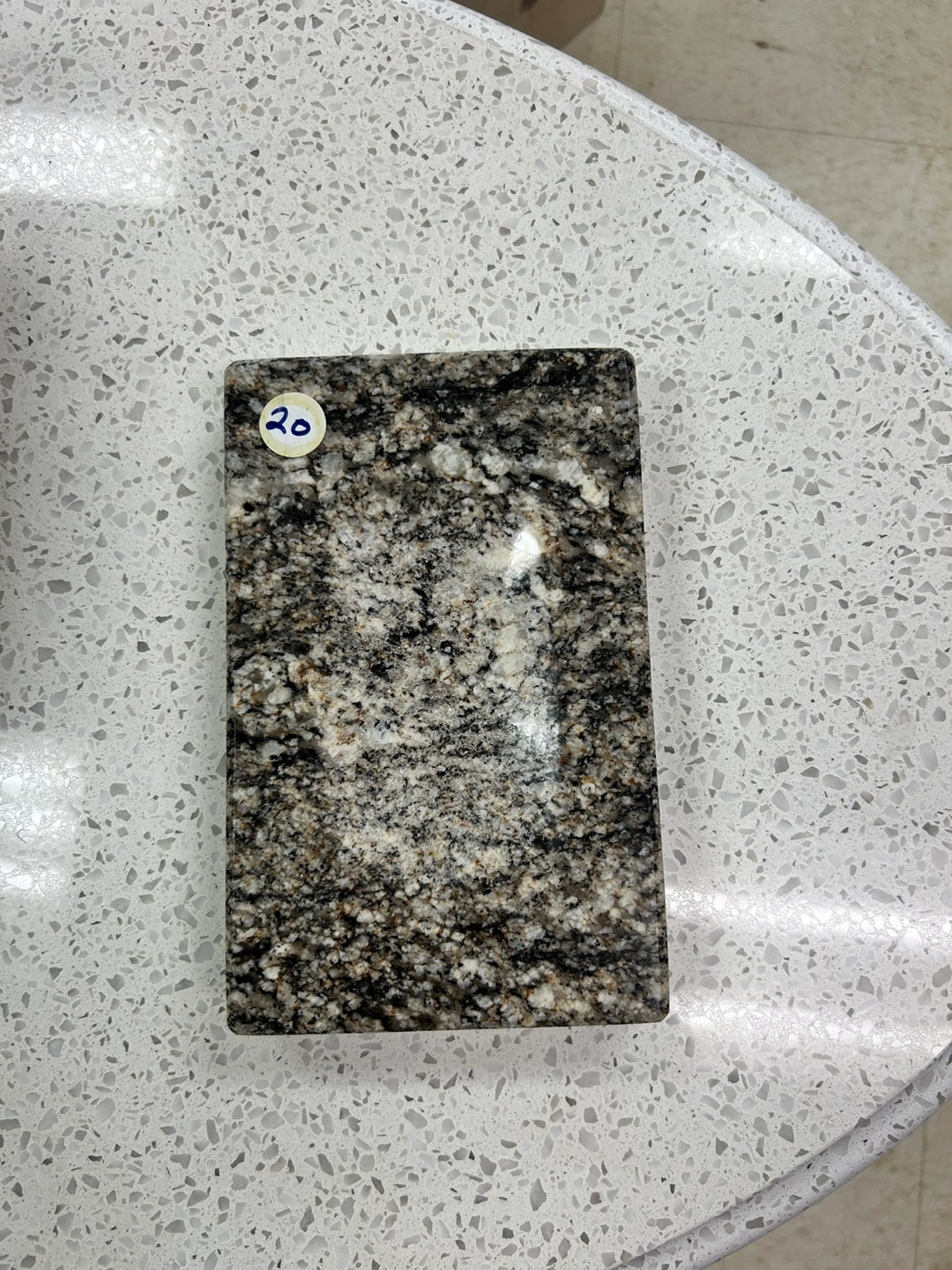 Bar of soap holder made of granite. Black and grey with white flecks. Approximately 12 inches long.