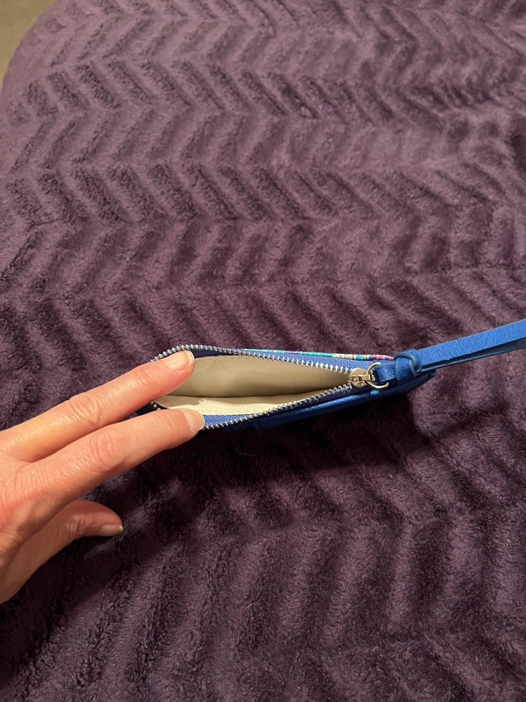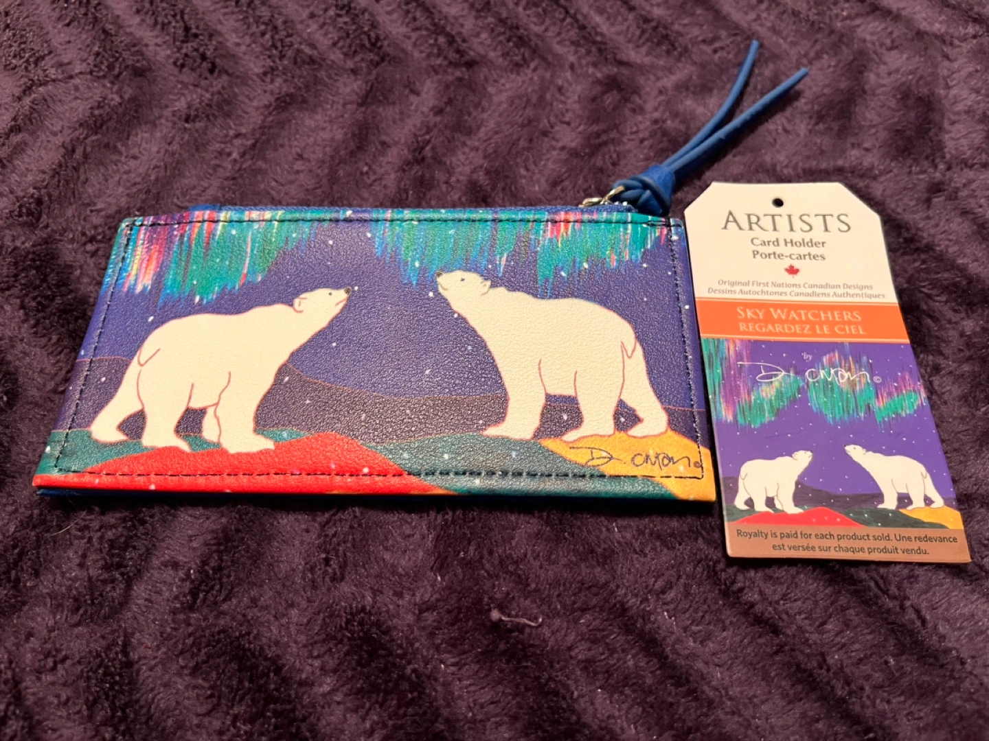 Artist's Card Holder. The Polar Bear, blue card holder, zippered pouch for change and a wristlet strap.