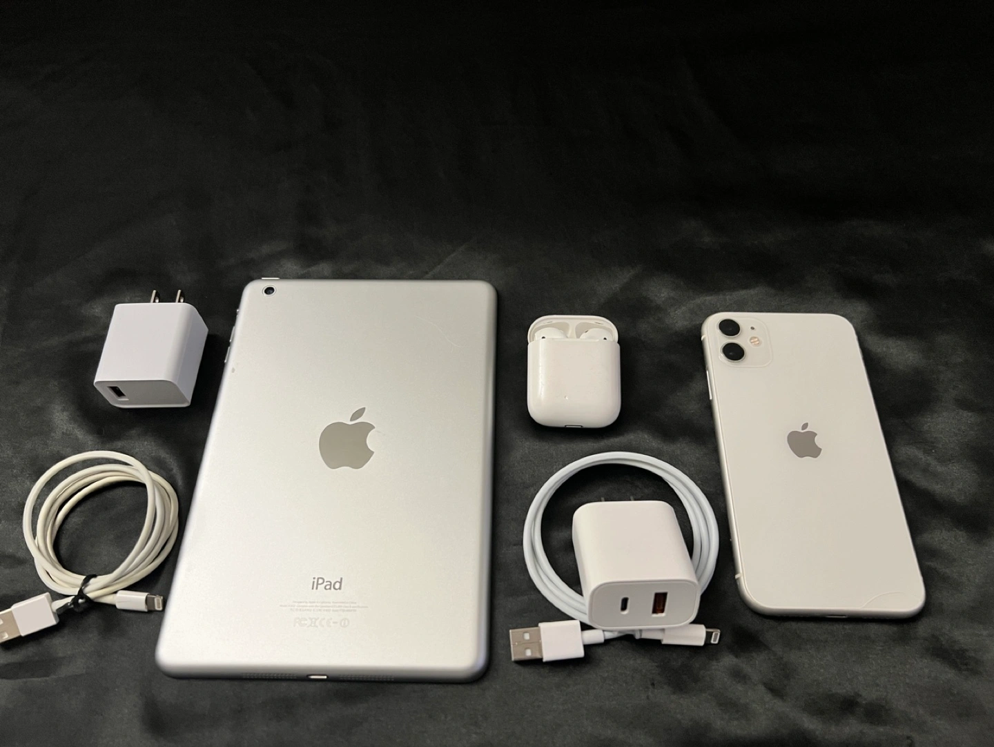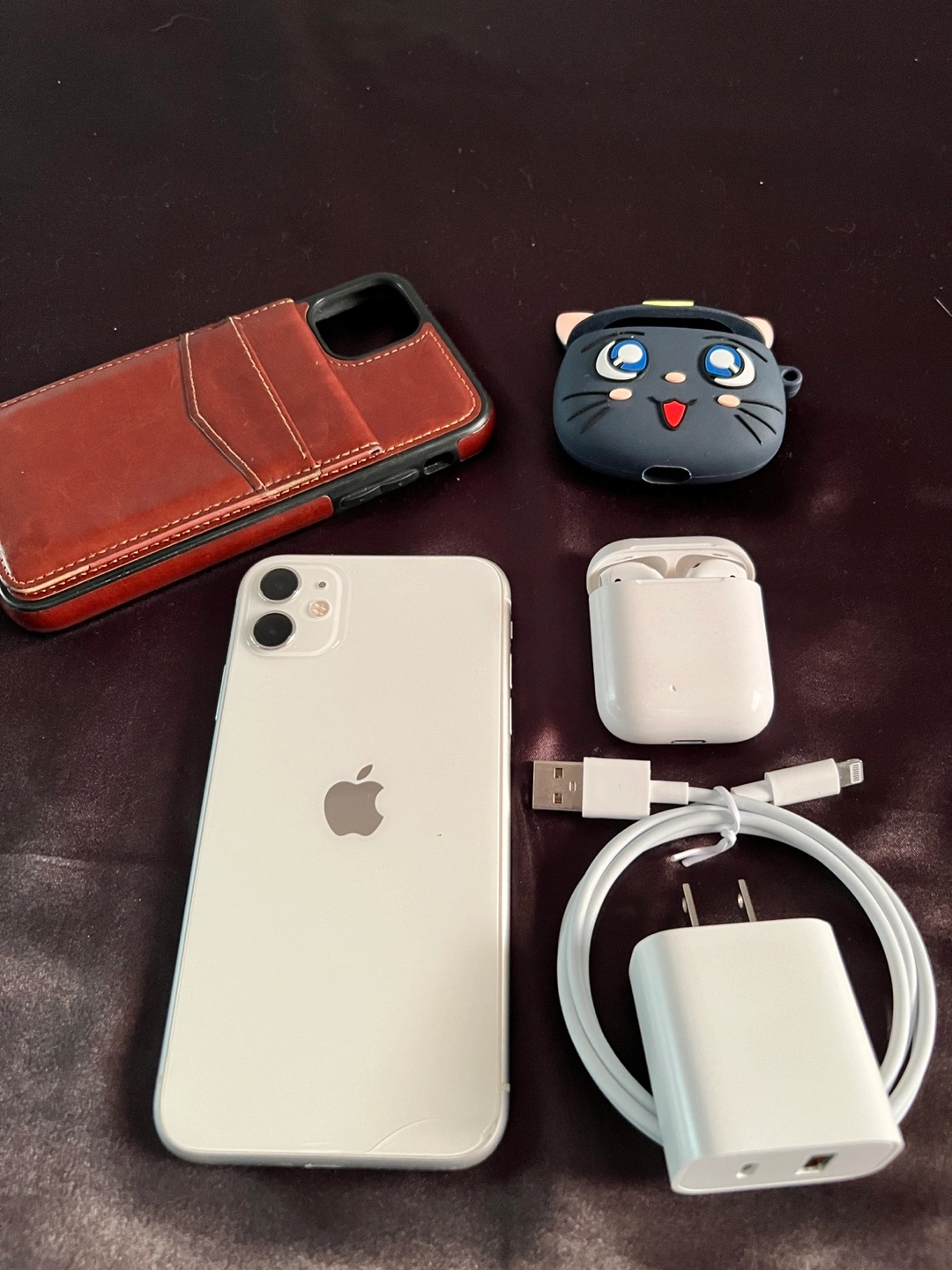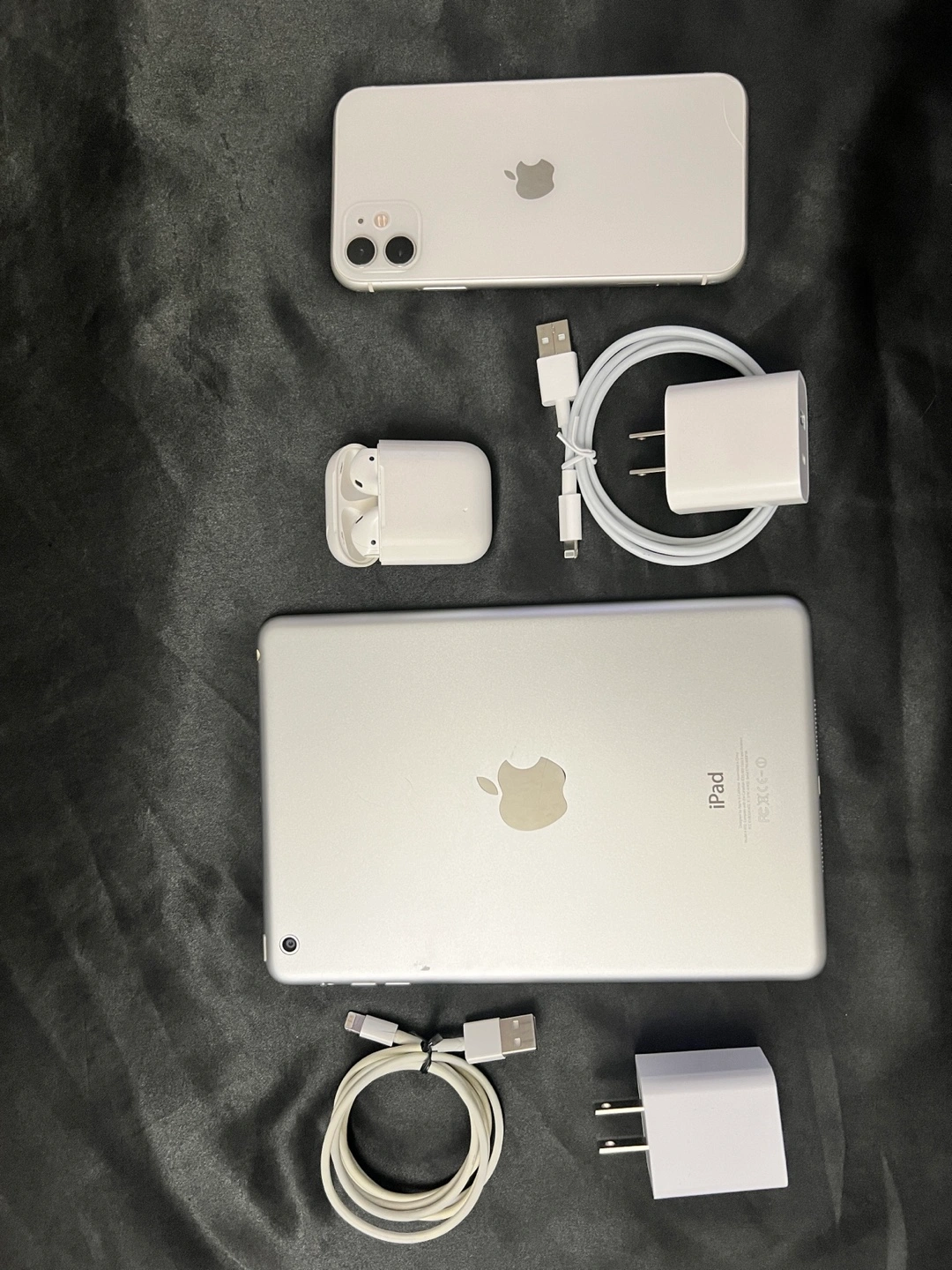 Details: iPhone 11 white Any network (Unlocked for all carriers) Face ID | working Storage | 64gb Mint condition and Barely use.. Smooth and long lasting. Good shape even though battery health as well. All working & no dents or scratches but In my opinion it's in great condition minus the crack on back, no box included.. Accessories: All included, as you can see in the video & pictures… •Charger - USB & TYPE - C •Lightning cable not used •4 cases •Front always has had glass protector •1stGen Airpods the right one need to bring in Apple service support btw it’s free and have a airpods case. iPad mini 1st gen White & Silver Wi-Fi 16GB Bluetooth wireless technology Comes with charger adapter & cable iPad screen have a little bit of water inside but it goes unnoticed and doesn’t affect anything still good working.. No other dents and scratches still fine.. pass lowballing.. Pick up
