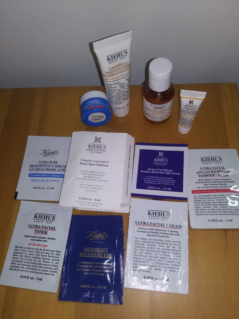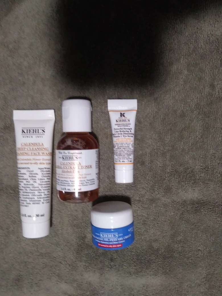 Kiehl's skincare set includes: Calendula Deep Cleansing Foaming Face Wash, Ultra Facial Oil-Free Gel Cream, Calendula Herbal-Extract Toner, Dermatologist Solutions Powerful-Strength Line-Reducing & Dark Circle-Diminishing Vitamin C Eye Serum