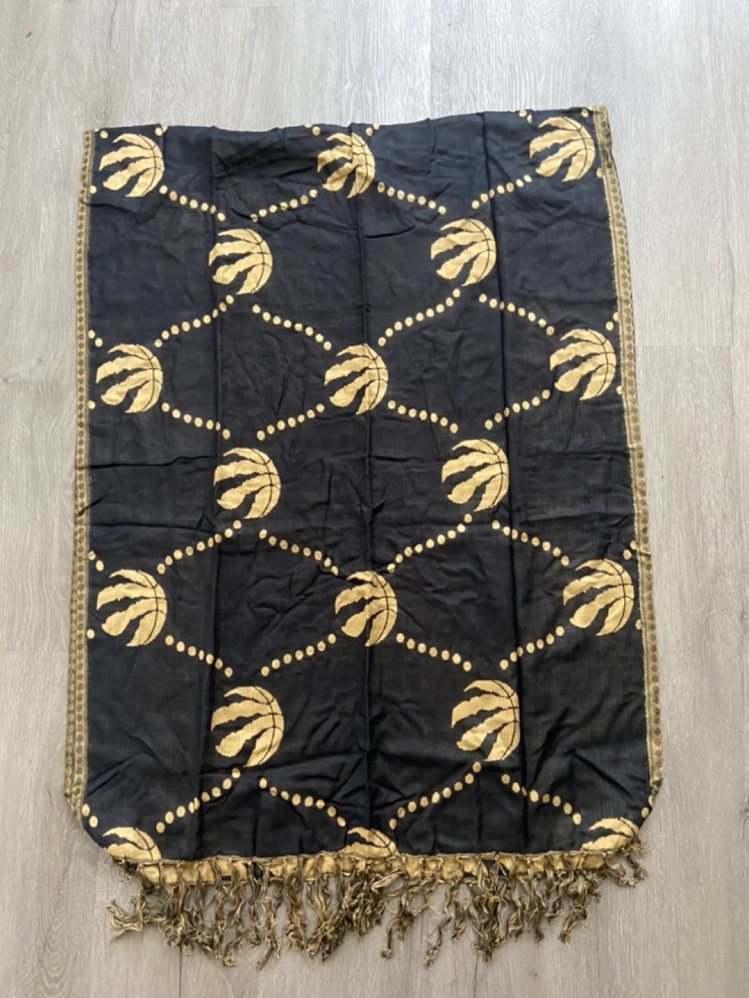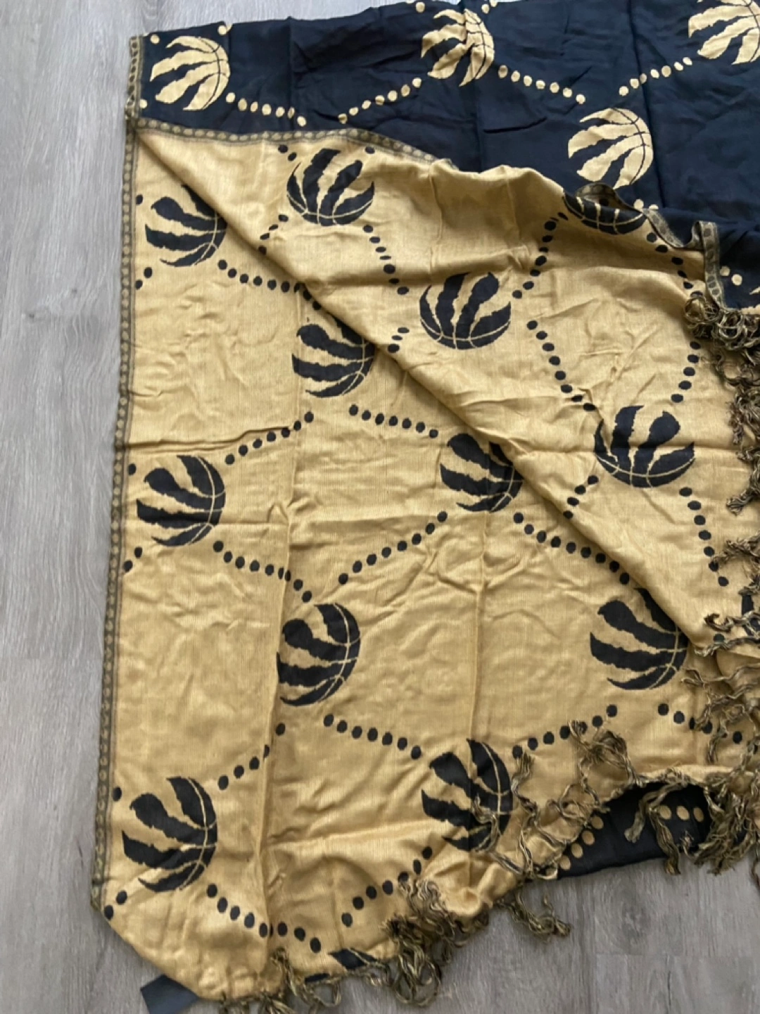 Black and gold scarf with Raptors logo. Has fringe trim. Made from a soft, lightweight material.
