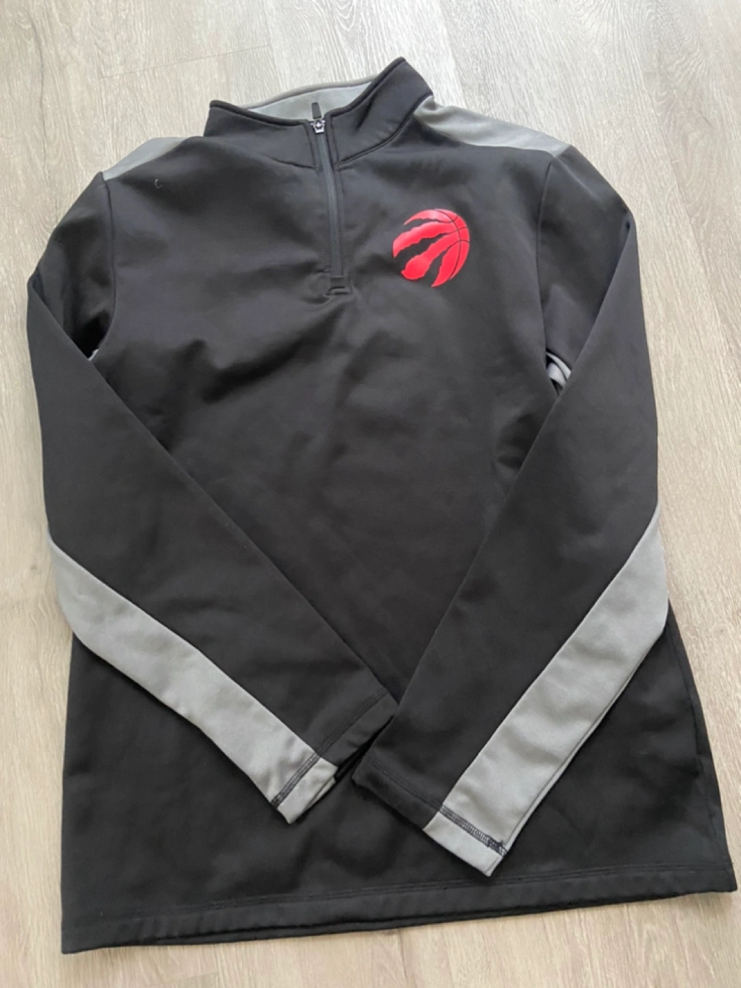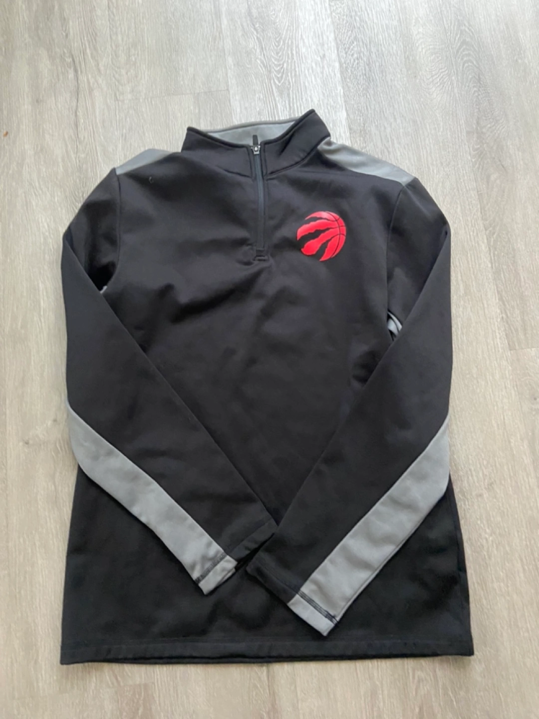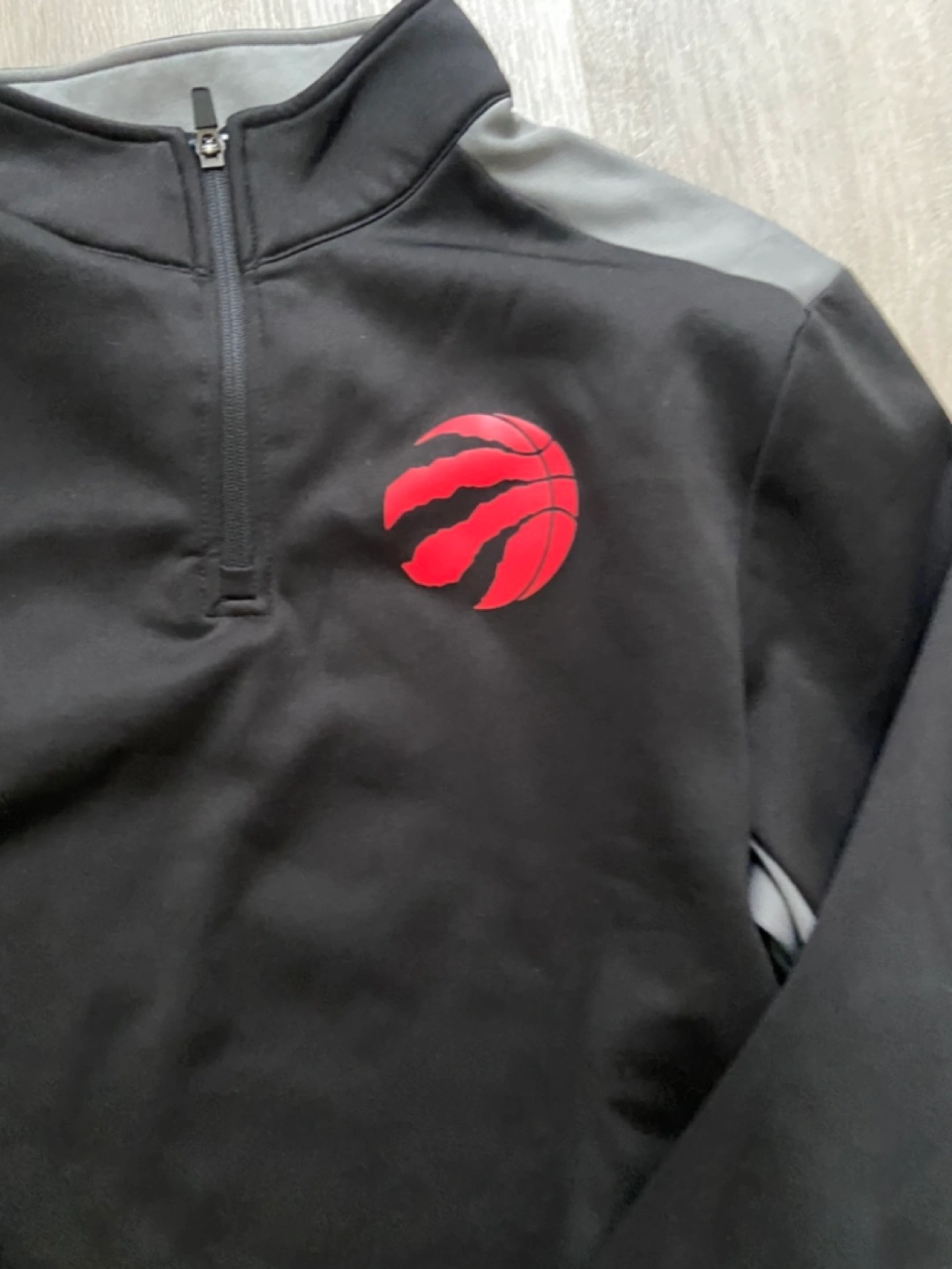 Black and grey 1/4 zip with Raptors logo. Long sleeves.