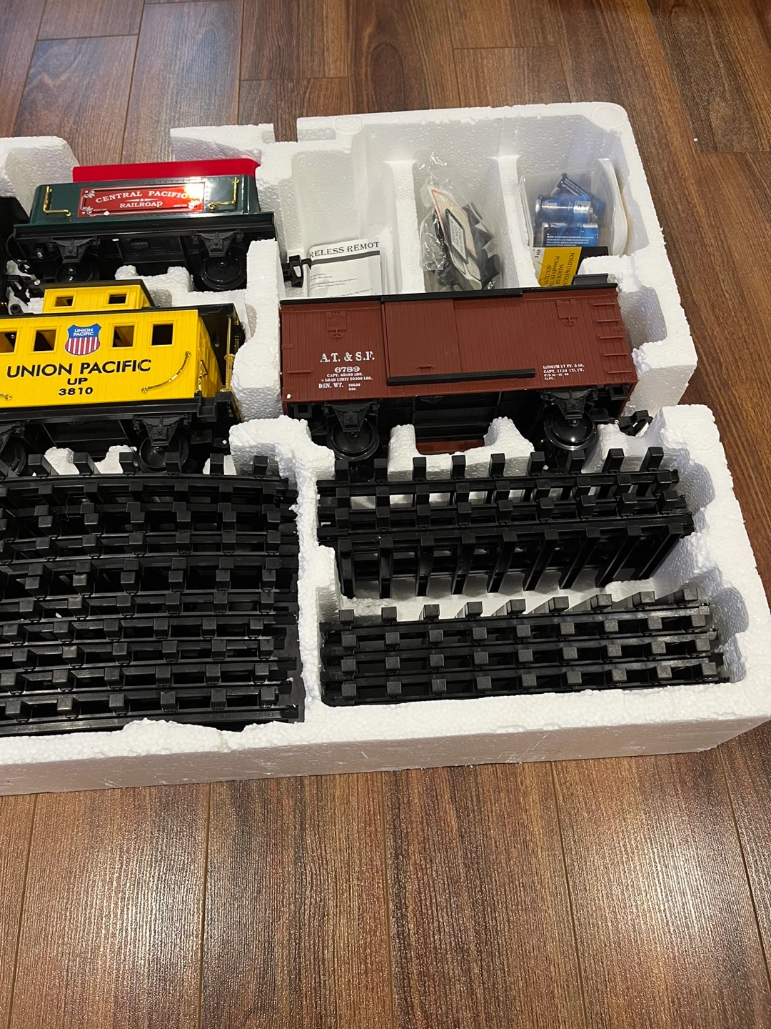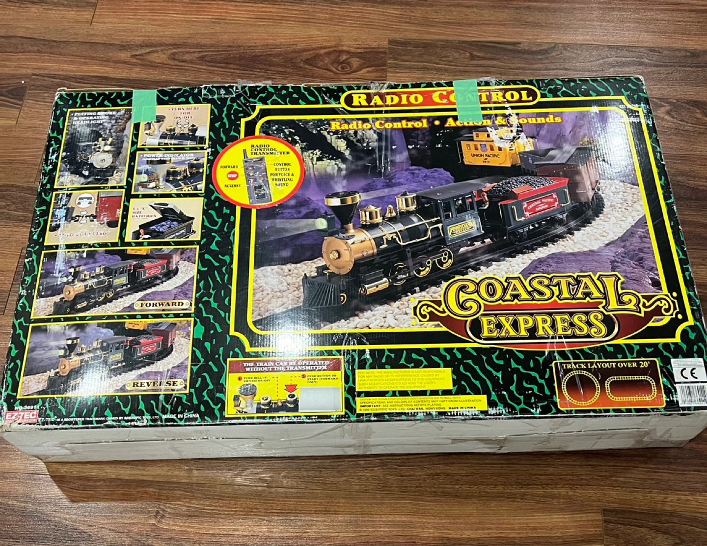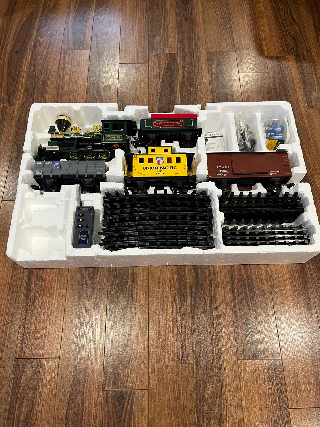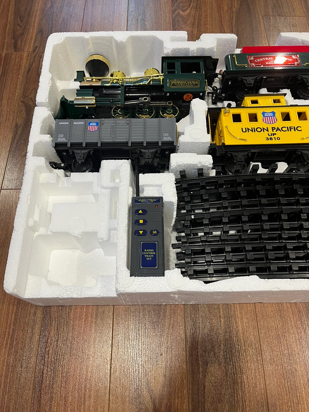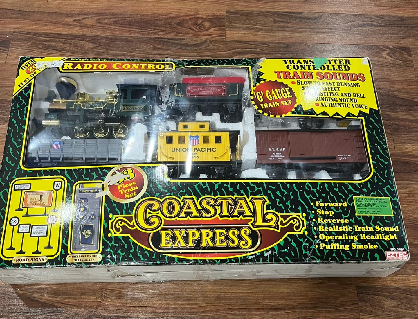 Pick up in Utopia, radio control train set, transmitter controlled train sounds, slow to fast running sound effect, whistling and bell ringing sound, goes forward, stops, reverses, headlight and puffs smoke. As per picture/video i used all the tracks for the oval layout, approximately 6 feet x 4 feet. The grey rail car, the gondola is missing 2 wheels that is why it is not on the moving train. Vintage, has instructions and batteries included. Approximately 40 years old.