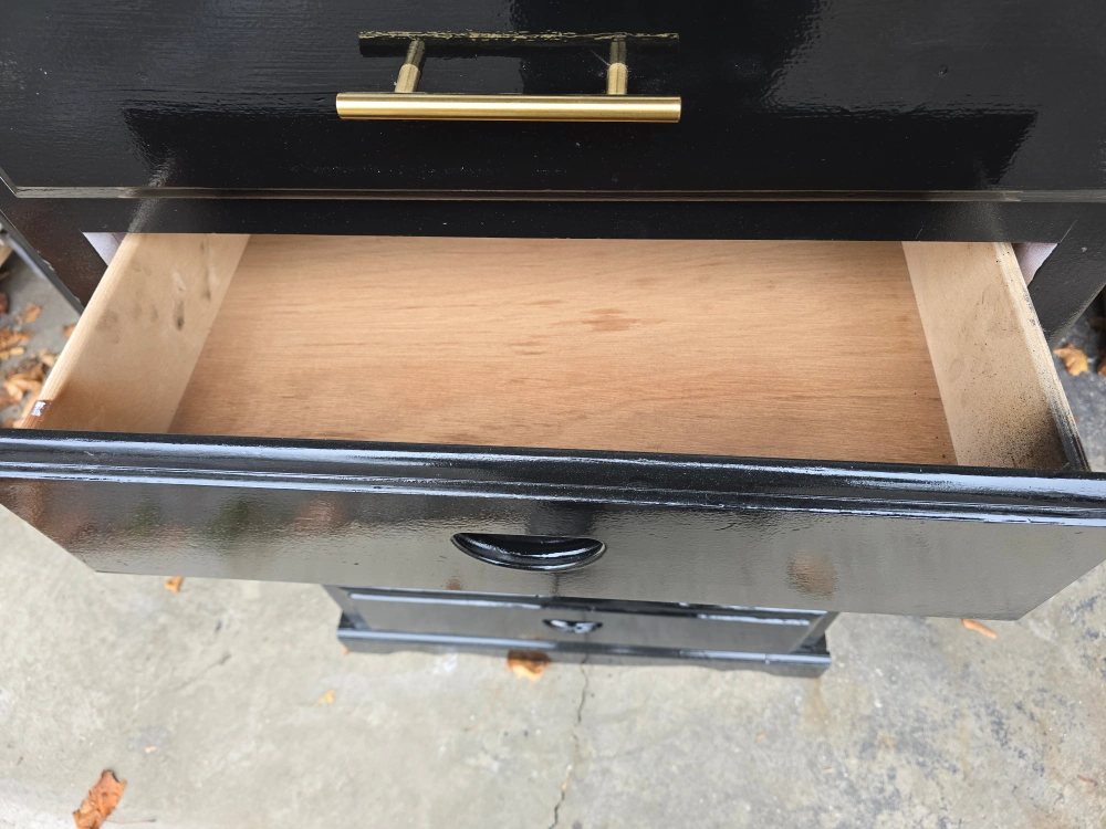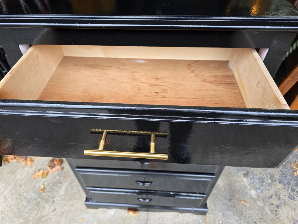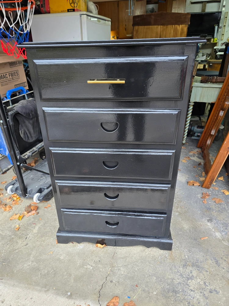 Five drawer dresser with black finish and gold handles. Drawers are in good condition.