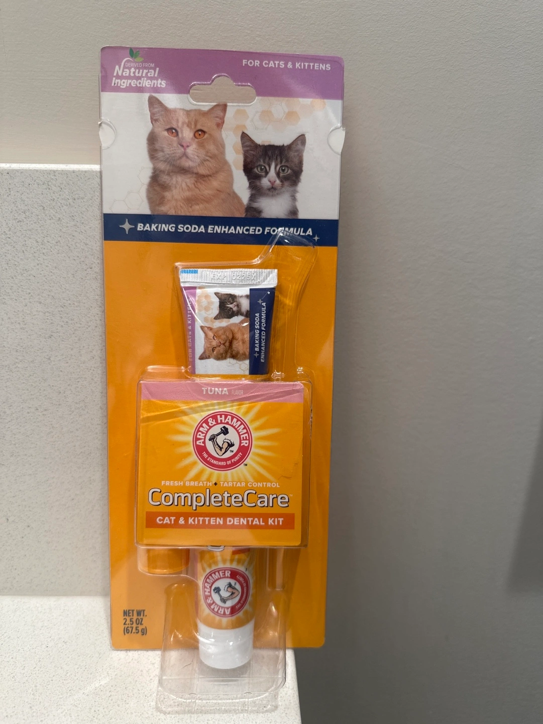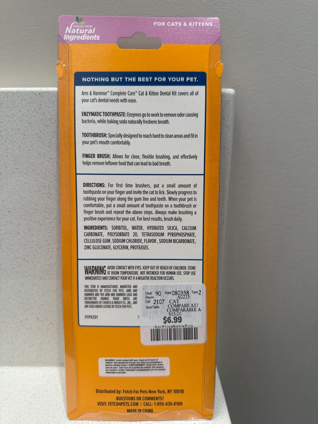 Baking soda enhanced formula. Includes finger brush, and toothpaste.
