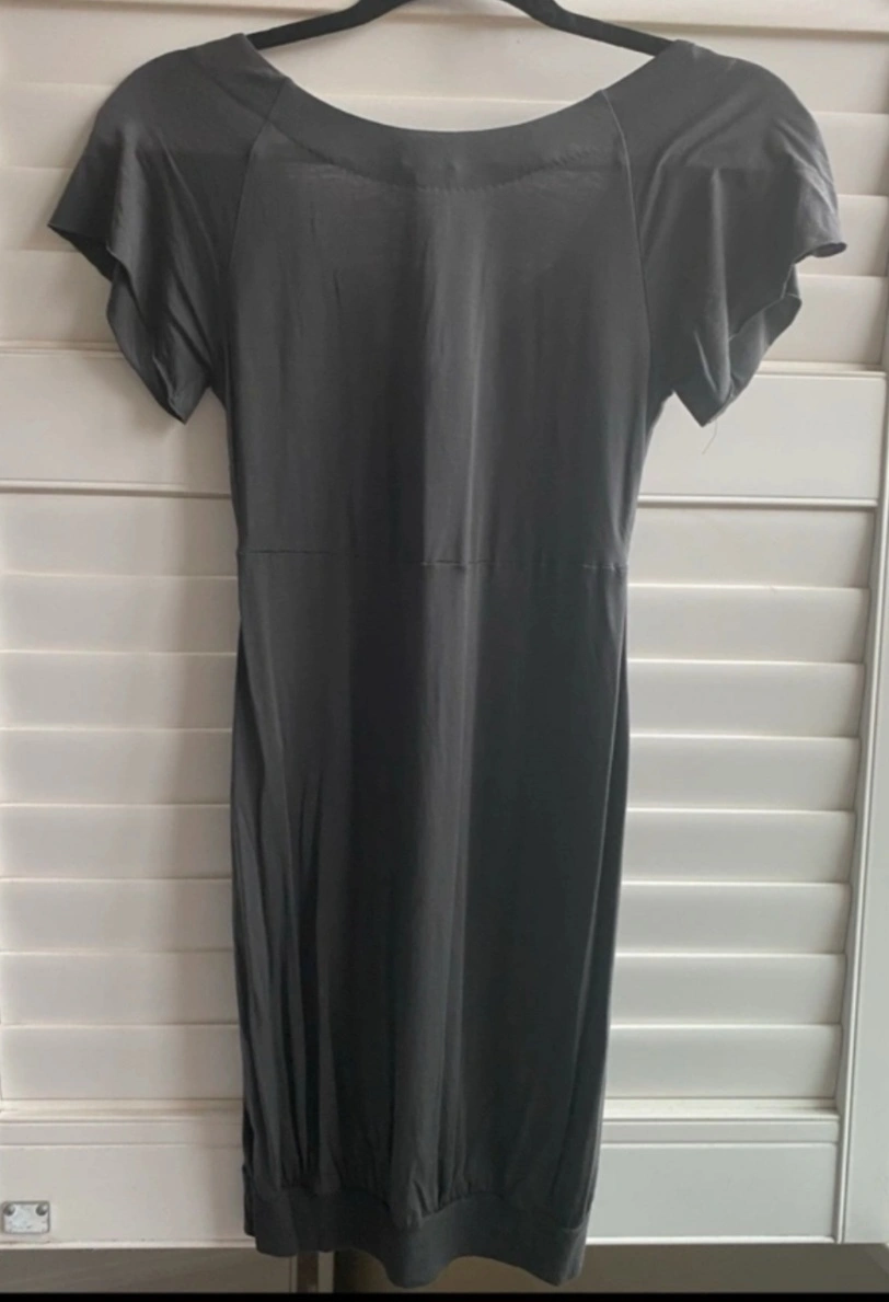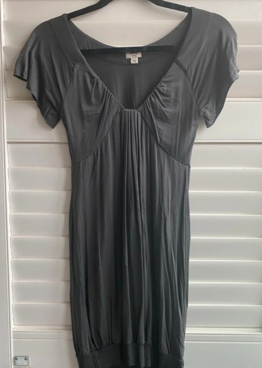 Grey short-sleeved mini dress, scoop neck. Also have this in Black, same size. Made of a soft material with a gathered bodice and a stretchy, fitted skirt. Size Small. Helping a friend sell her dress. See my other listings.
