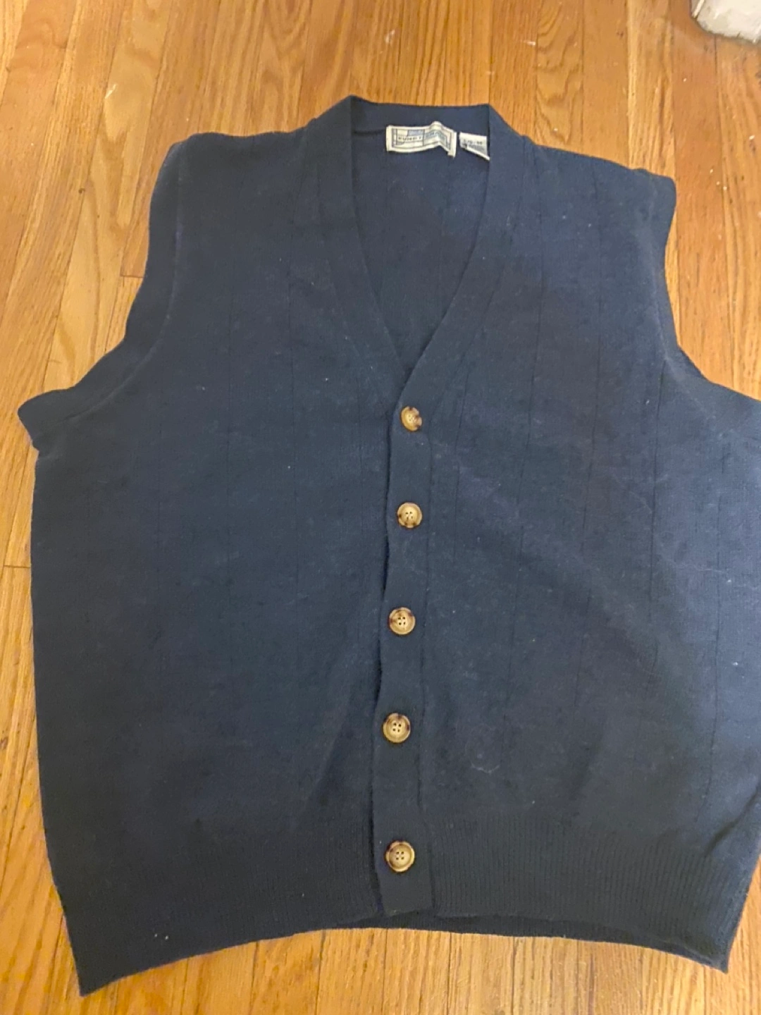 Men's v neck blue vest with buttons. 70% lambswool 30% polyester
