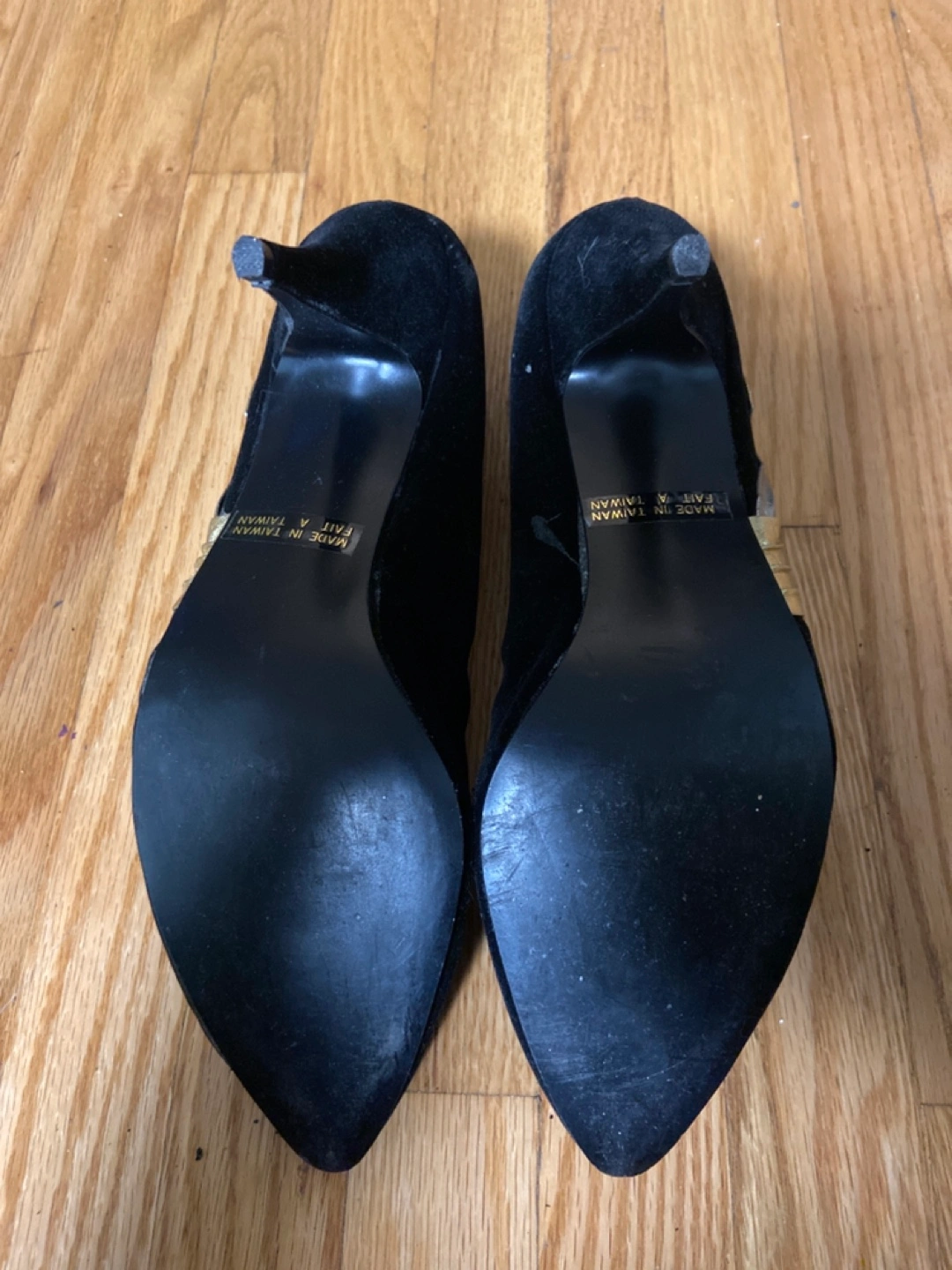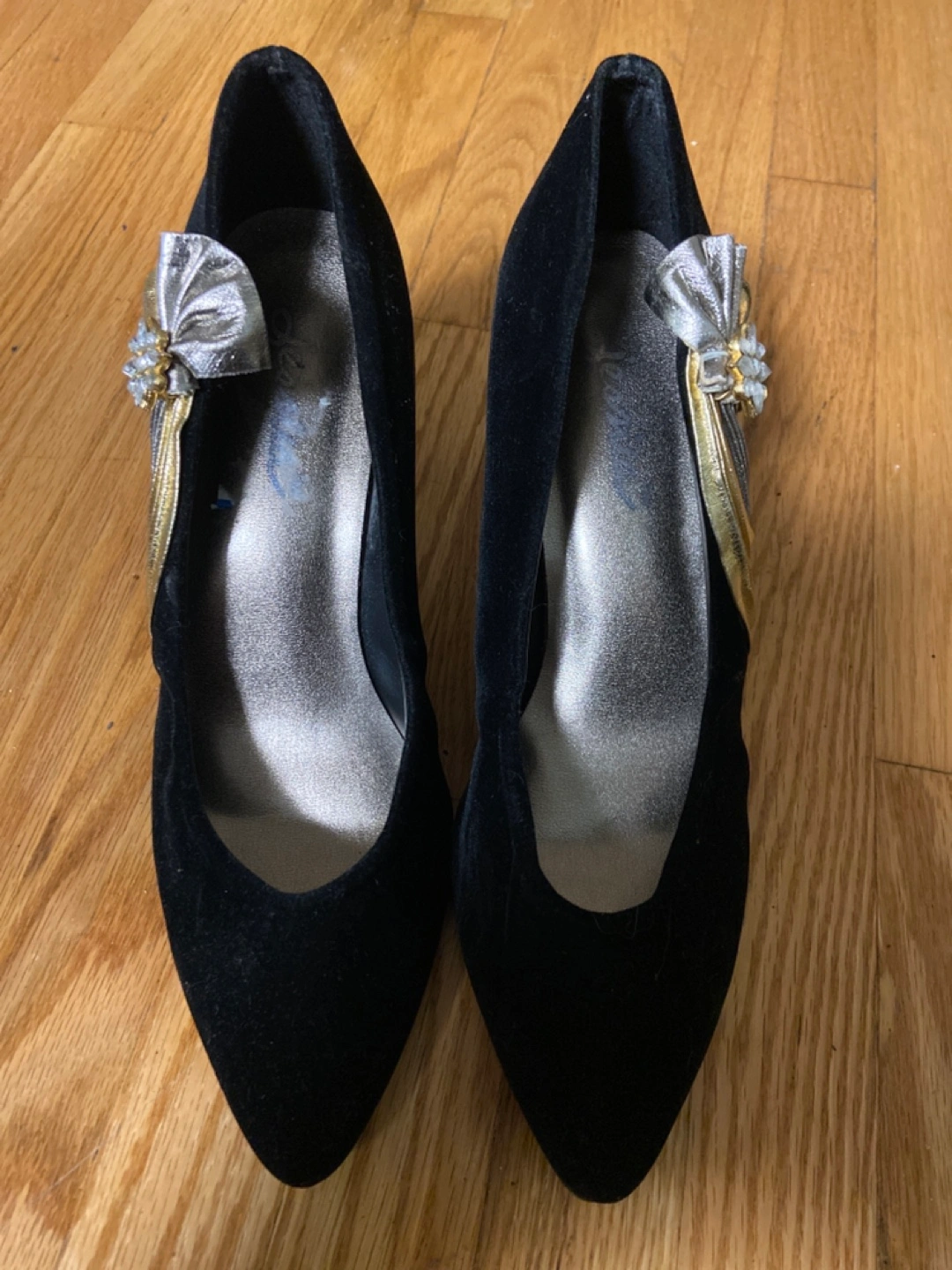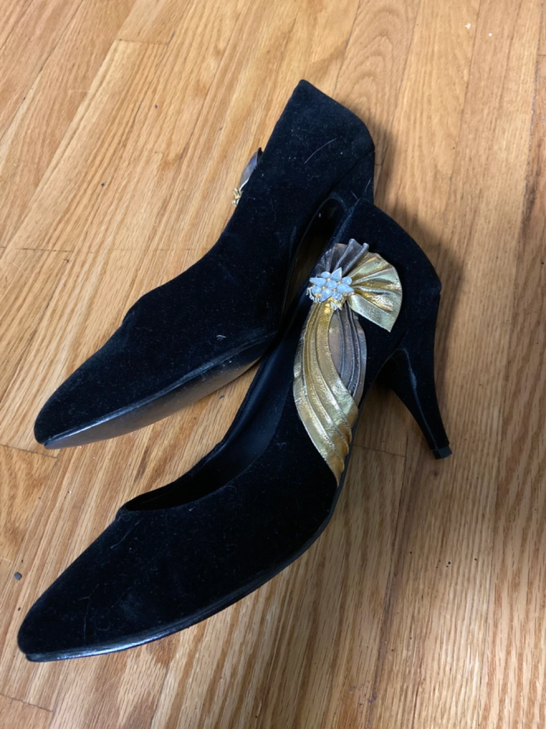 Size 8M black velvet heels with a gold bow detail. Made in Taiwan. Asking $15 or best offer