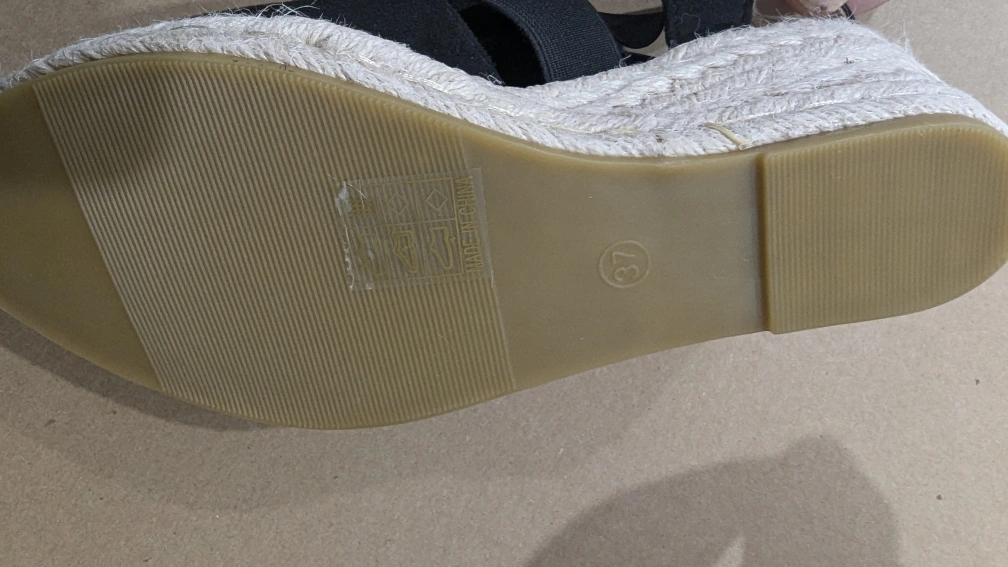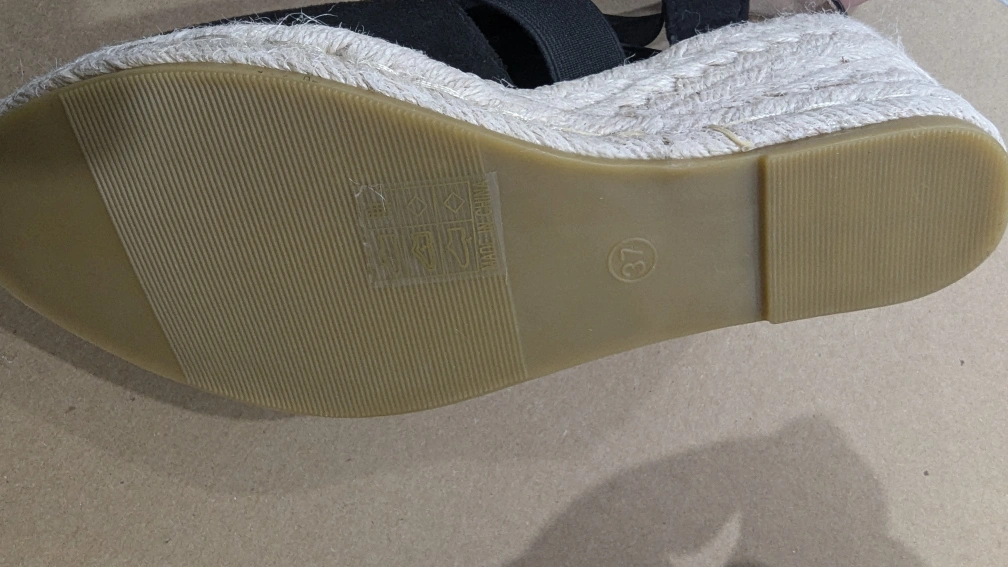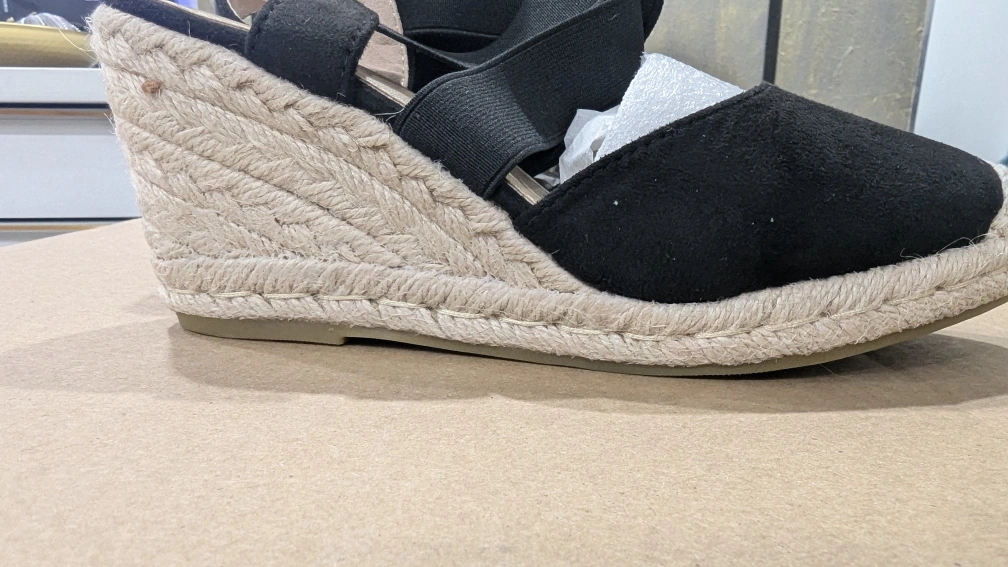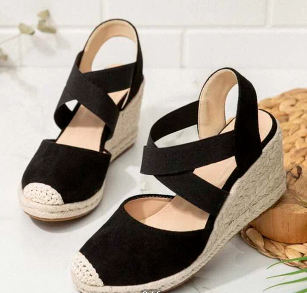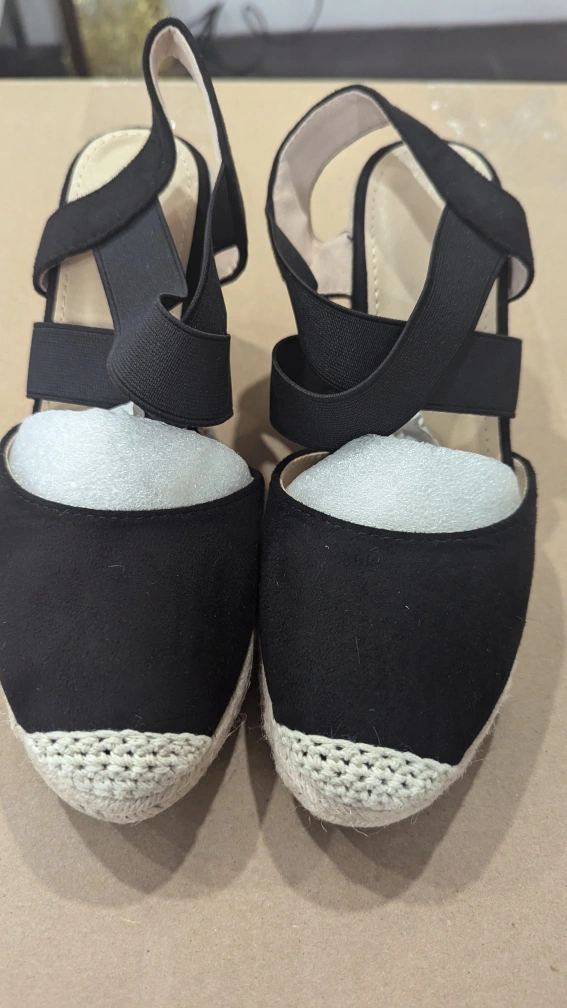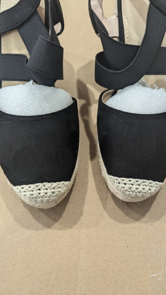 Women's Peep Toe Espadrille Sandals With Suede Fabric And Jute Rope Wedge HeelBlack suede wedge sandals with elastic straps. Size 37