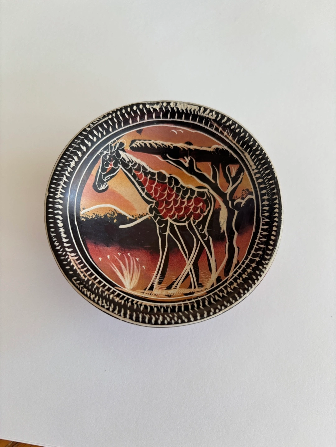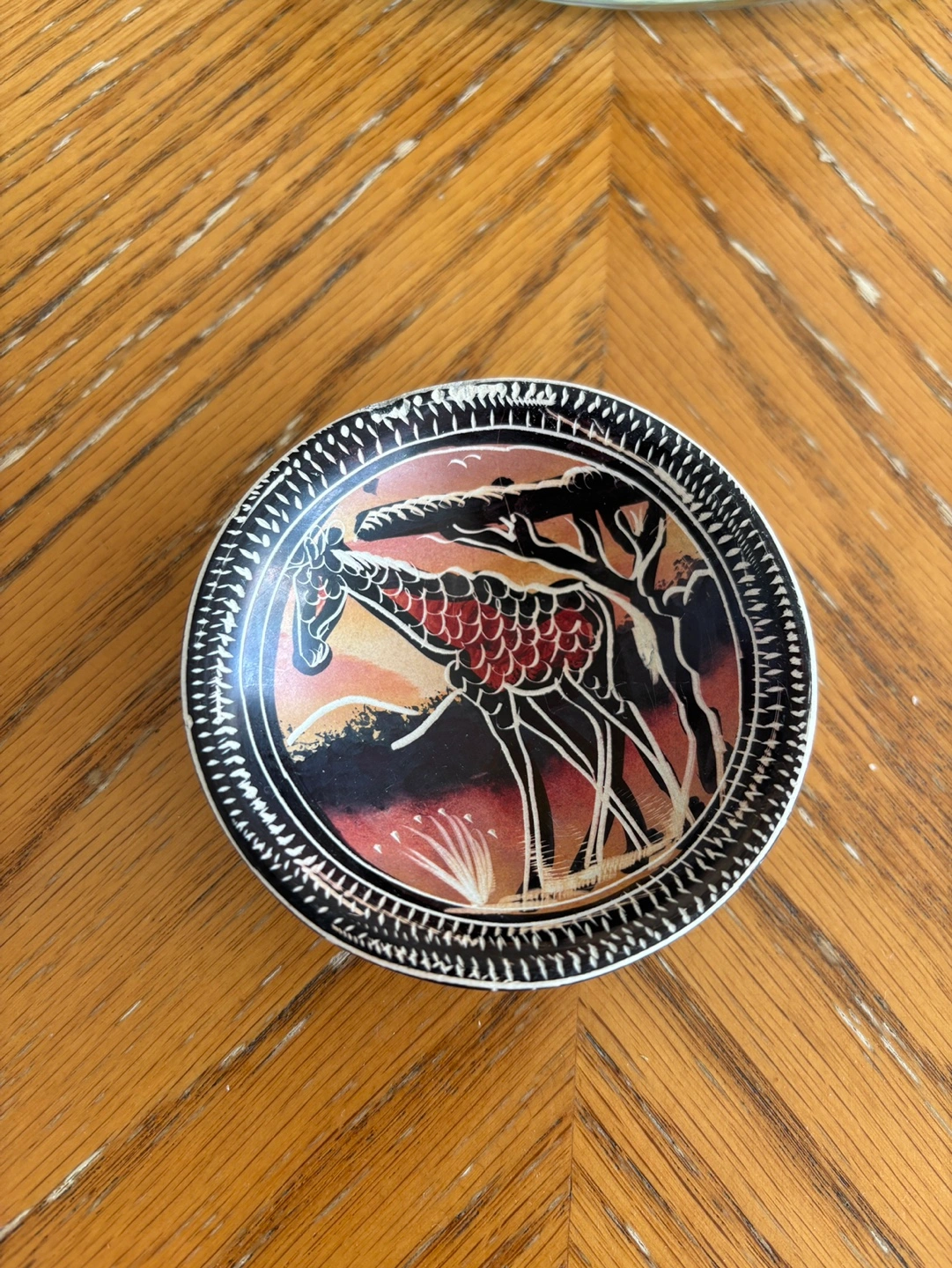 Small African stone dish with warm colour tone and sunset tundra and giraffe design. Approximately 7.5 cm in diameter. Can be used as bedside table decor and for small jewelry such as rings!! I’m available to answer any questions :) Open to bundle deals! Cash only. Pick up at RBC Bathurst and Sheppard or see my bio for other location options!