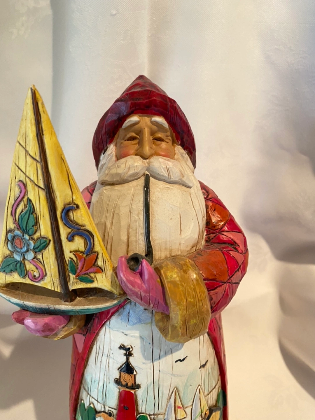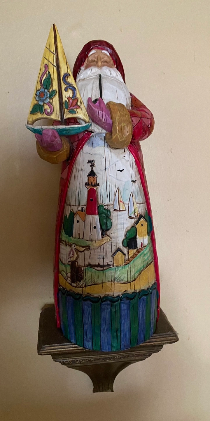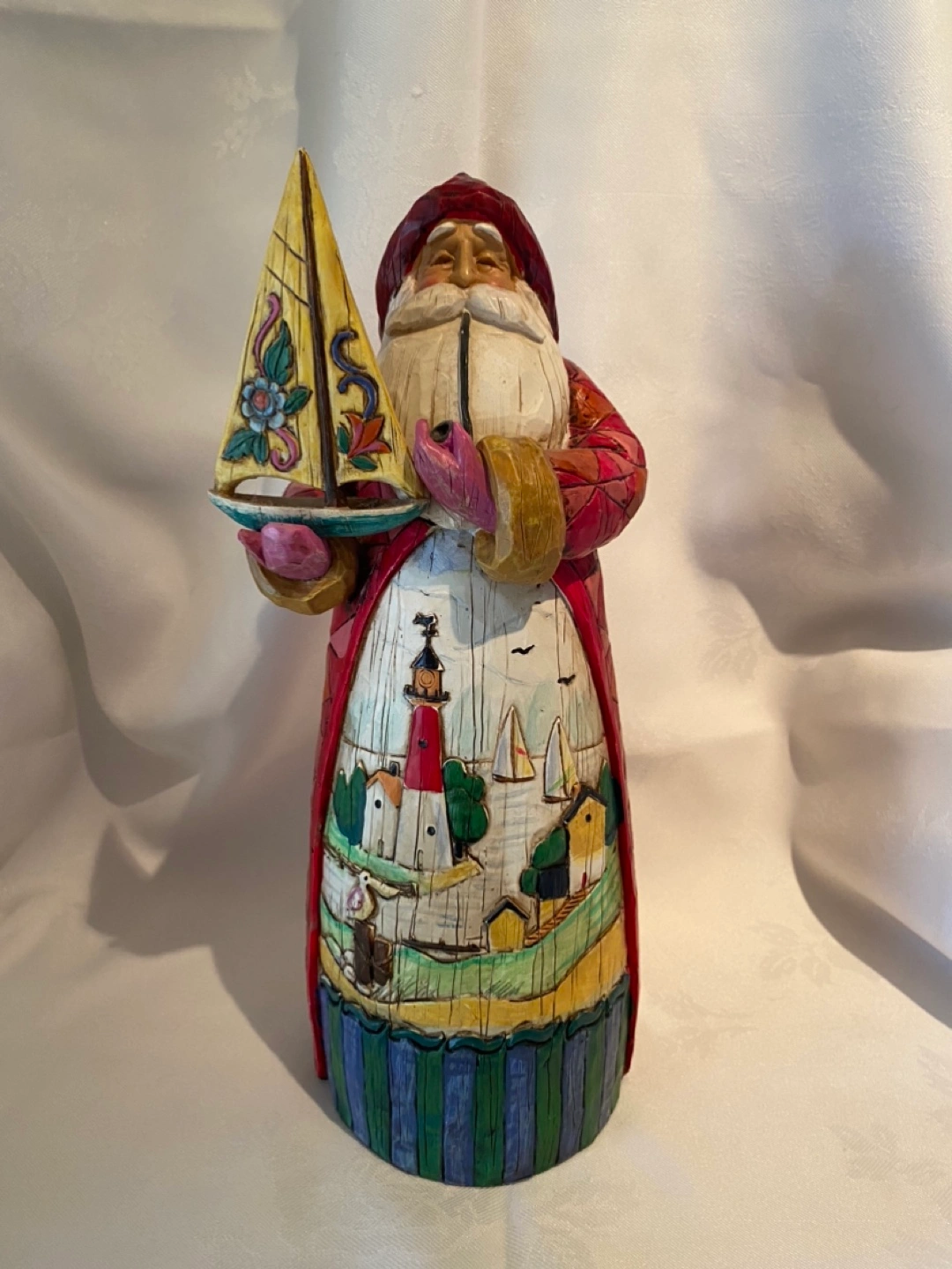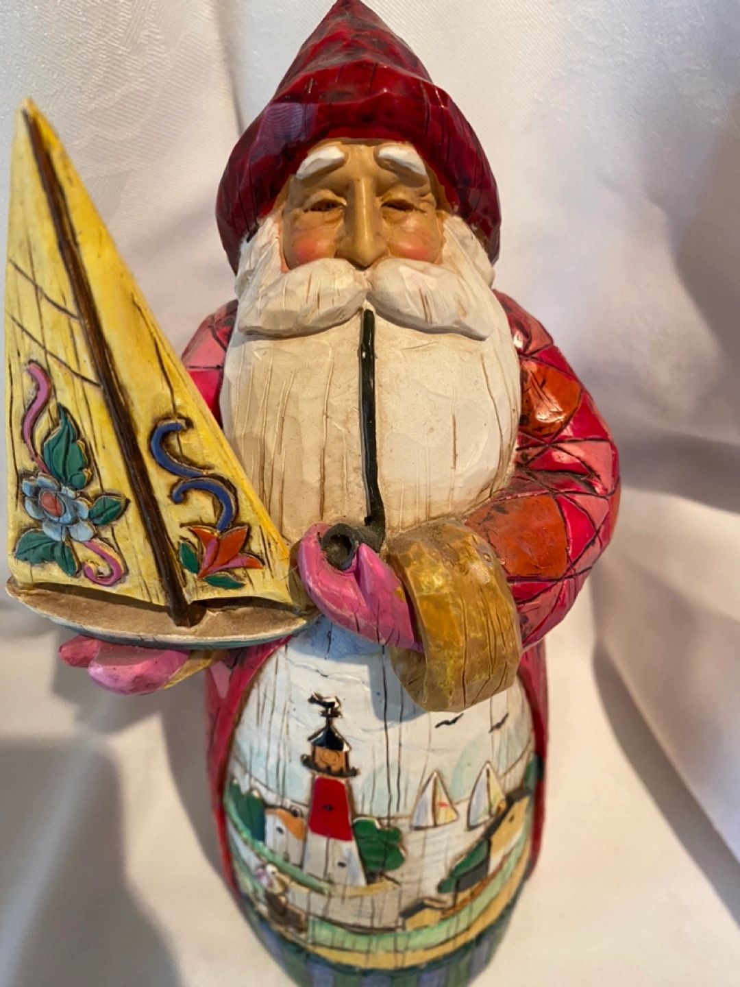 Santa figurine with red and orange plaid coat holding a sailboat. A seaside town scene is on the front. 12 inches tall. Great addition to your Christmas decorations. Has a nice solid weight. Eglinton West , Dufferin Area. Toronto