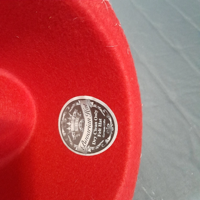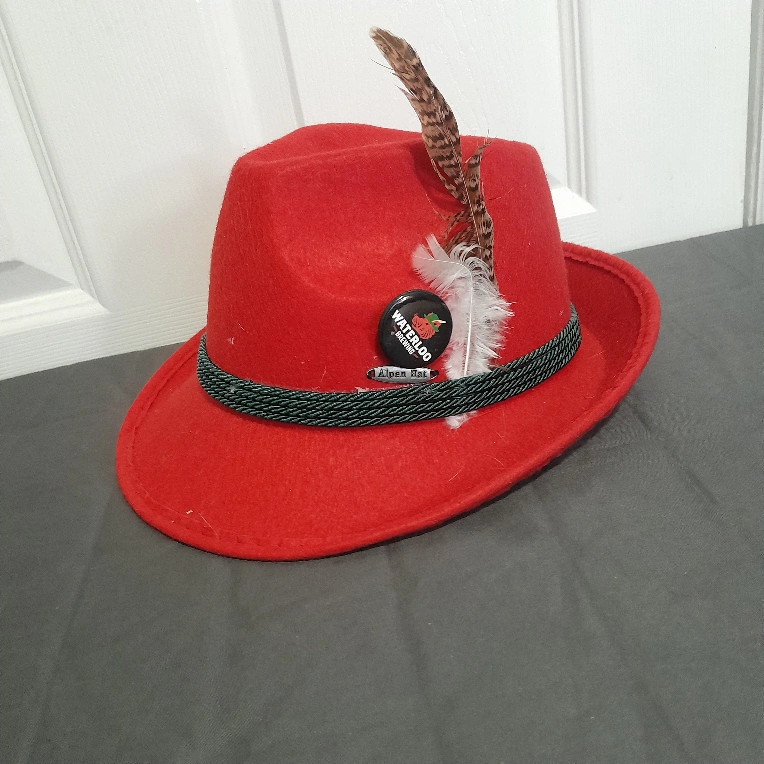 Red hat with a black braided band. The hat has a feather on the side and a metal pin with the words "Alpen Hut" on it. The hat is labelled as "Bavarian Hut" and has a dry clean only label.