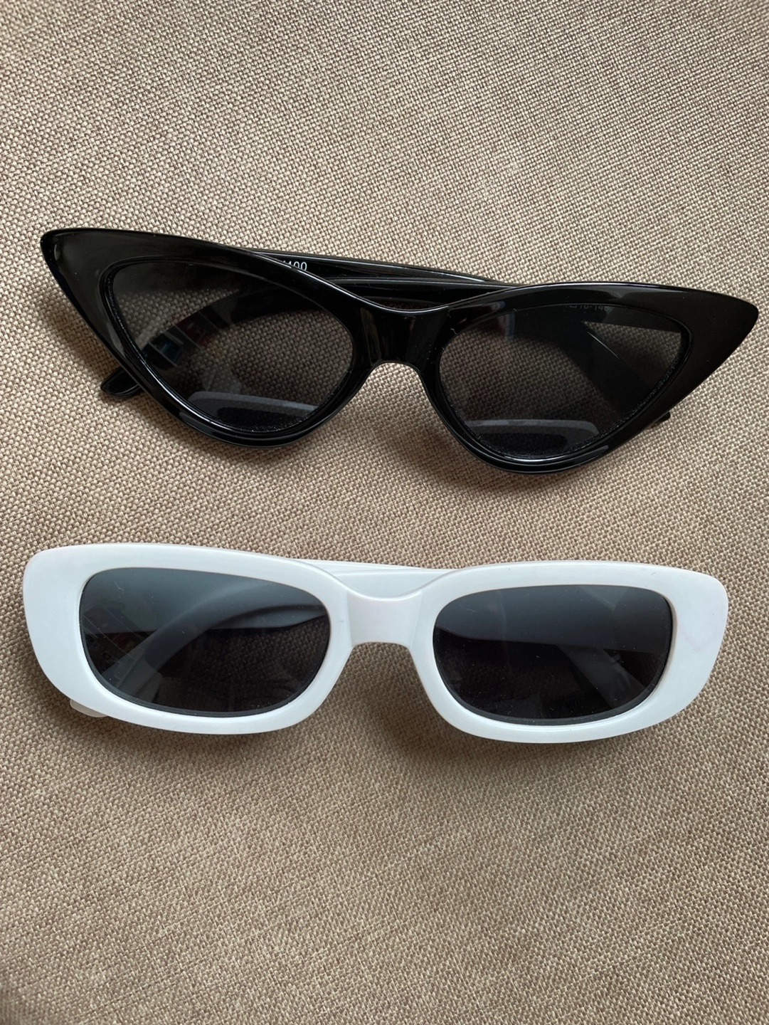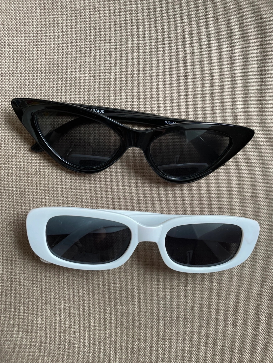 Two pairs of sunglasses, one black and one white. Both have dark lenses. Great condition.