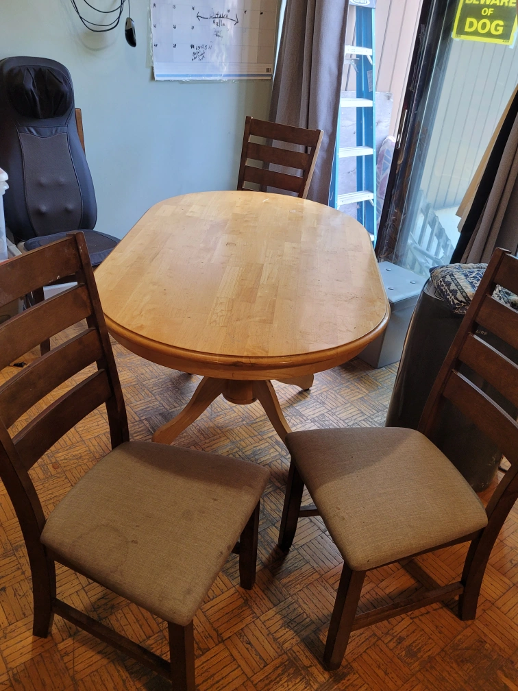 Oval table beige in color... pedalstal style base.. Oak Table. Dinning room table....No chairs.