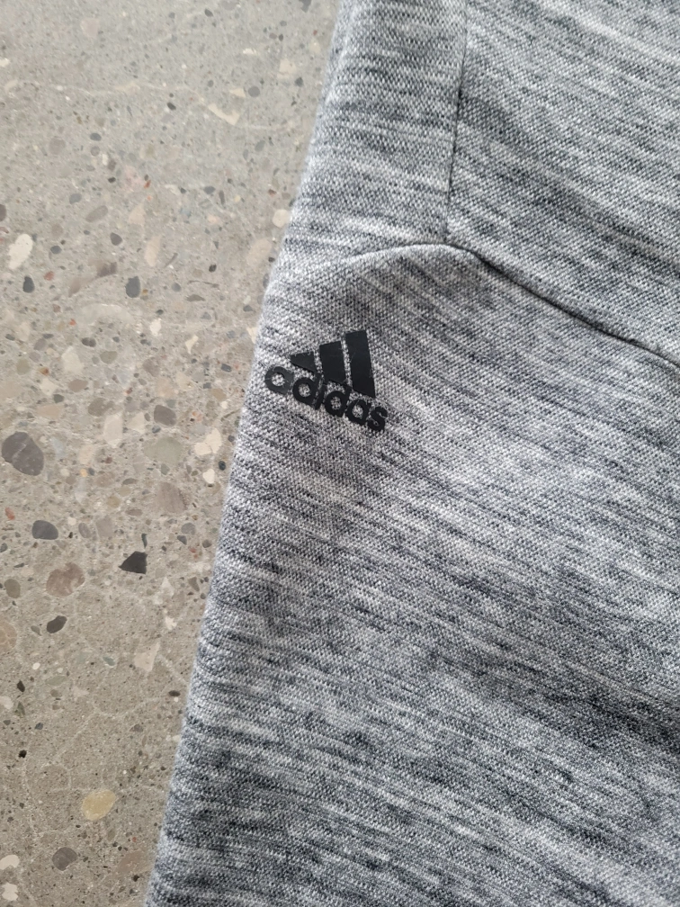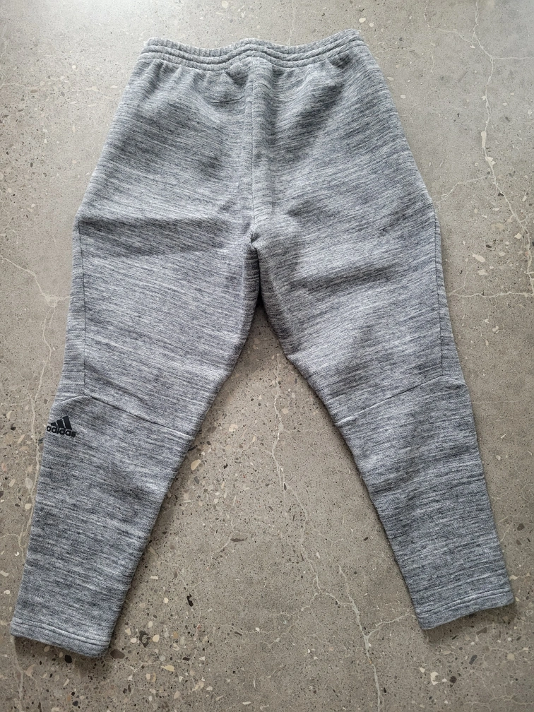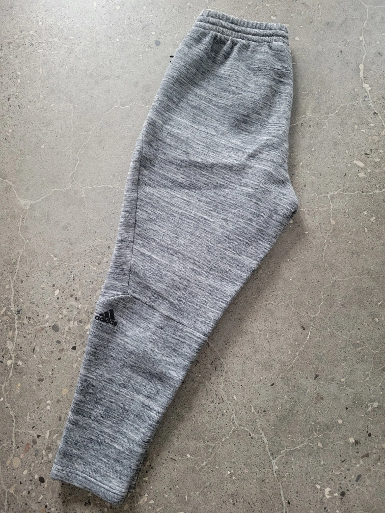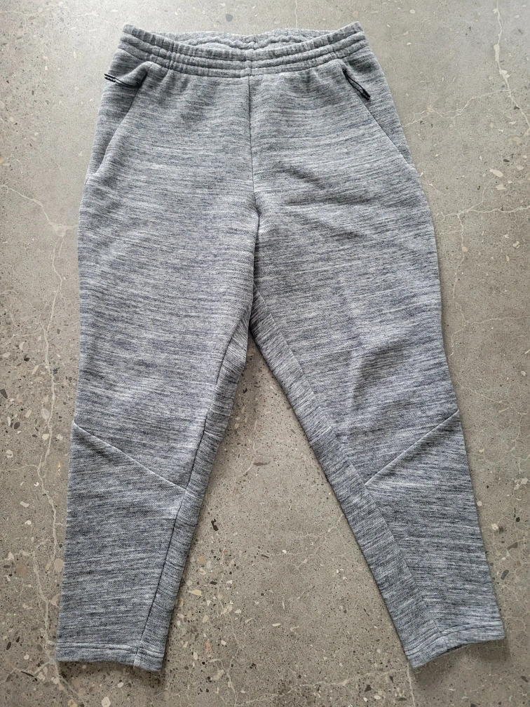 Grey jogger pants with black stitching, elastic waistband, and pockets.